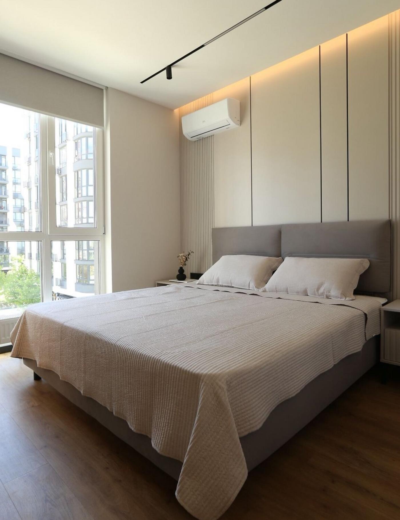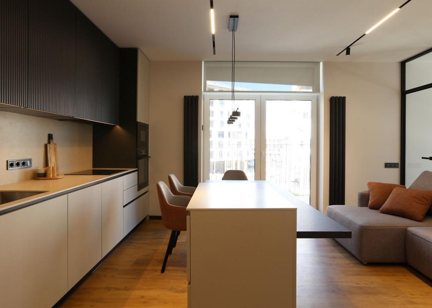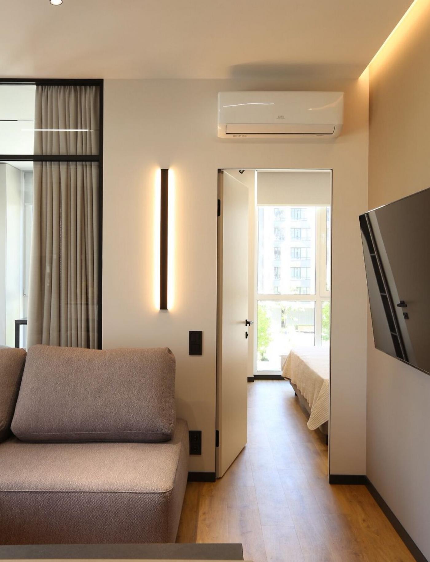 Квартира має авторський дизайн-проєкт та якісний ремонт. Вона повністю укомплектована всіма необхідними меблями та технікою, включаючи два розкладні дивани, двоспальне ліжко, три кондиціонери та пральну машину з сушкою.