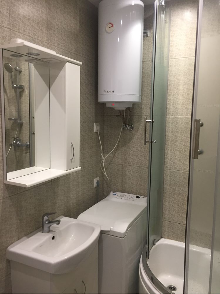 Простір організовано з урахуванням щоденних потреб: кухня — 6 м2, санвузол обладнаний скляною душовою кабіною, на підлозі — ламінат. У кімнаті — зручний кутовий диван, кухня повністю укомплектована.