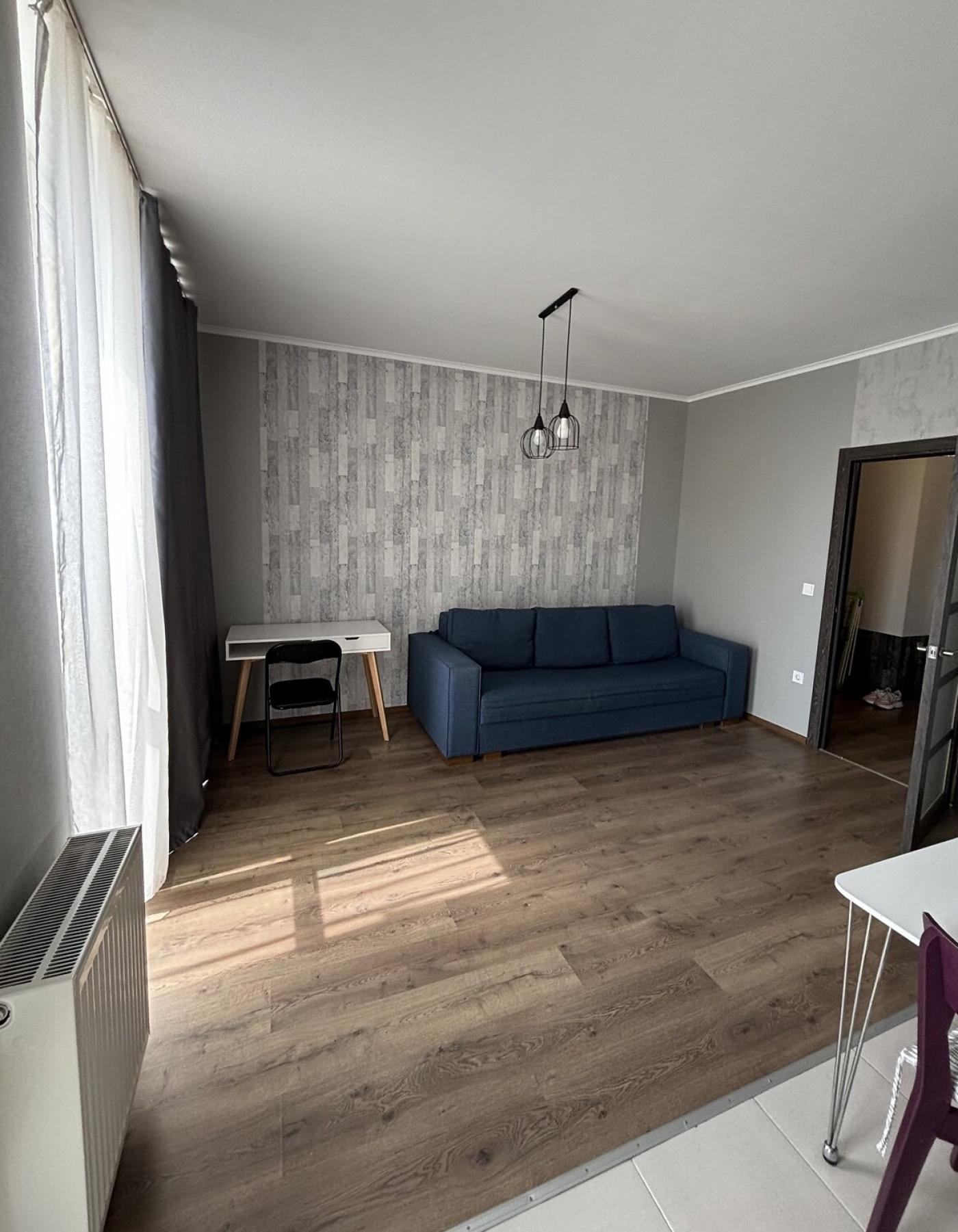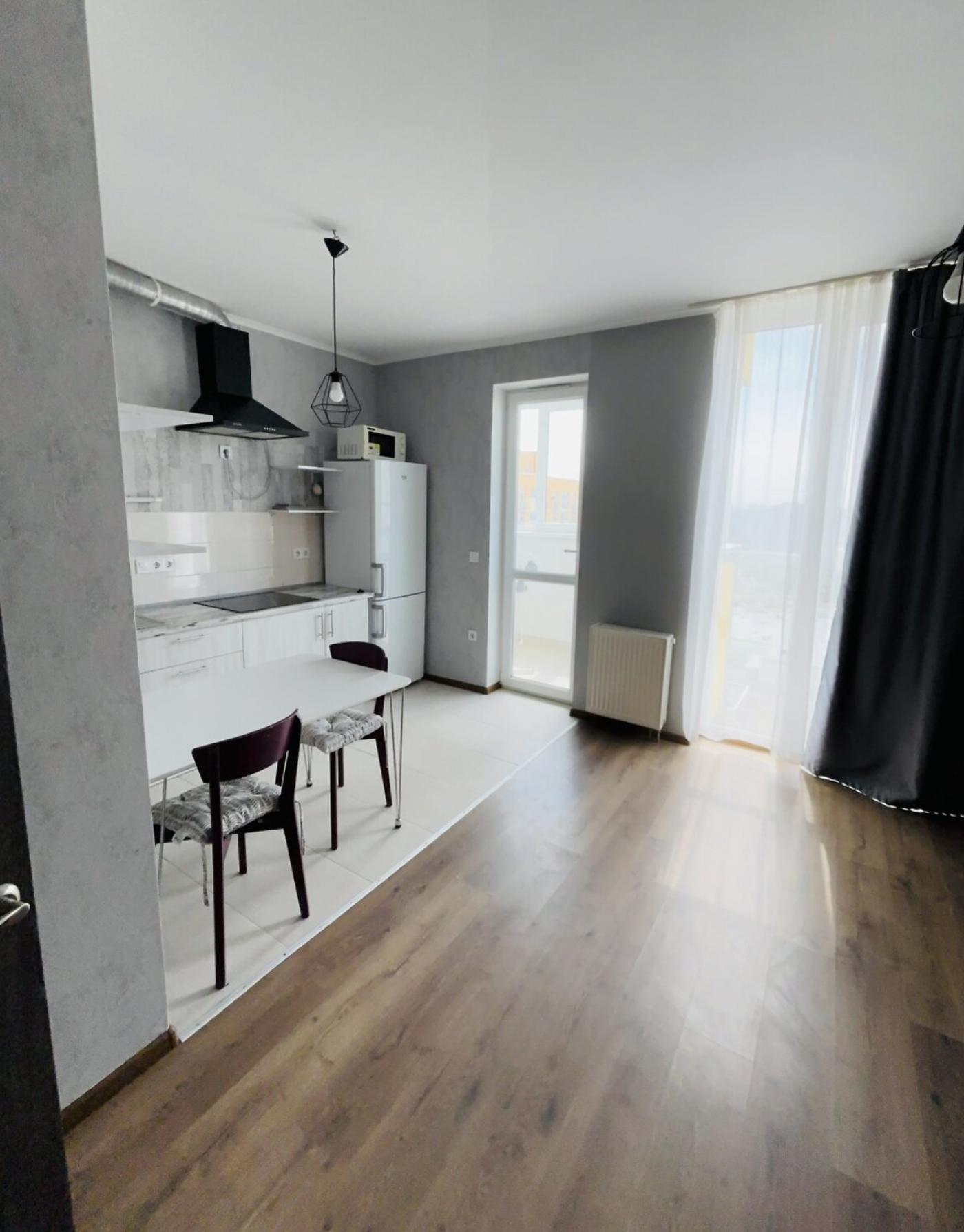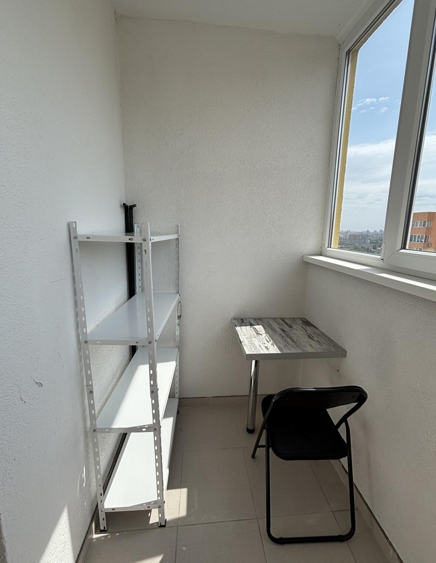 У квартирі виконаний якісний ремонт: на стінах — шпалери, на підлозі — ламінат. Простора кімната-студія (19 м2) повністю укомплектована всіма необхідними меблями та технікою, включаючи повноцінний двоспальний диван, письмовий стіл, кухонні меблі, новий бойлер та пральну машину. Також є просторий балкон та великий санвузол (4,5 м2).