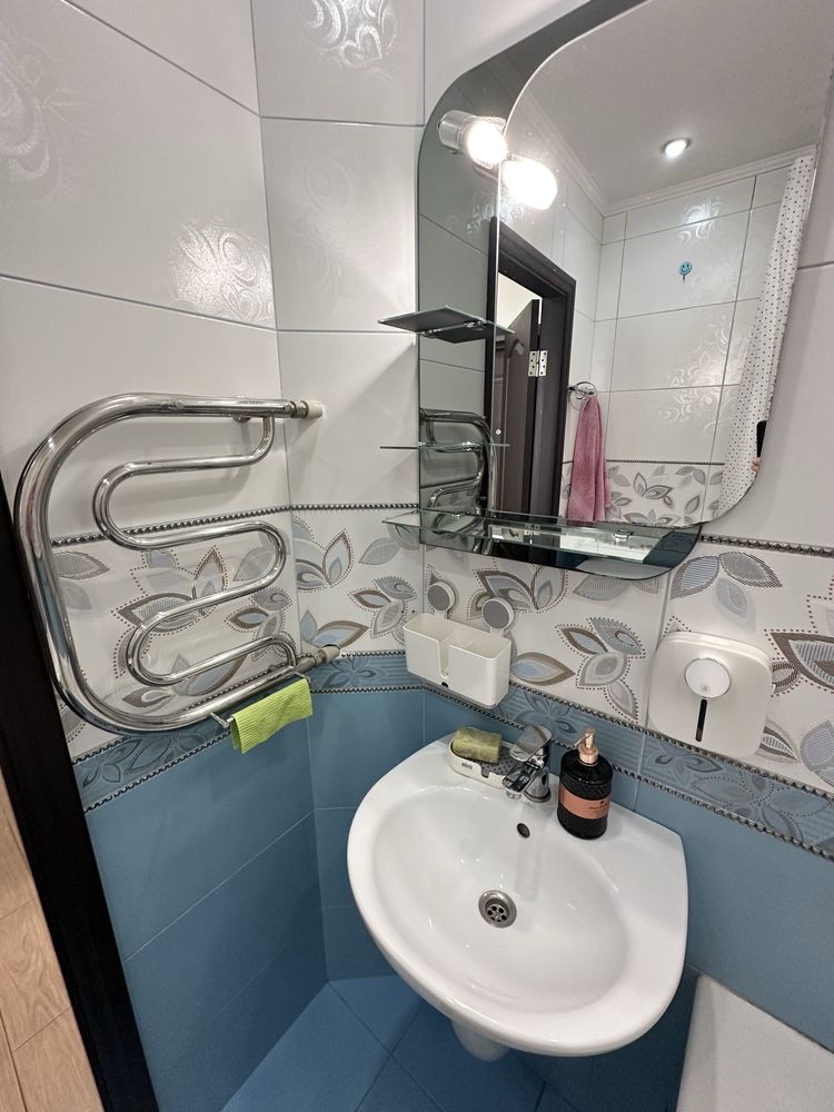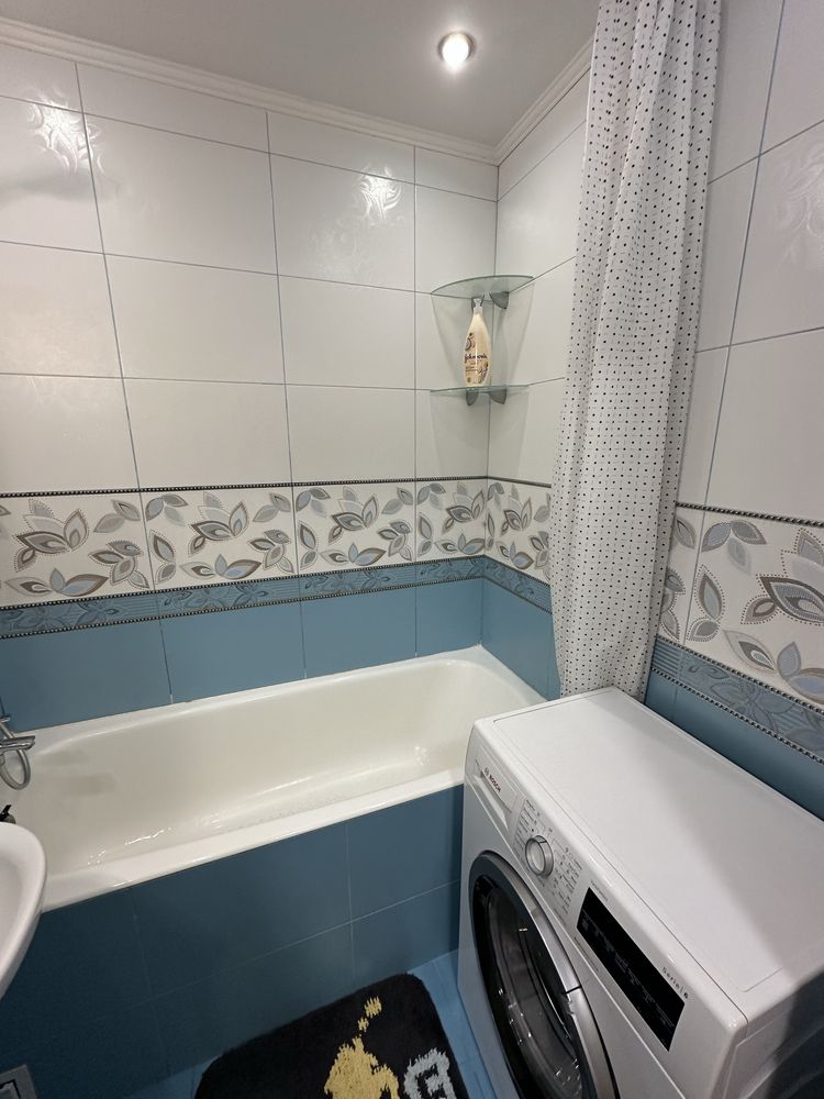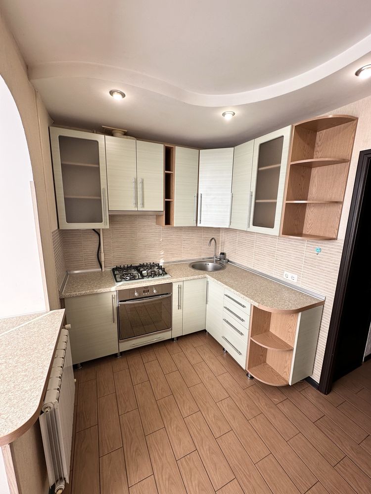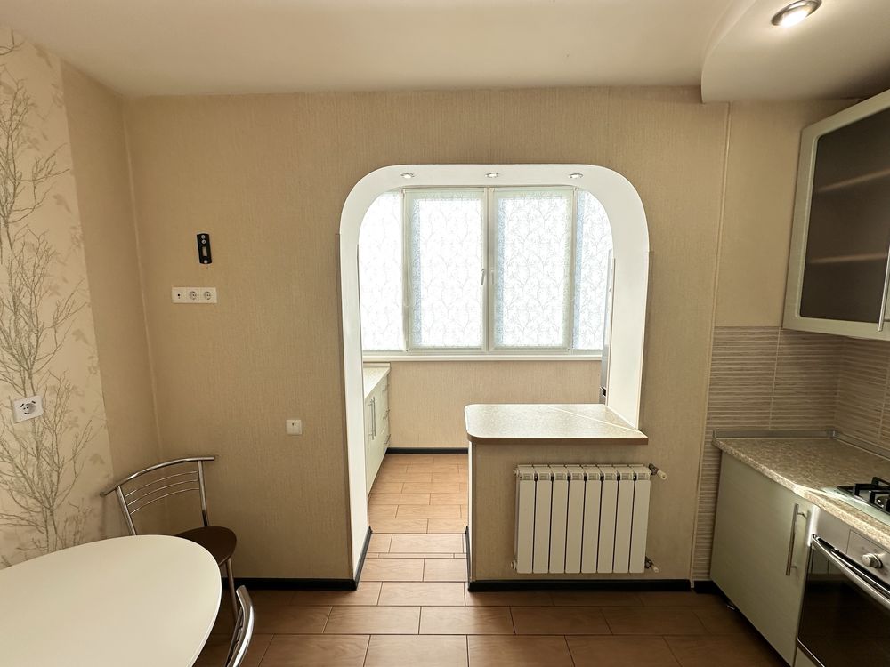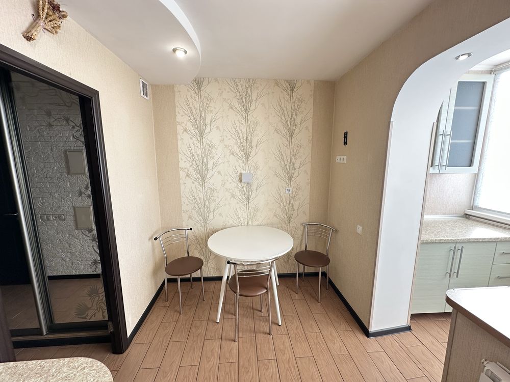 Квартира має гарний стан. На підлозі укладений ламінат, на стінах — шпалери. Санвузол окремий, з ванною та оздоблений плиткою. Особливою перевагою є зручне зонування: кухня поєднана з лоджією, створюючи окрему обідню зону.