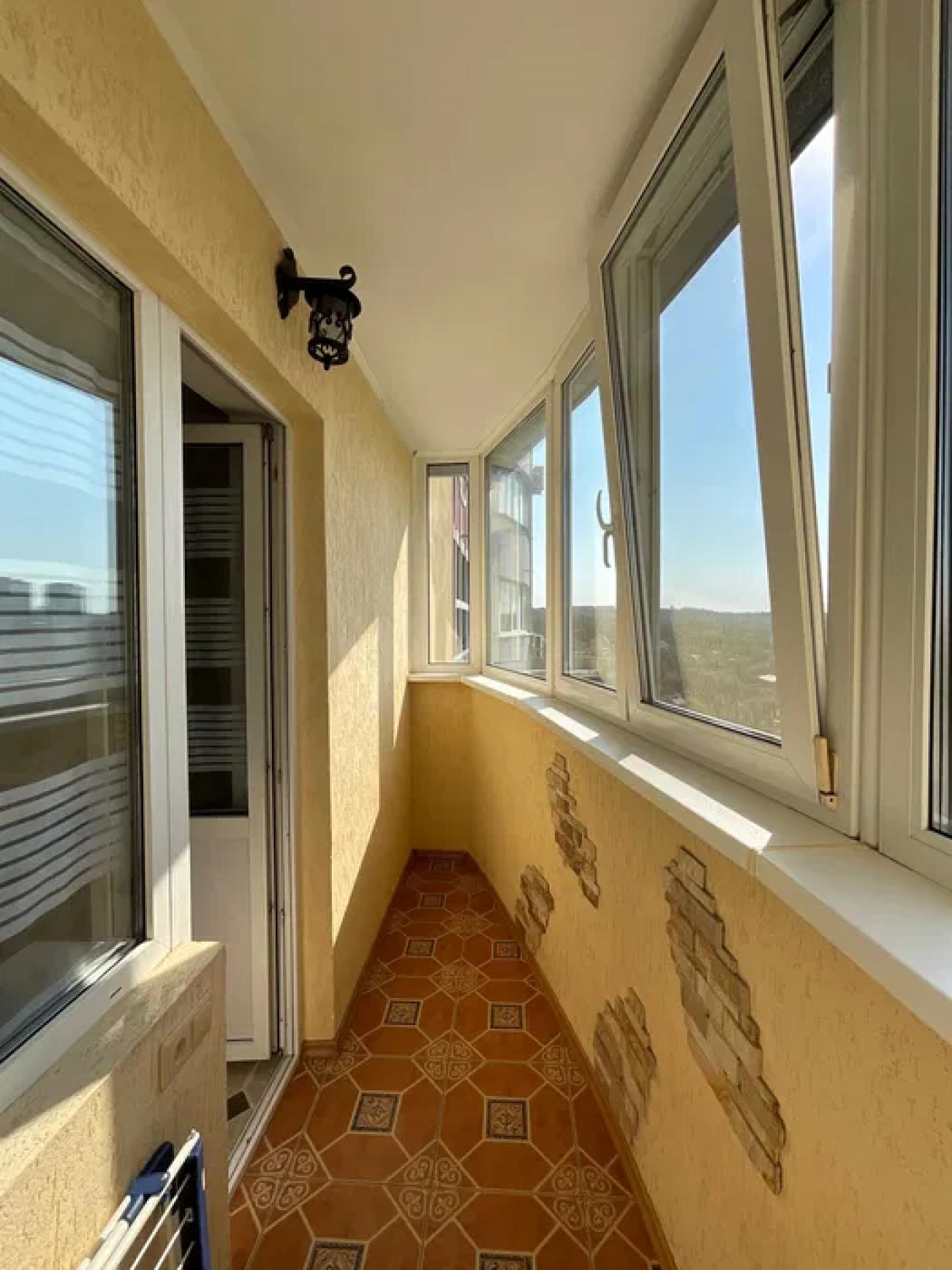 Оселя розташована на середньому поверсі, має балкон і вікна з прямим видом на озера та зелені алеї Голосіївського парку — справжні «легені» міста, які щодня дарують спокій і натхнення.