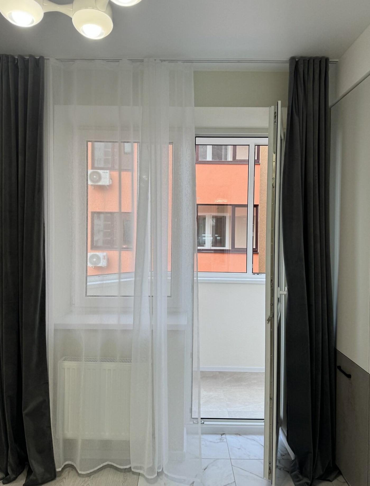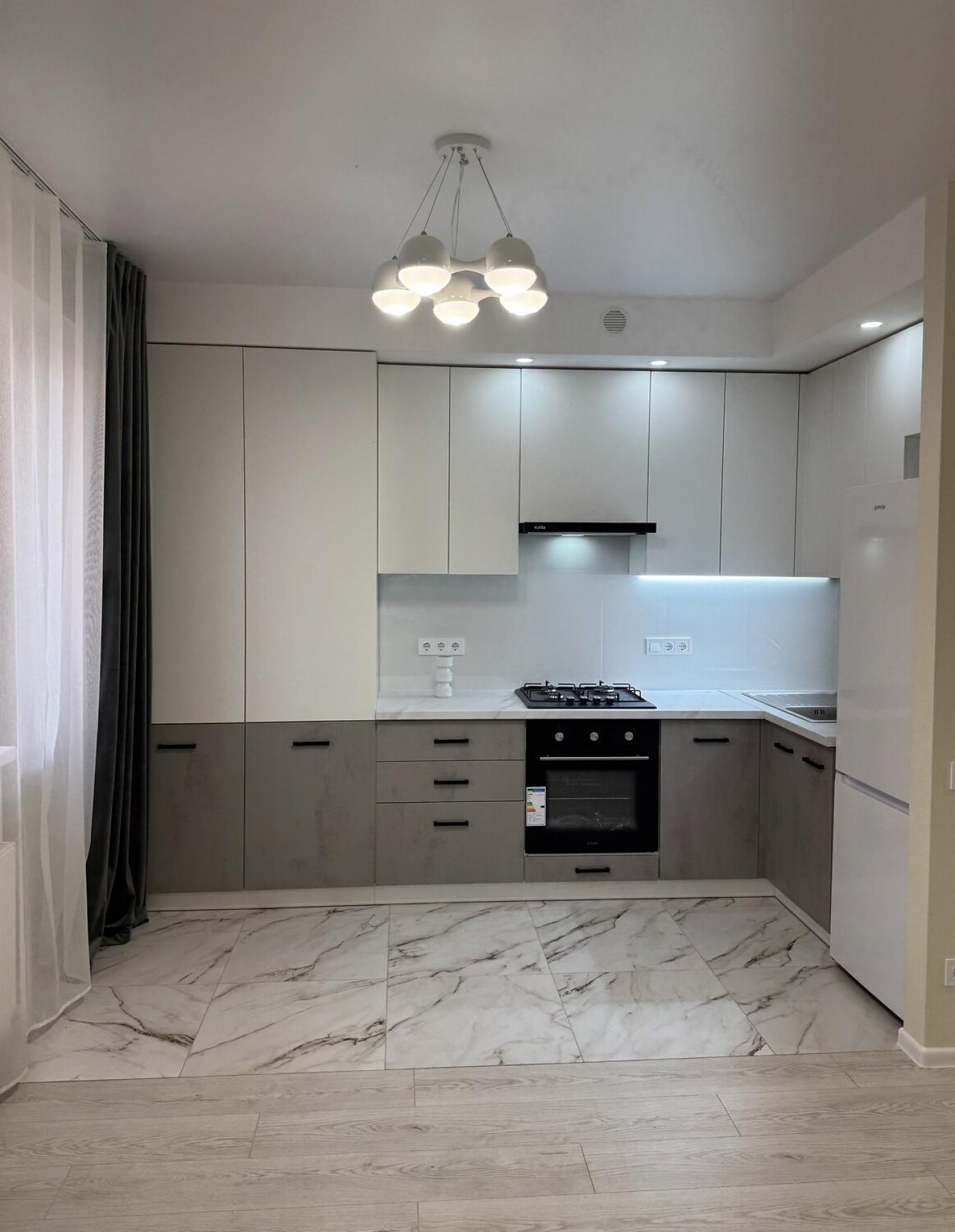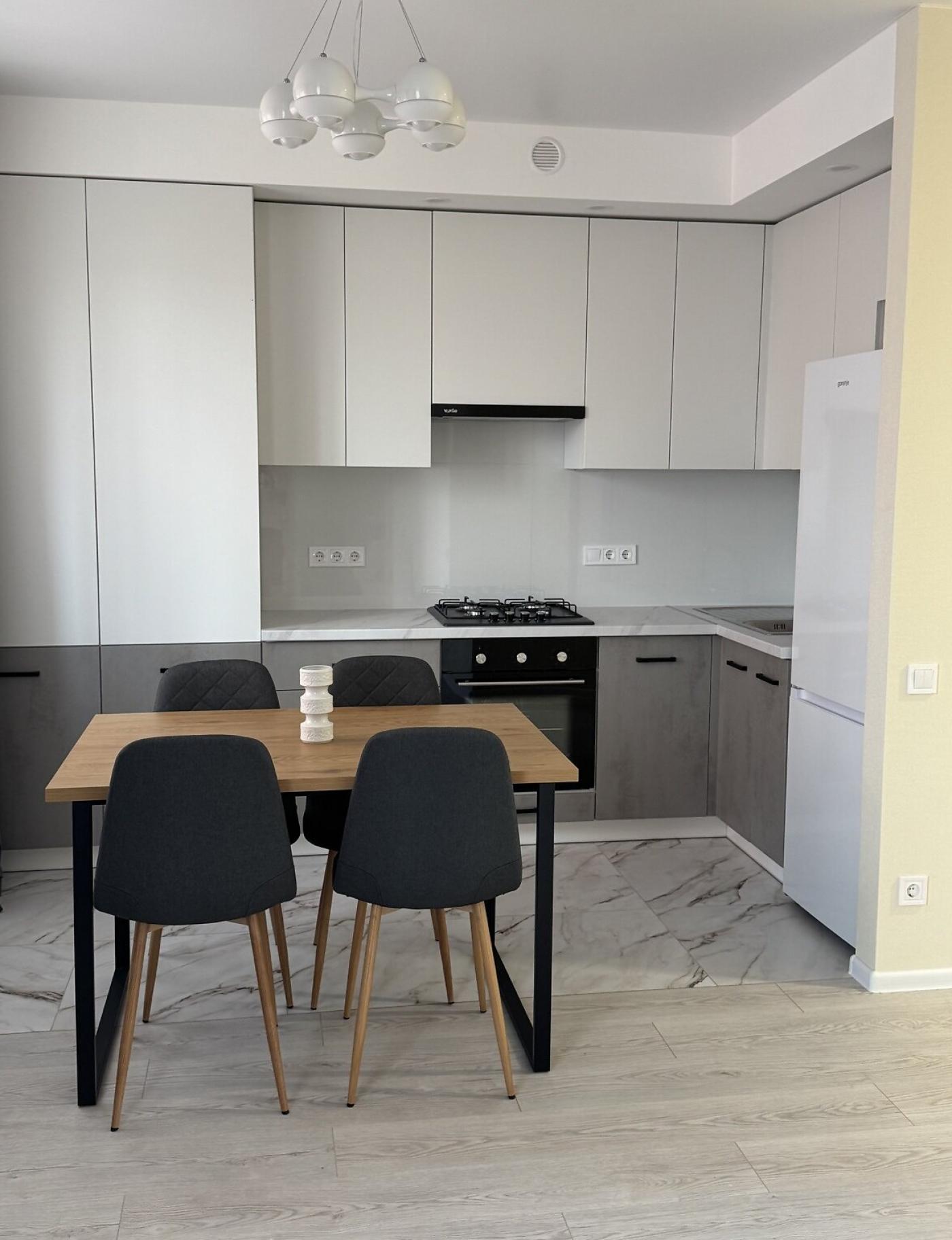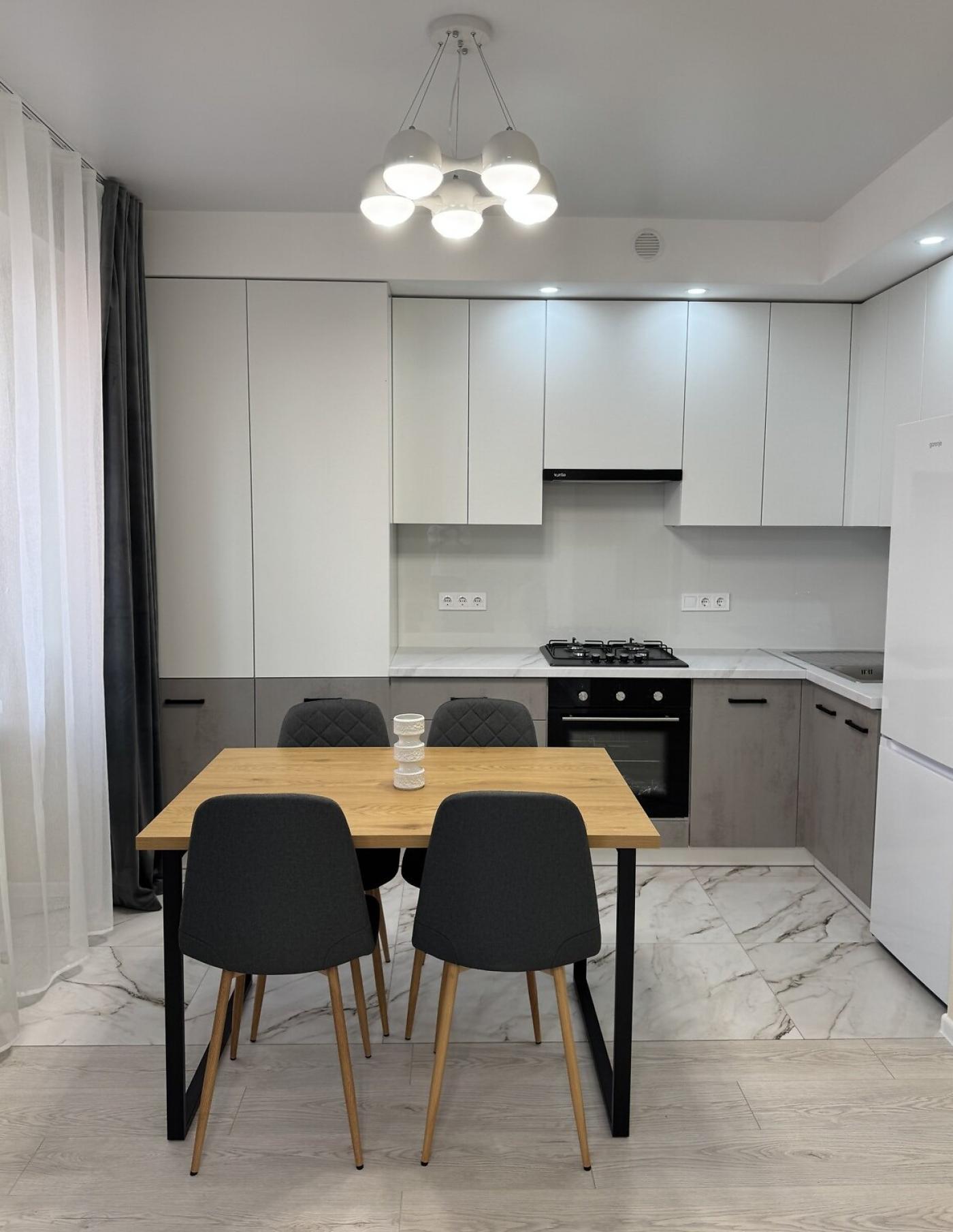 Житло має зручне планування з великою кухнею-вітальнею та окремою спальнею з вікном і дверима. Квартира повністю укомплектована всіма необхідними меблями та технікою, включаючи вбудовану кухню з побутовою технікою, пральну машину та кондиціонер.
