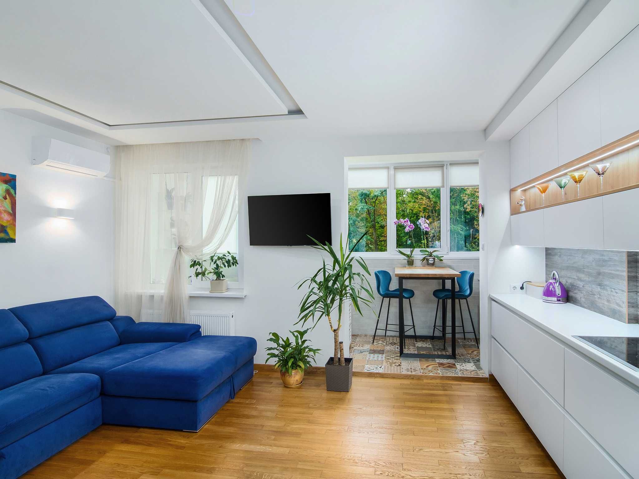 Простір укомплектований сучасною побутовою технікою: холодильник Samsung, телевізор Samsung з діагоналлю 58", пральна машина Whirlpool, індукційна варочна поверхня, духова шафа, бойлер Bosch на 80 літрів, інверторний кондиціонер з режимами охолодження та обігріву.