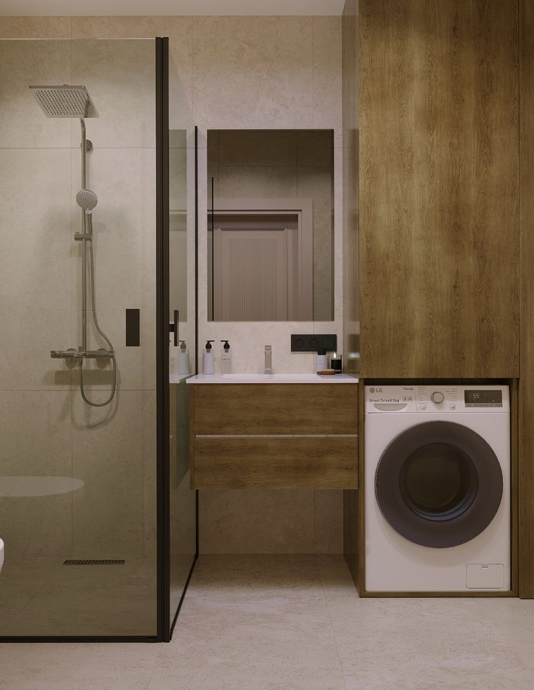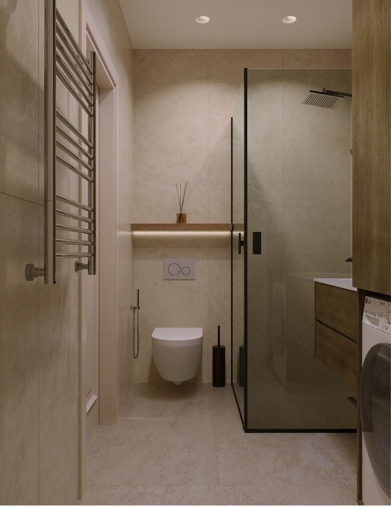 У санвузлі — широкоформатний керамограніт (120×60) на стінах і підлозі, тепла підлога, сучасне освітлення з вбудованими точками.