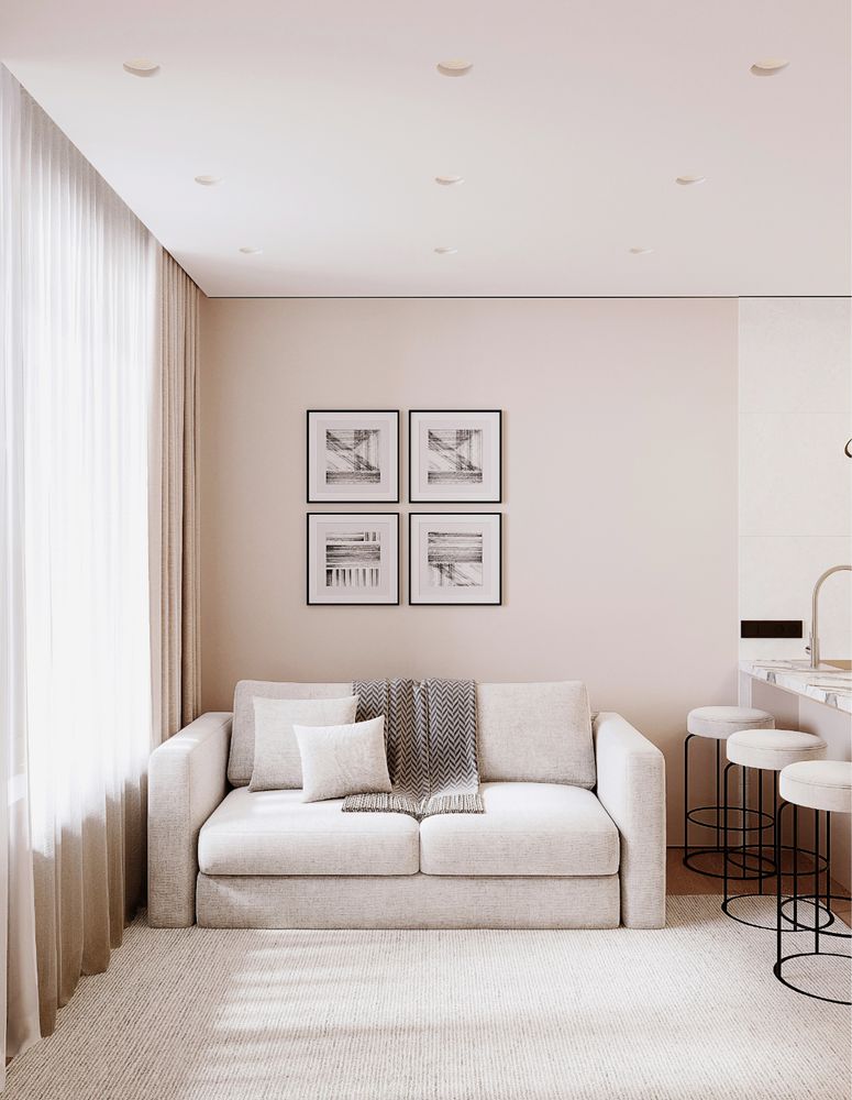 У кухні-вітальні облаштовано зону приготування їжі з острівцем-столом, а також розкладний диван довжиною два метри — зручно як для щоденного користування, так і для прийому гостей.
