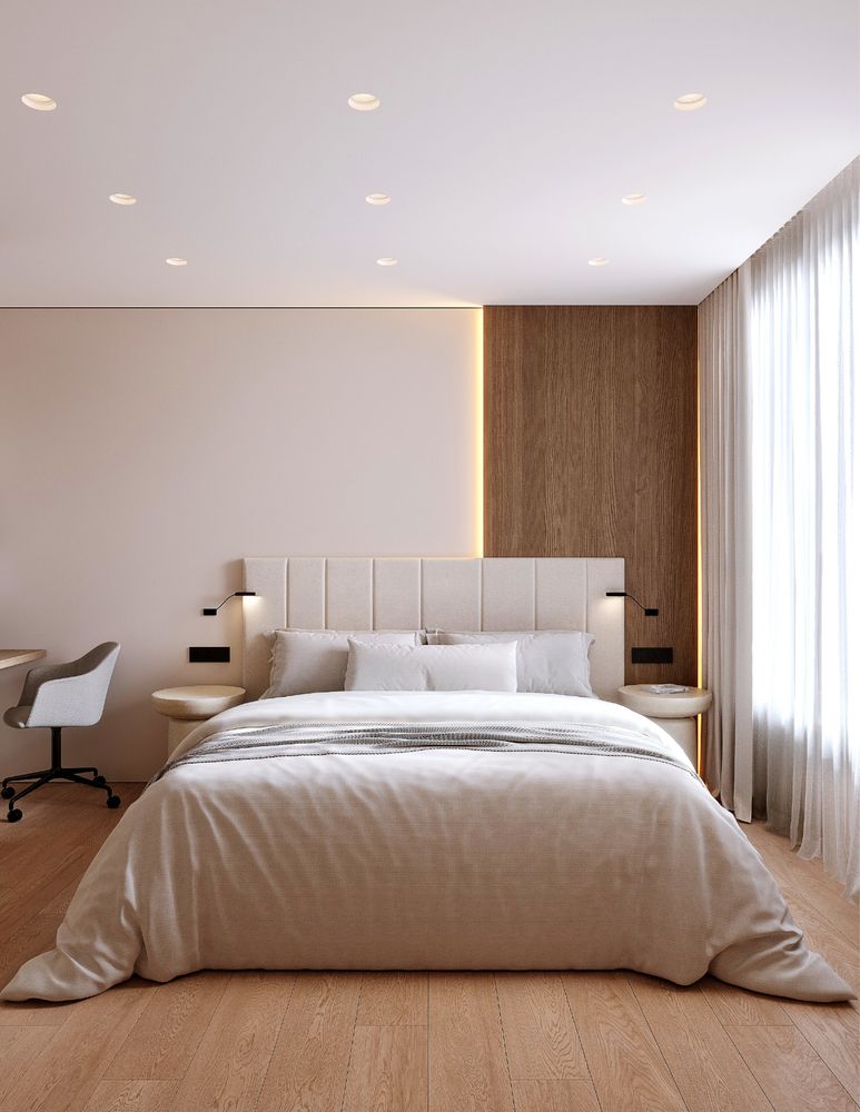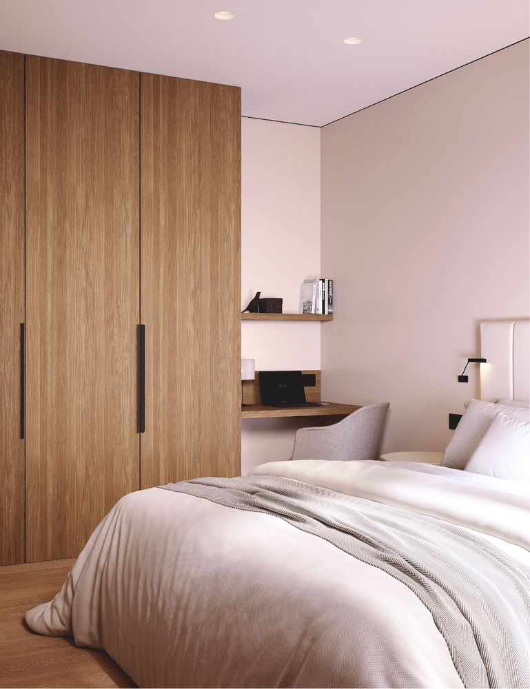Спальня обладнана великим ліжком розміром 180×200, місткою шафою та робочим місцем. Окремо передбачено гардеробну кімнату, що додає простору для зберігання.