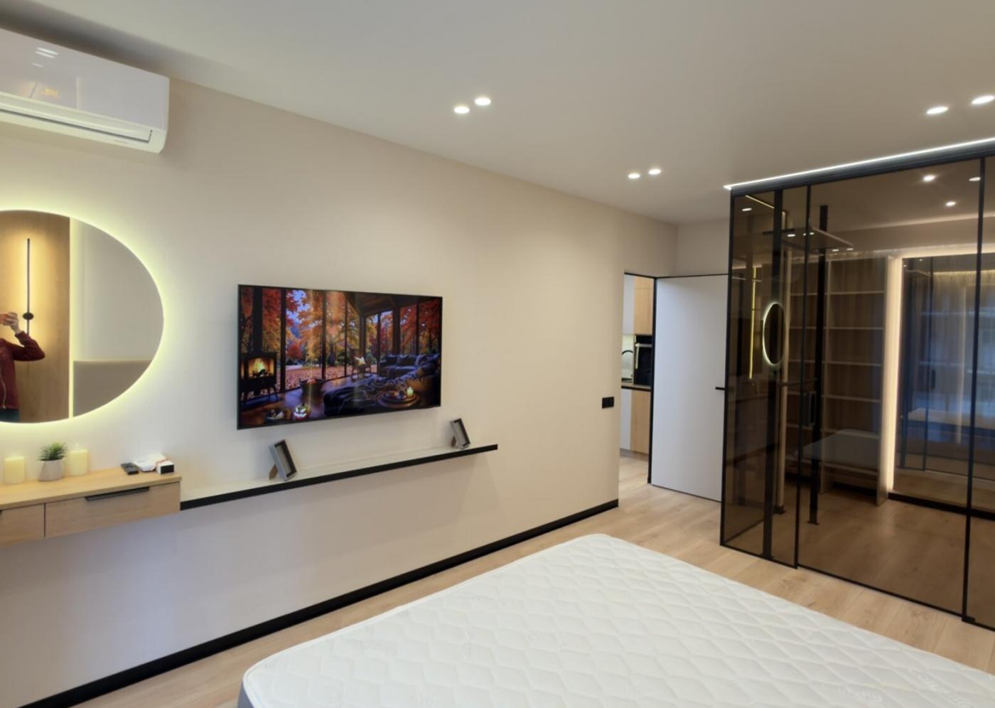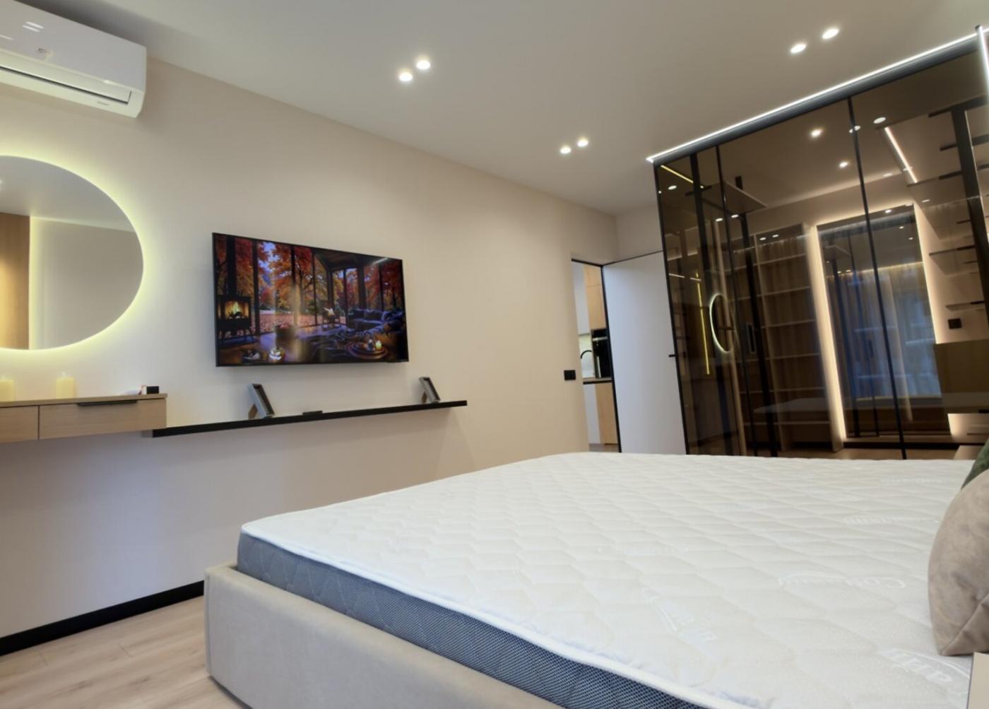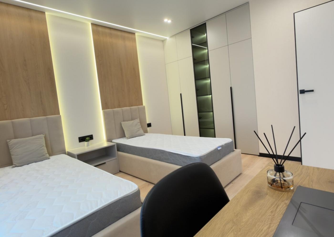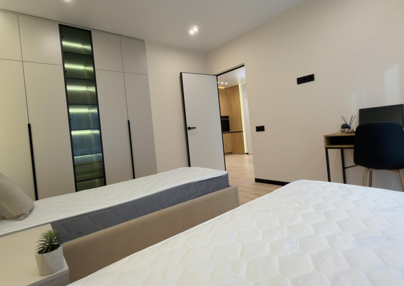 Усе продумано до найменших дрібниць: головна спальня облаштована ліжком king-size, телевізором та має простору гардеробну, а друга спальня, яка ідеально підійде під дитячу або робочий кабінет, має два ліжка, дві шафи та письмовий столик.