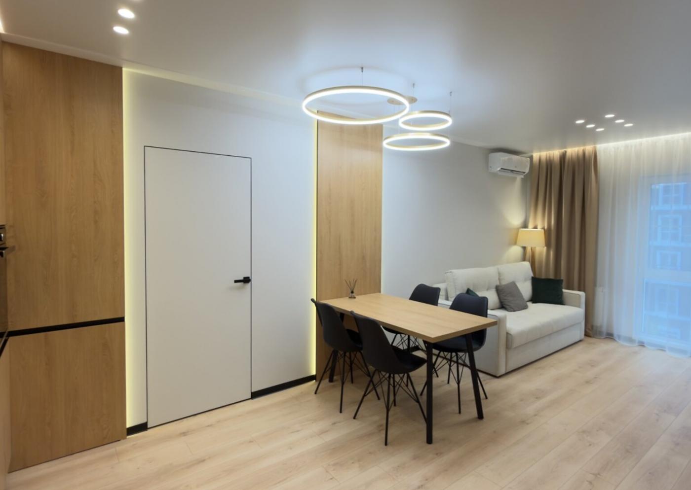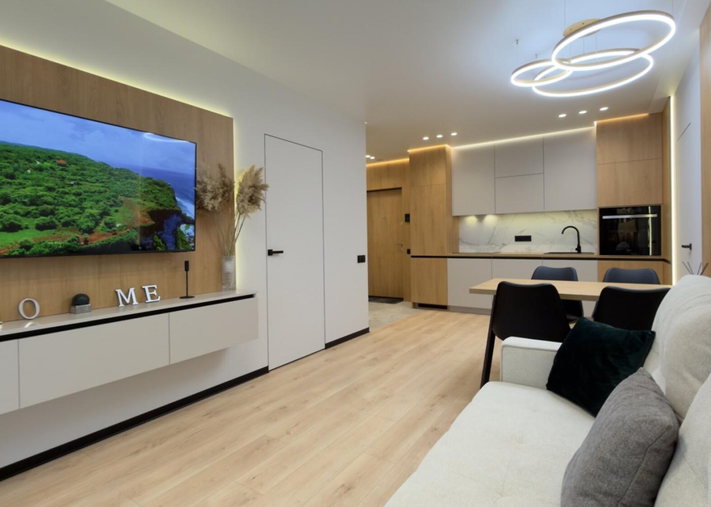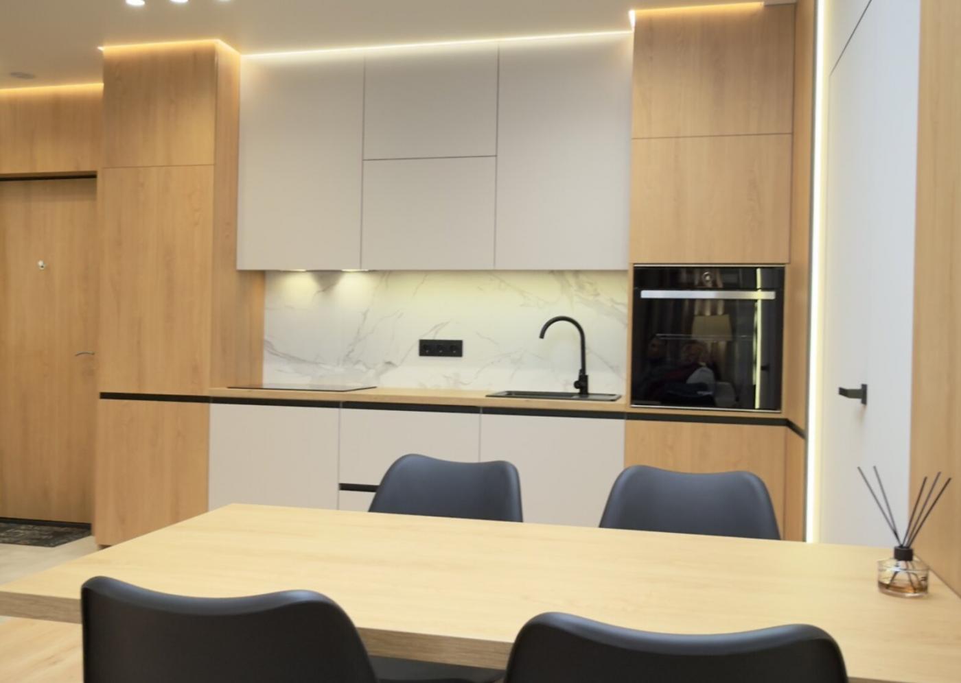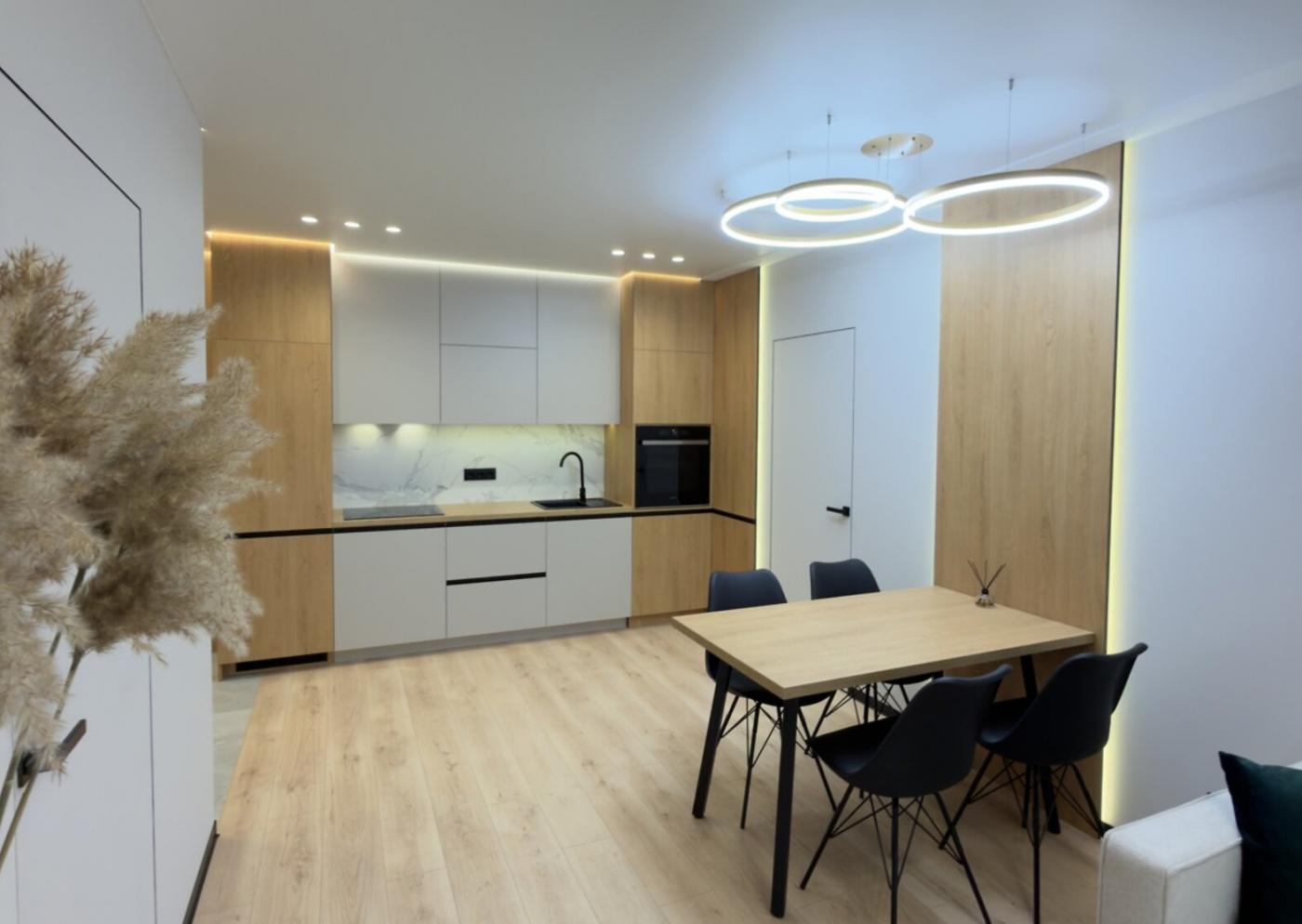 Кухня укомплектована вбудованою якісною побутовою технікою, включно з холодильником, посудомийною машиною, духовою шафою, витяжкою та електроповерхнею.
