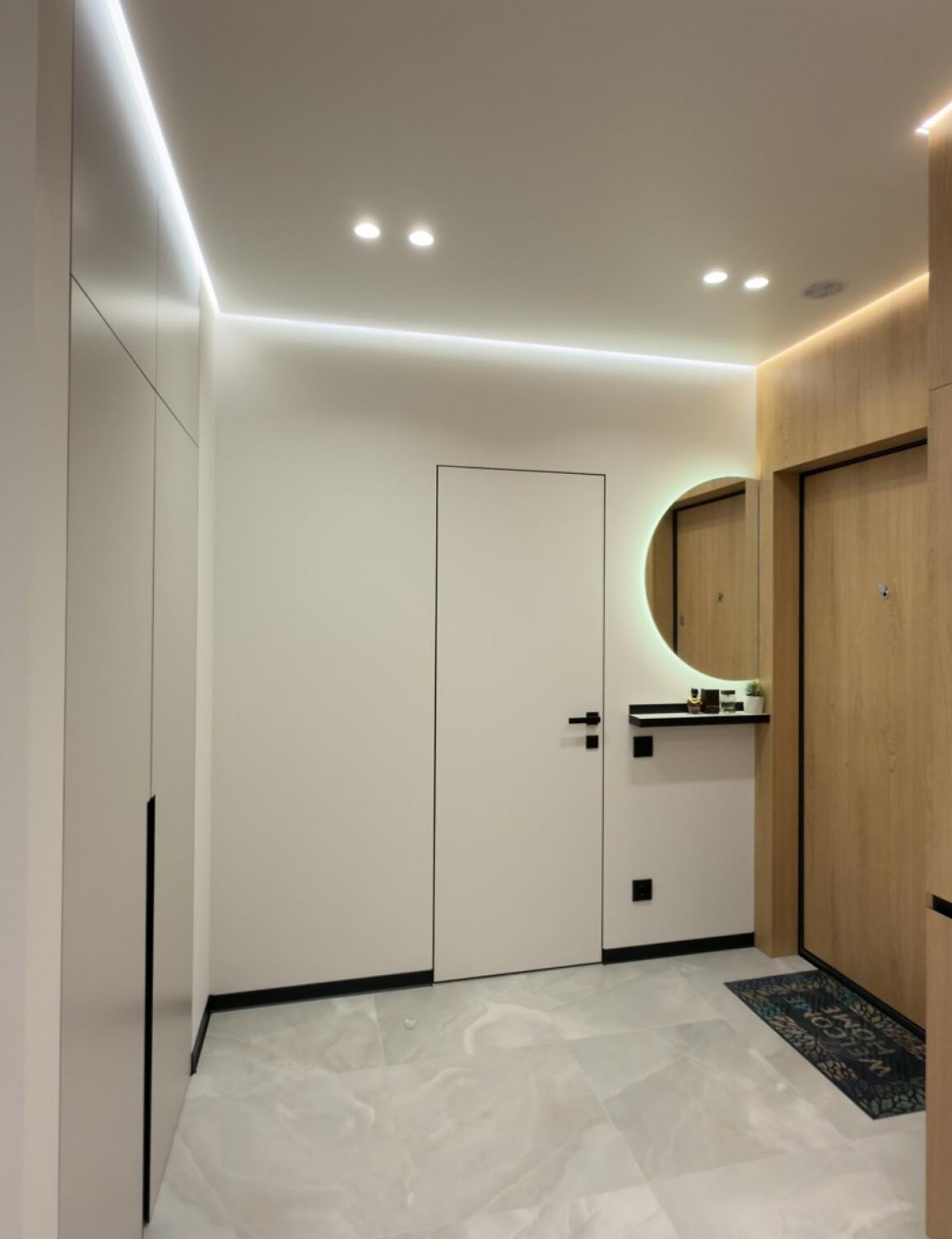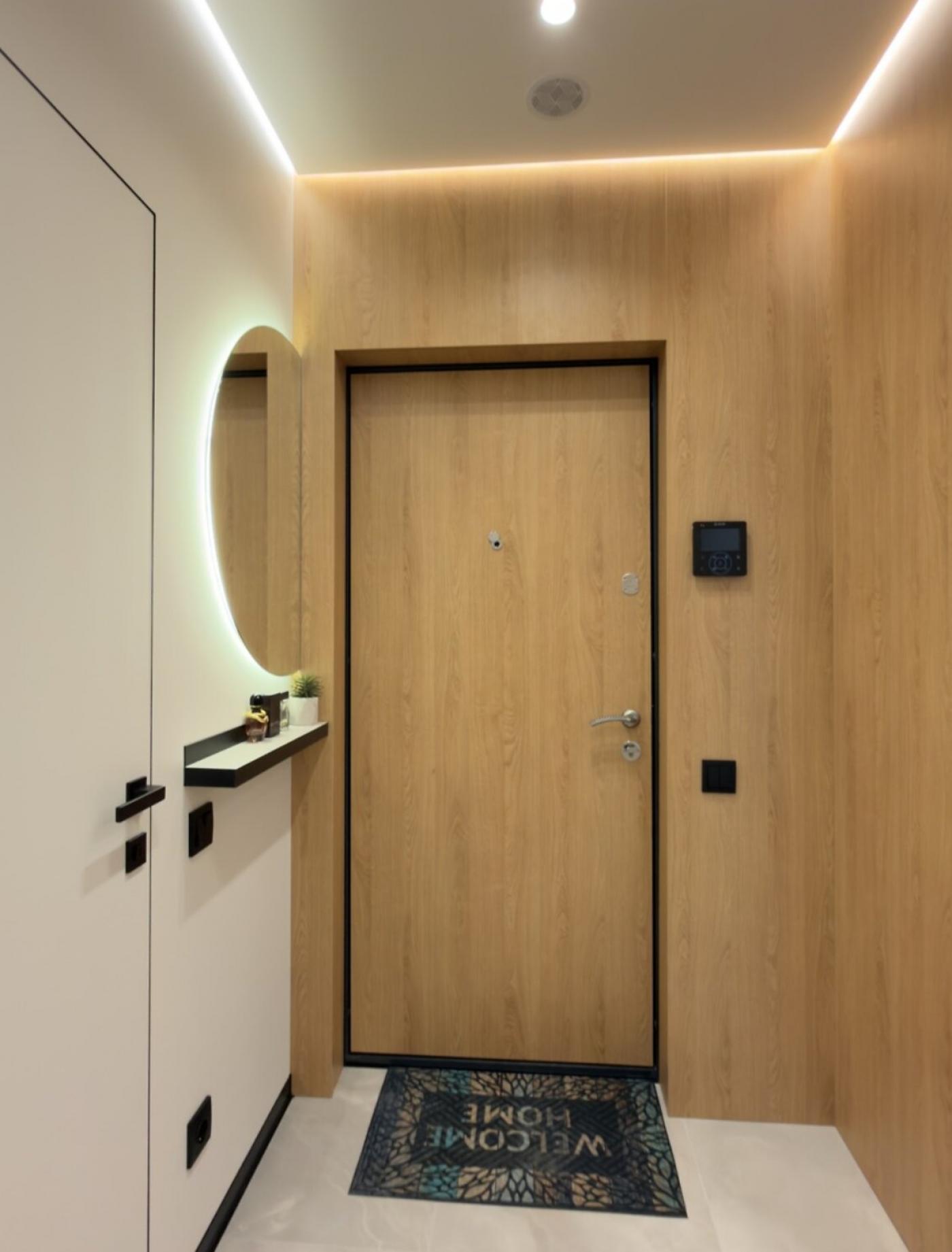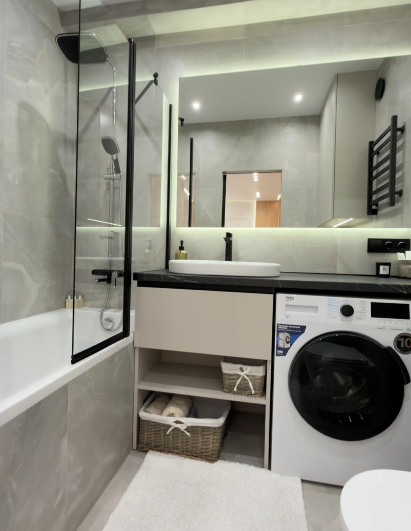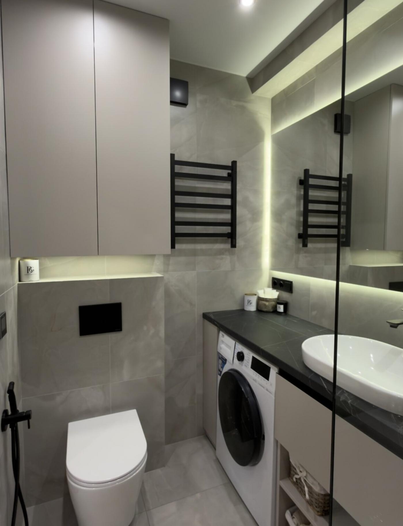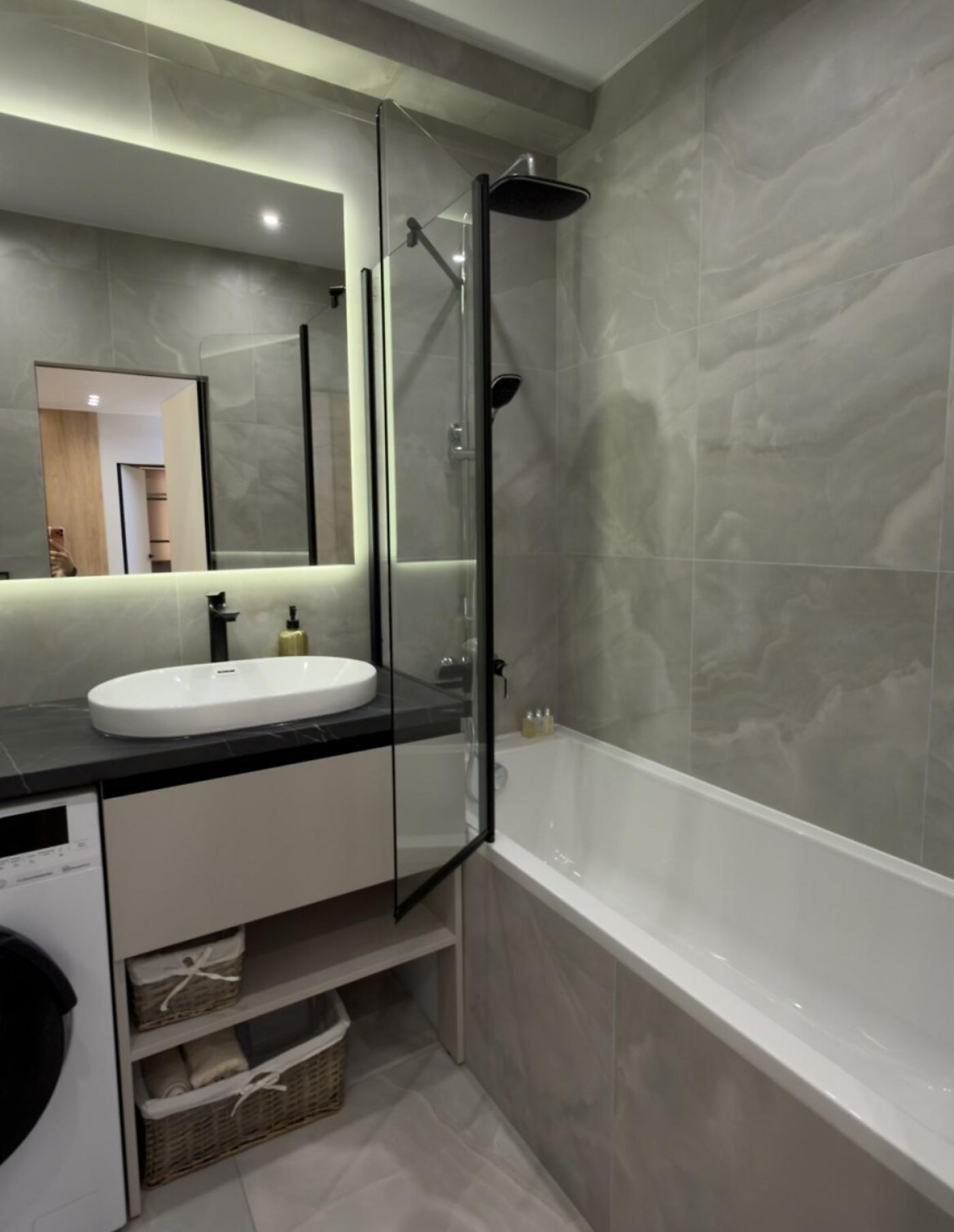 Санвузол — це окрема зона комфорту з підлогою з підігрівом, обладнаний прально-сушильною машинкою, бойлером на 80 літрів, гігієнічним душем, потужною витяжкою та величезним дзеркалом з підсвіткою і електричною сушилкою. Додатковим скарбом є повноцінна ванна. Домофон і Wi-Fi вже підключені.
