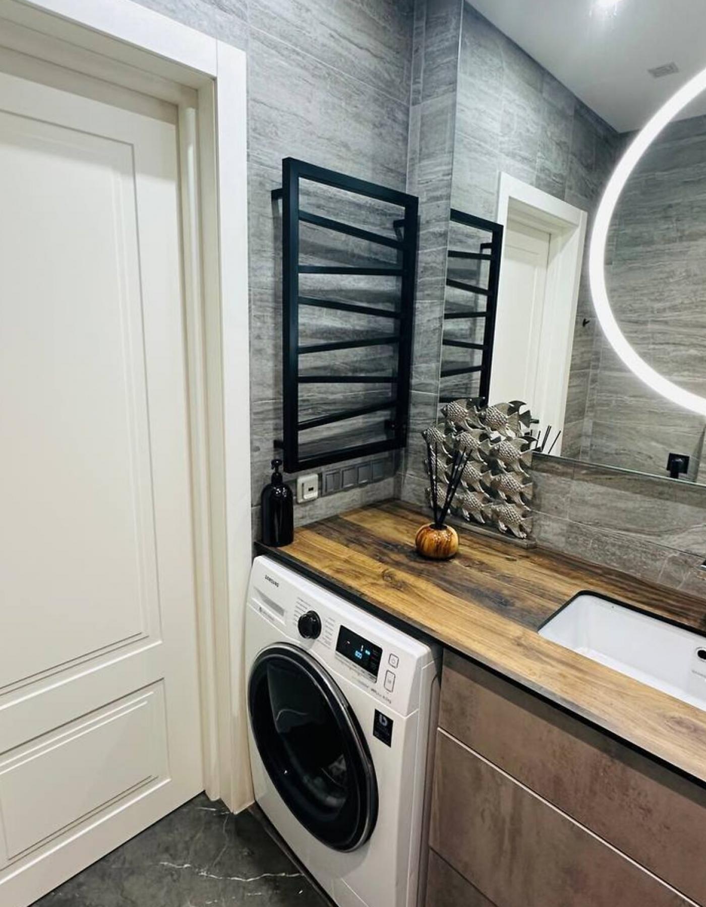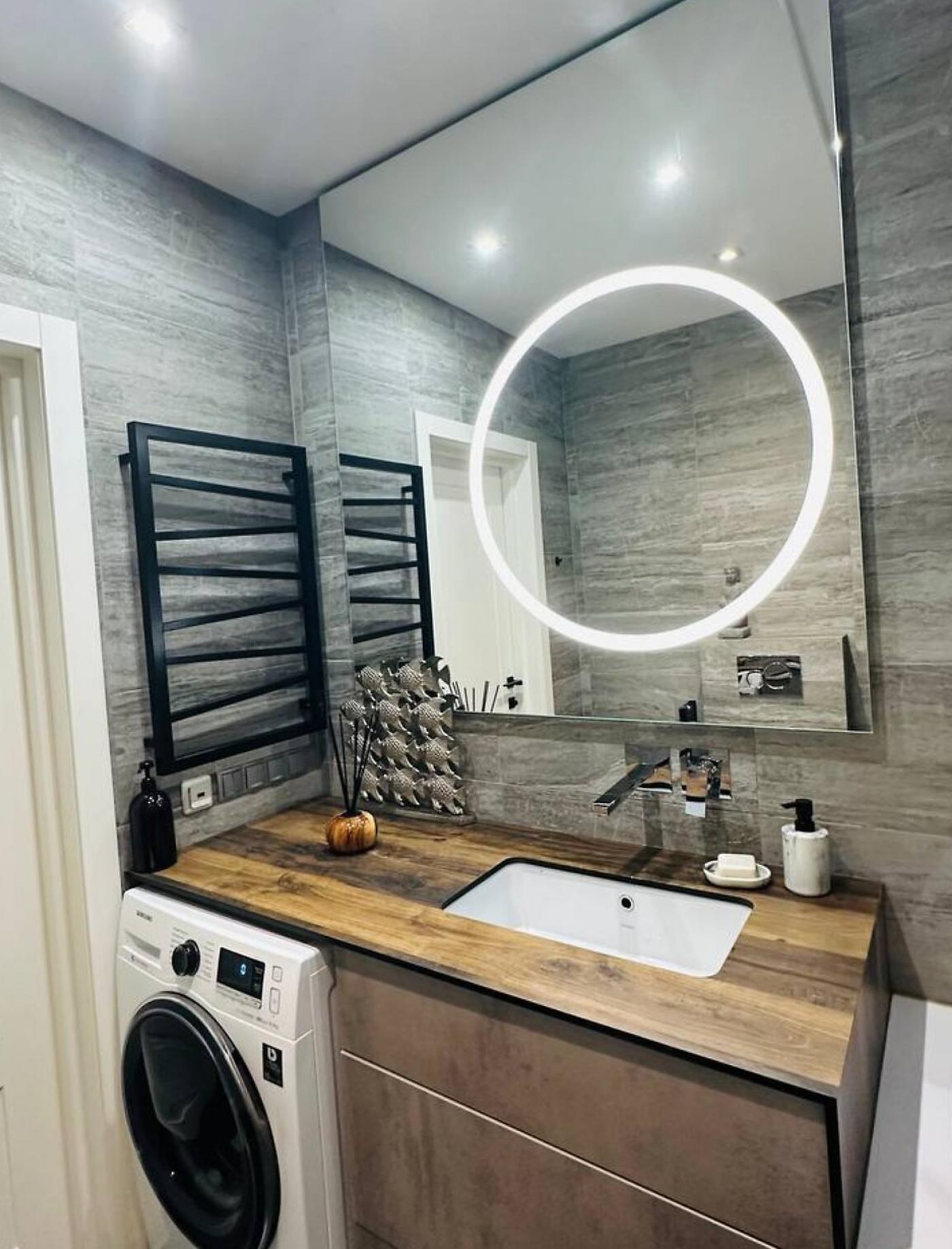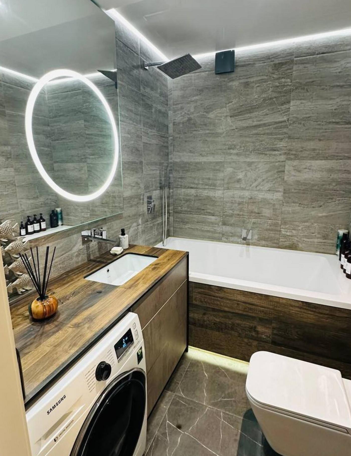 LED-підсвітка в кожній зоні, вологостійкі поверхні Egger, німецькі розетки Hager Berker, міжкімнатні двері Rodos з прихованим монтажем — усе створює атмосферу стилю, тепла і технологічного комфорту.