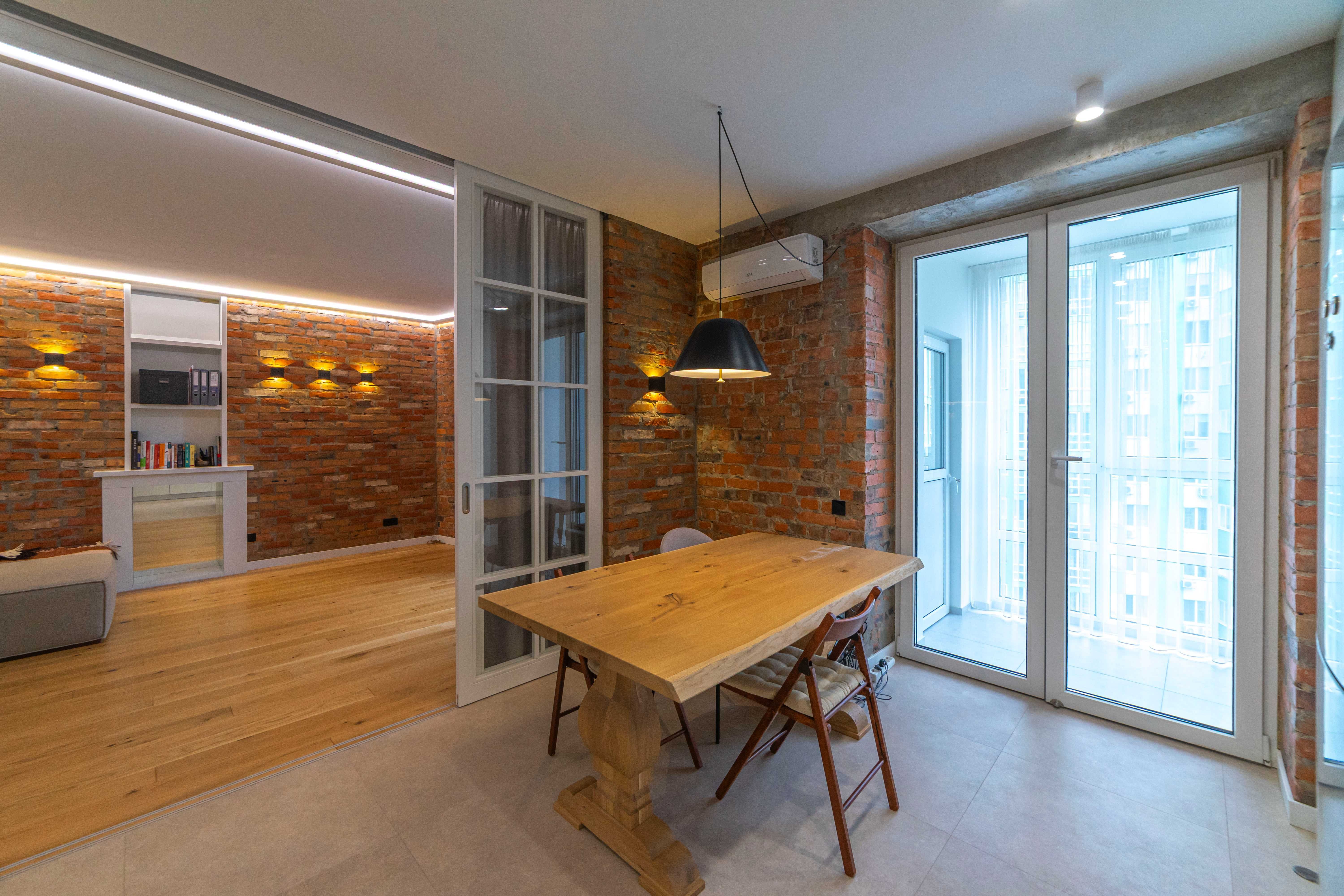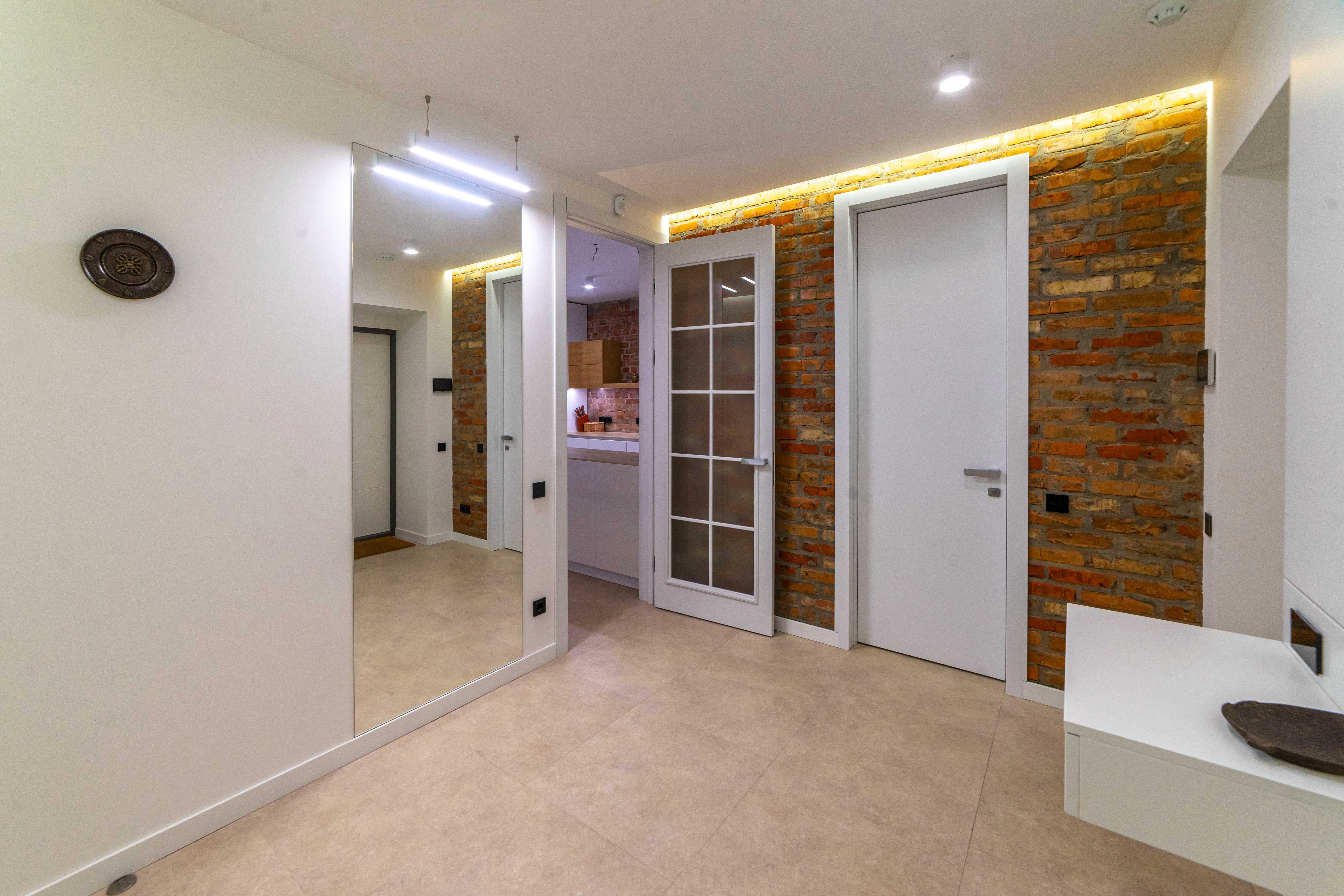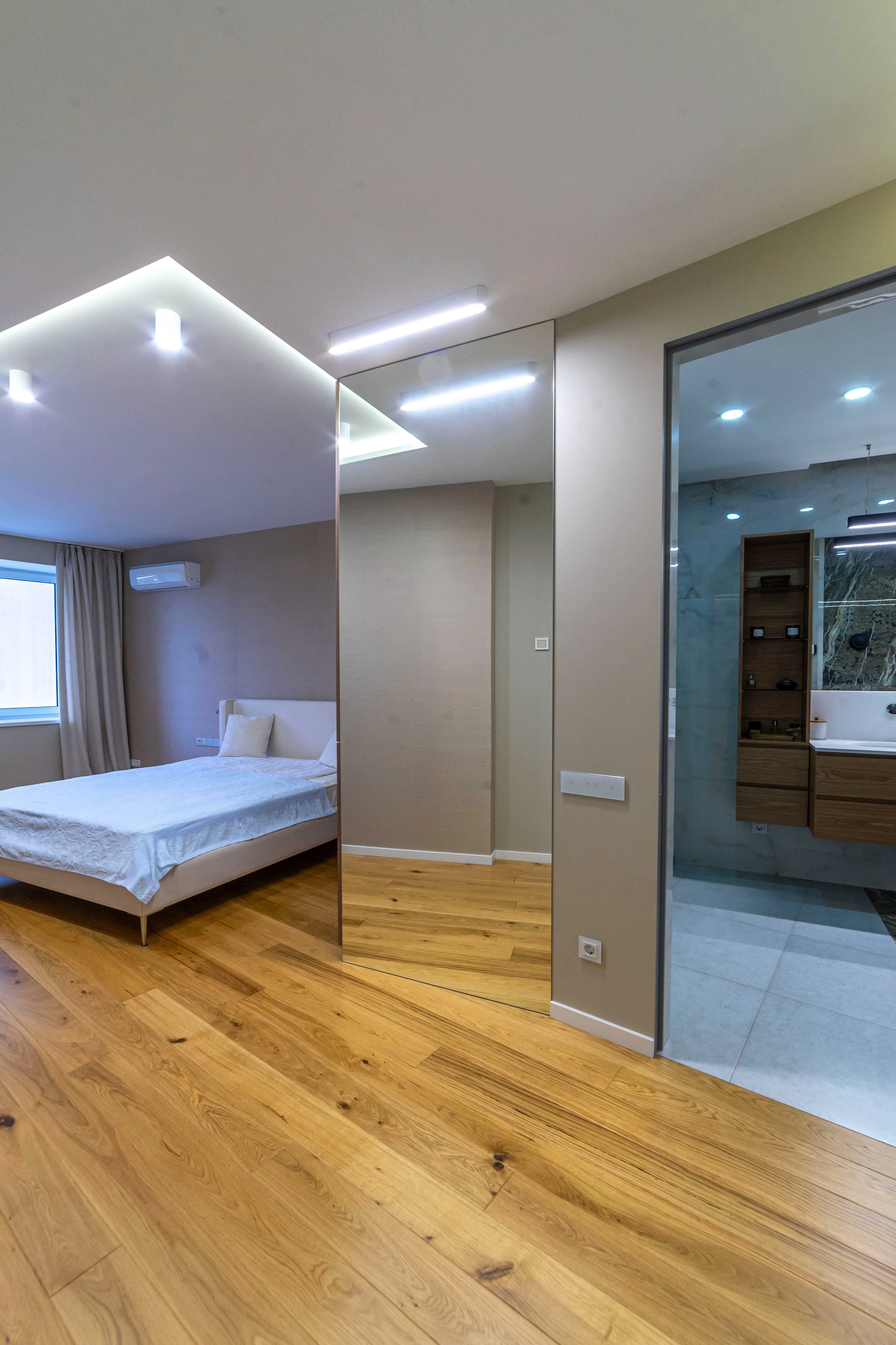 Інтер’єр виконано у сучасному стилі з використанням преміальних матеріалів та техніки. Кухня відділена від вітальні розсувними дверима, спальня має власний просторий санвузол, а дитяча кімната додатково утеплена з заміною вікон.