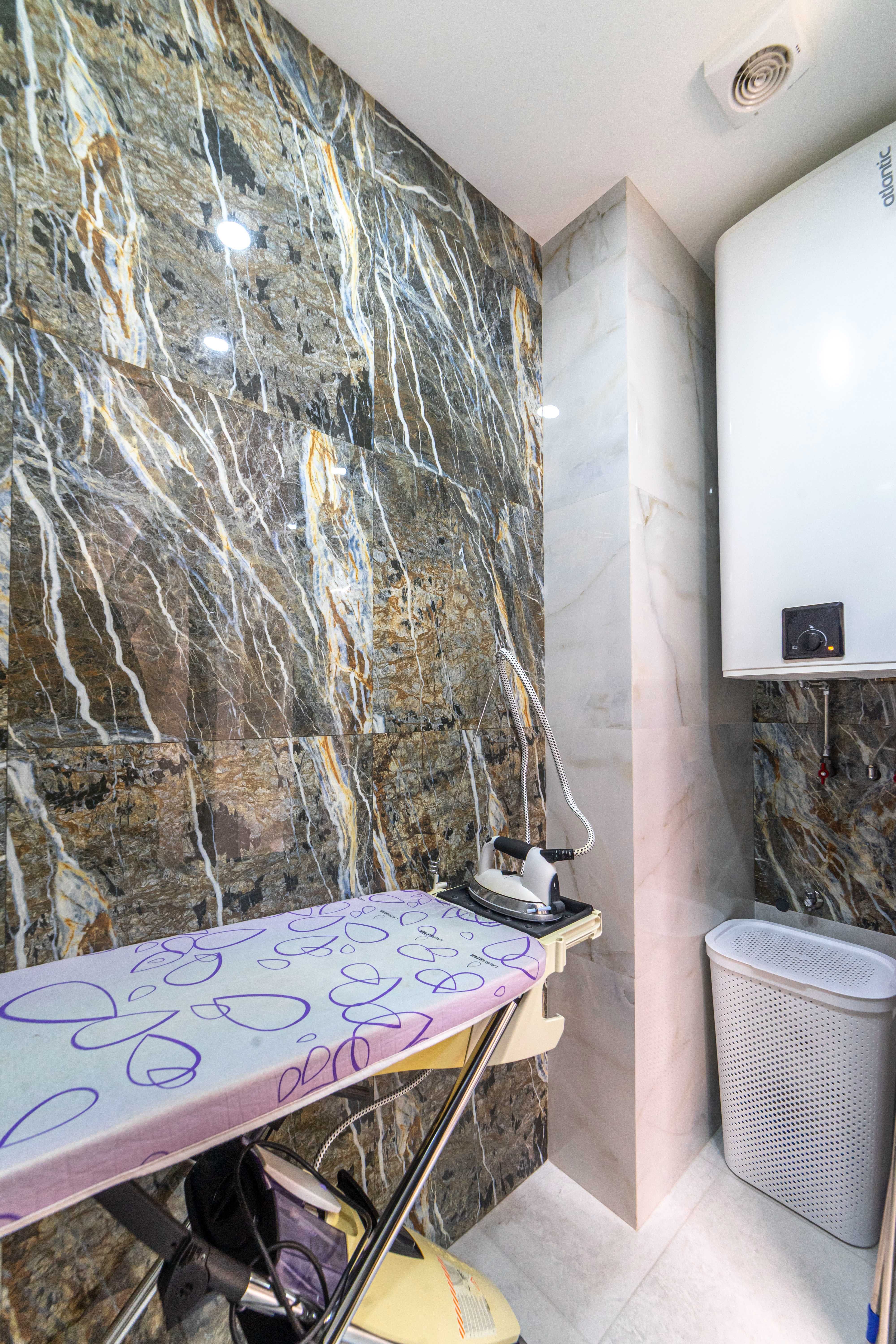 У квартирі передбачено все для комфортного життя: два балкони, три санвузли, дві гардеробні кімнати, окрема зона для прасування, тепла підлога Rehau, індивідуальне опалення з котлом Bosch, кондиціонери C&H.