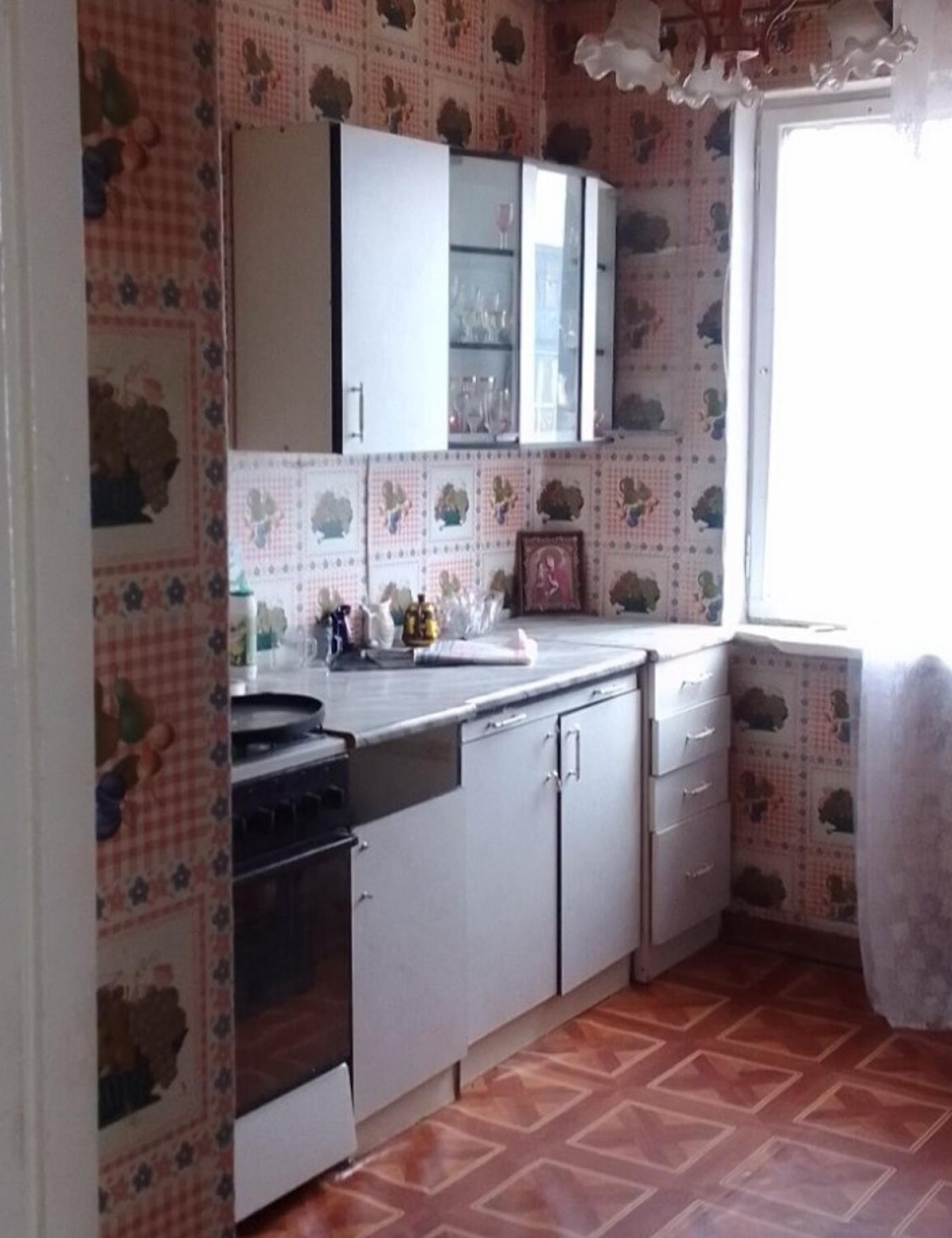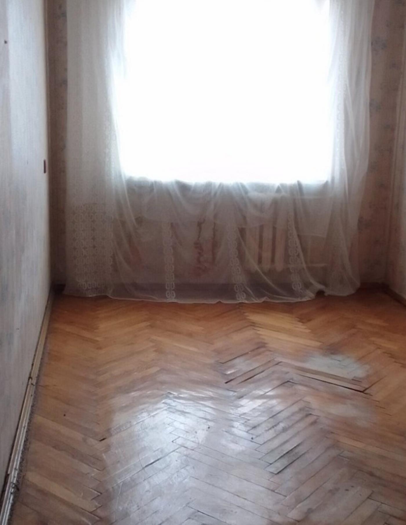 Квартира перебуває у задовільному стані. На підлозі покладено комбінацію паркету та лінолеуму, стіни обклеєні шпалерами.