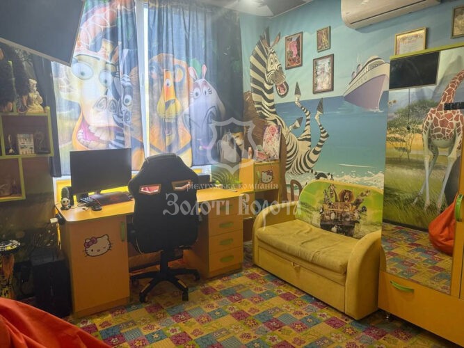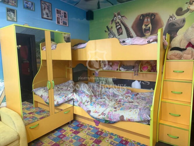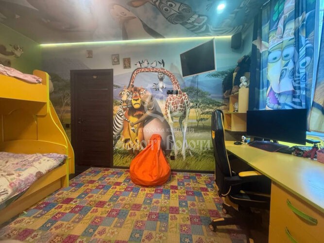 Планування передбачає дві окремі кімнати: яскраву дитячу, оформлену в стилі «Мадагаскар», та спальню для батьків. Кухня-студія об’єднана з прихожою та зоною зберігання, ванна кімната — повністю обладнана.