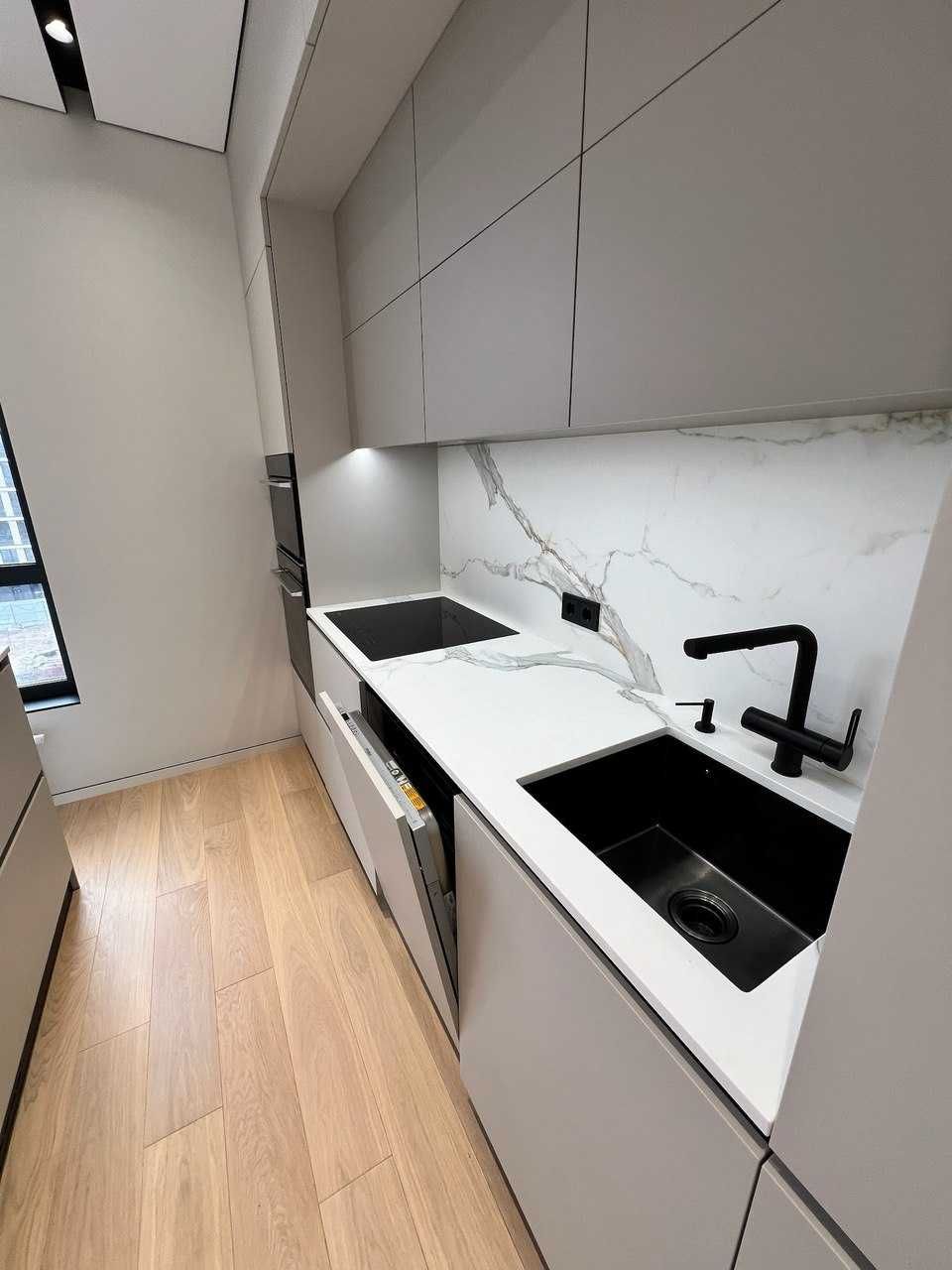 Кухня — вбудована, матова МДФ AGT, фурнітура Blum, стільниця з натурального керамограніту, мийка нижнього монтажу, техніка Whirlpool, включно з індукційною плитою, духовкою, мікрохвильовкою, холодильником, посудомийною машиною та додатковою морозильною камерою в острові.