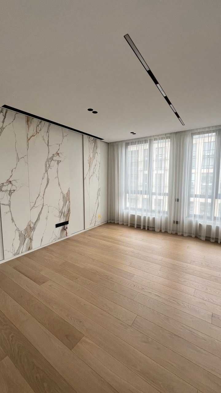 Підлога — натуральний дубовий паркет у житлових кімнатах, керамограніт із підігрівом у коридорі. Стіни — ідеально вирівняні, пофарбовані матовою фарбою Flugger Dekso 5, з гіпсовими панелями та декоративним керамогранітом у телевізійних зонах.