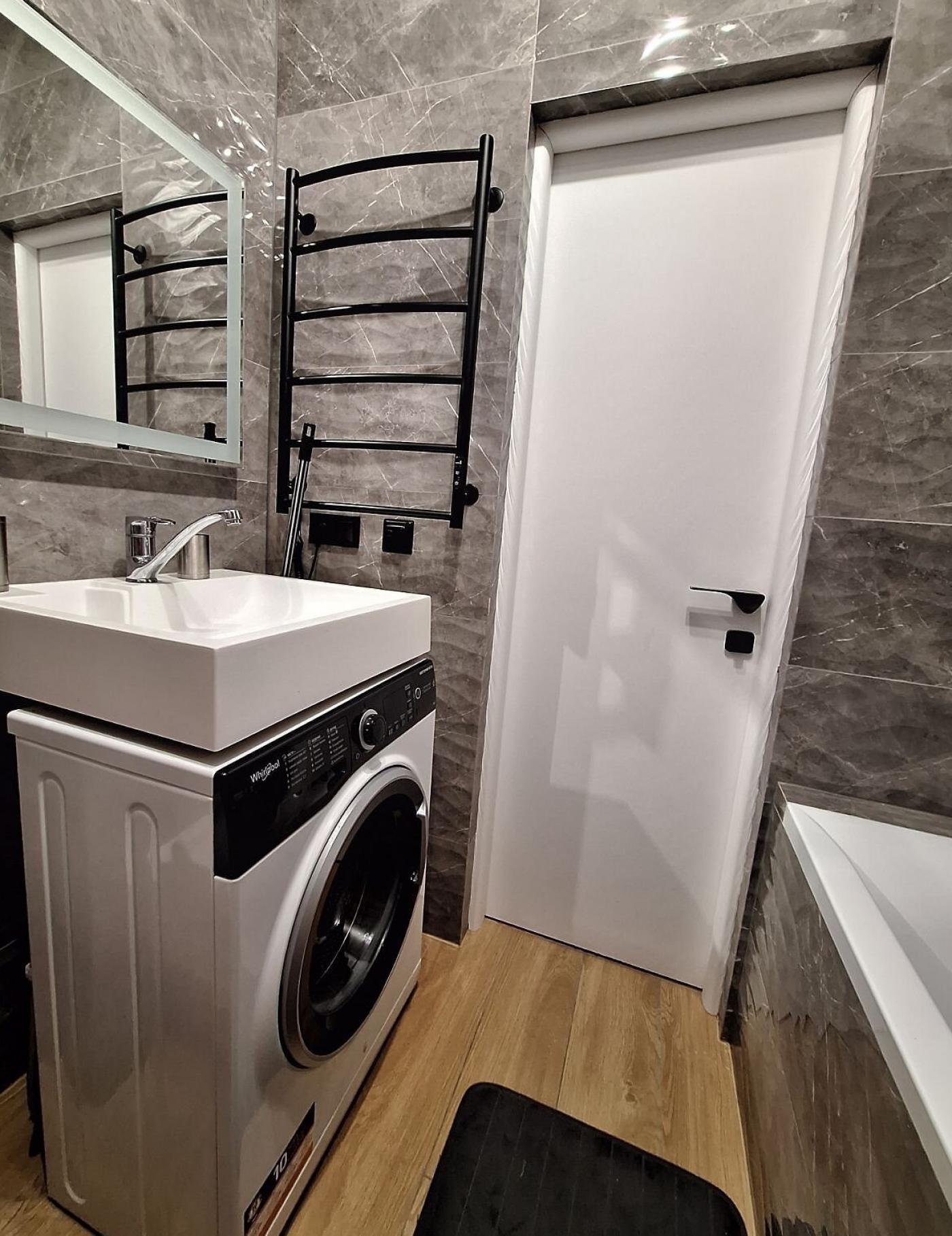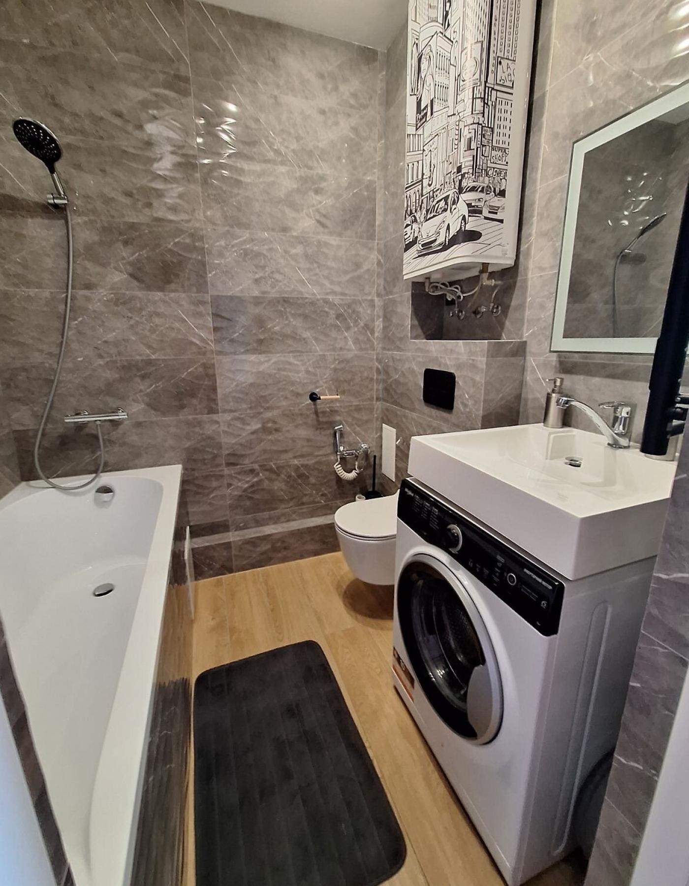 Санвузол суміжний, оздоблений плиткою, тут встановлена ванна, а також є пральна машина та сушка для рушників. Додатковий комфорт створює підігрів підлоги та підігрів стіни у санвузлі.