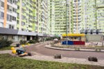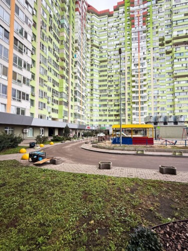 Двір — доглянутий, зелений, із дитячими майданчиками, кав’ярнями, магазинами, салоном краси та навіть футбольним полем.