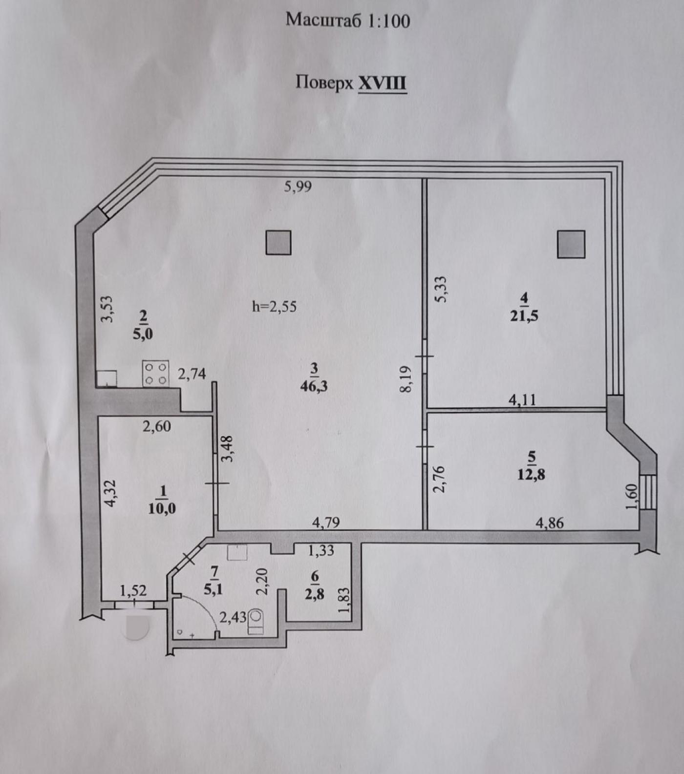 Помешкання знаходиться на 18 поверсі 25-поверхового будинку. В оселі виконане перепланування за авторським дизайн-проєктом, яке включає простору кухню-студію, вітальню та дві спальні кімнати (дитяча або кабінет).