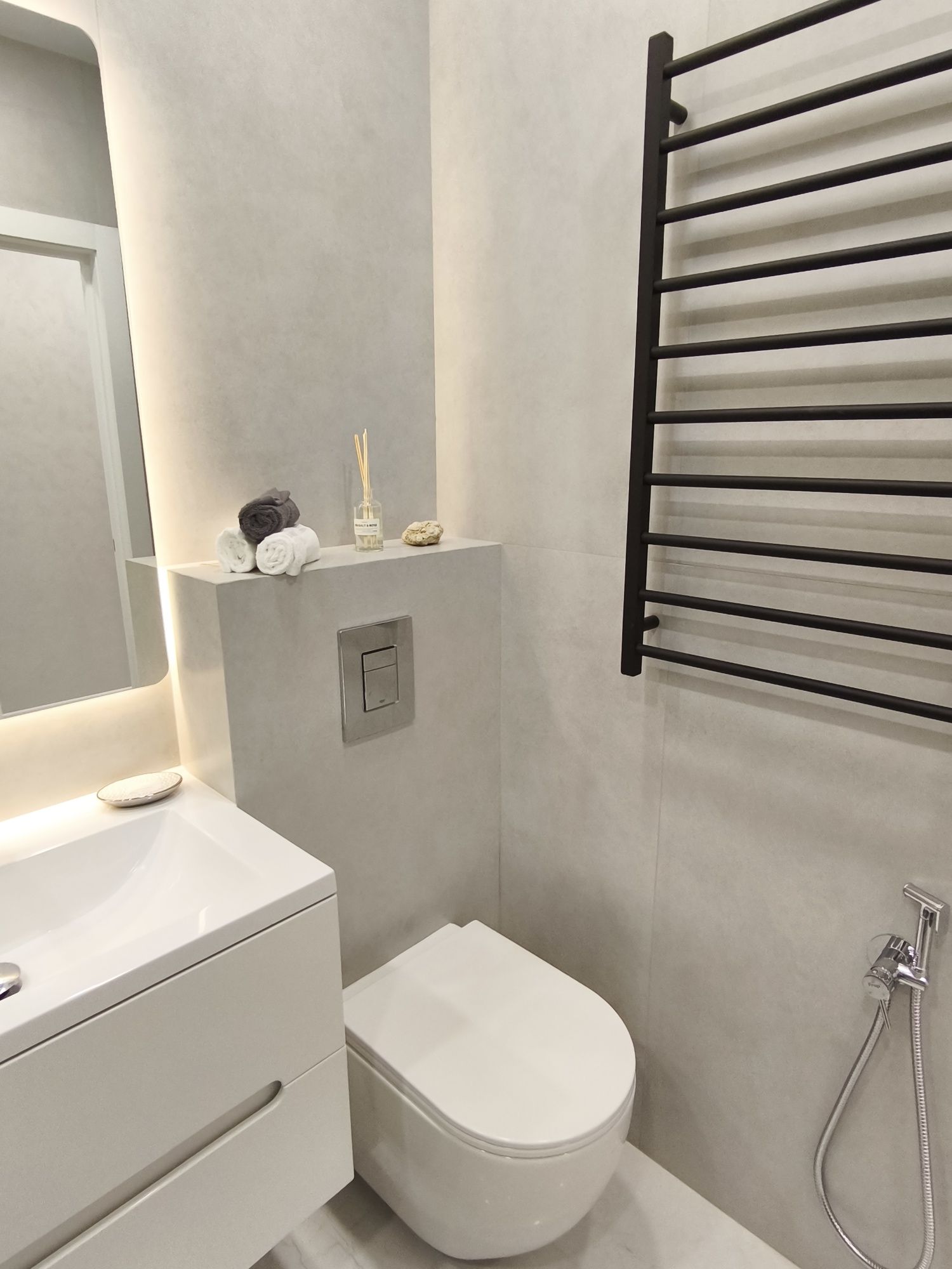 У спальні — ліжко з ортопедичним матрацом, шафа, телевізор, кондиціонер, точкове освітлення та декоративні підсвітки. Санвузол — з ванною, гігієнічним душем, бойлером на 80 л з двома сухими тенами, пральною та сушильною машинами, дзеркалом з підсвіткою, великою раковиною та інсталяцією.
