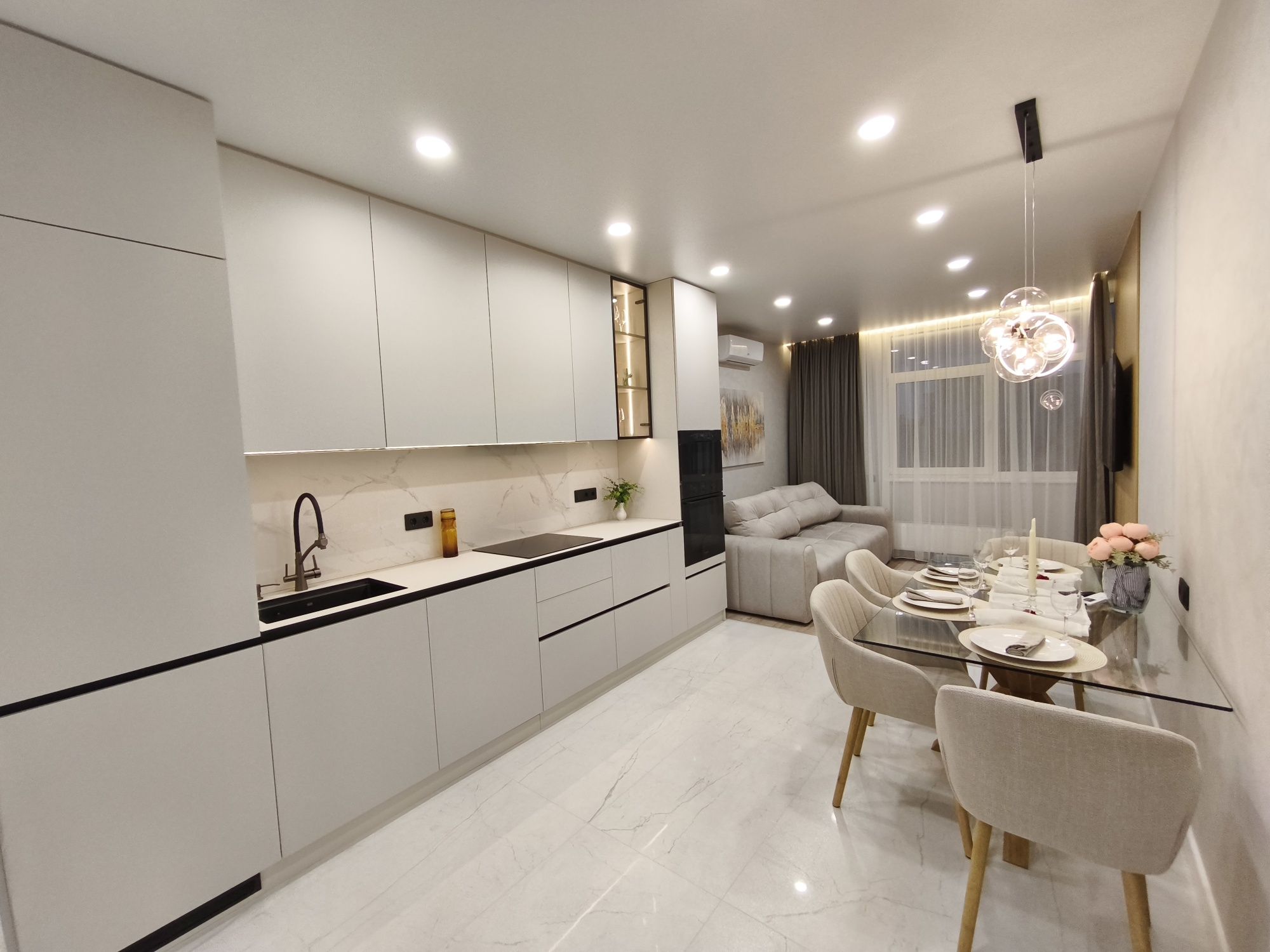 У коридорі — велика дзеркальна шафа з підсвіткою. Кухня-вітальня площею 21 м² обладнана сучасною технікою: великий холодильник, духовка, мікрохвильова, індукційна поверхня Whirlpool, витяжка, посудомийна машина, обідній стіл на 4–8 осіб, розкладний диван, телевізор Samsung 55", кондиціонер.