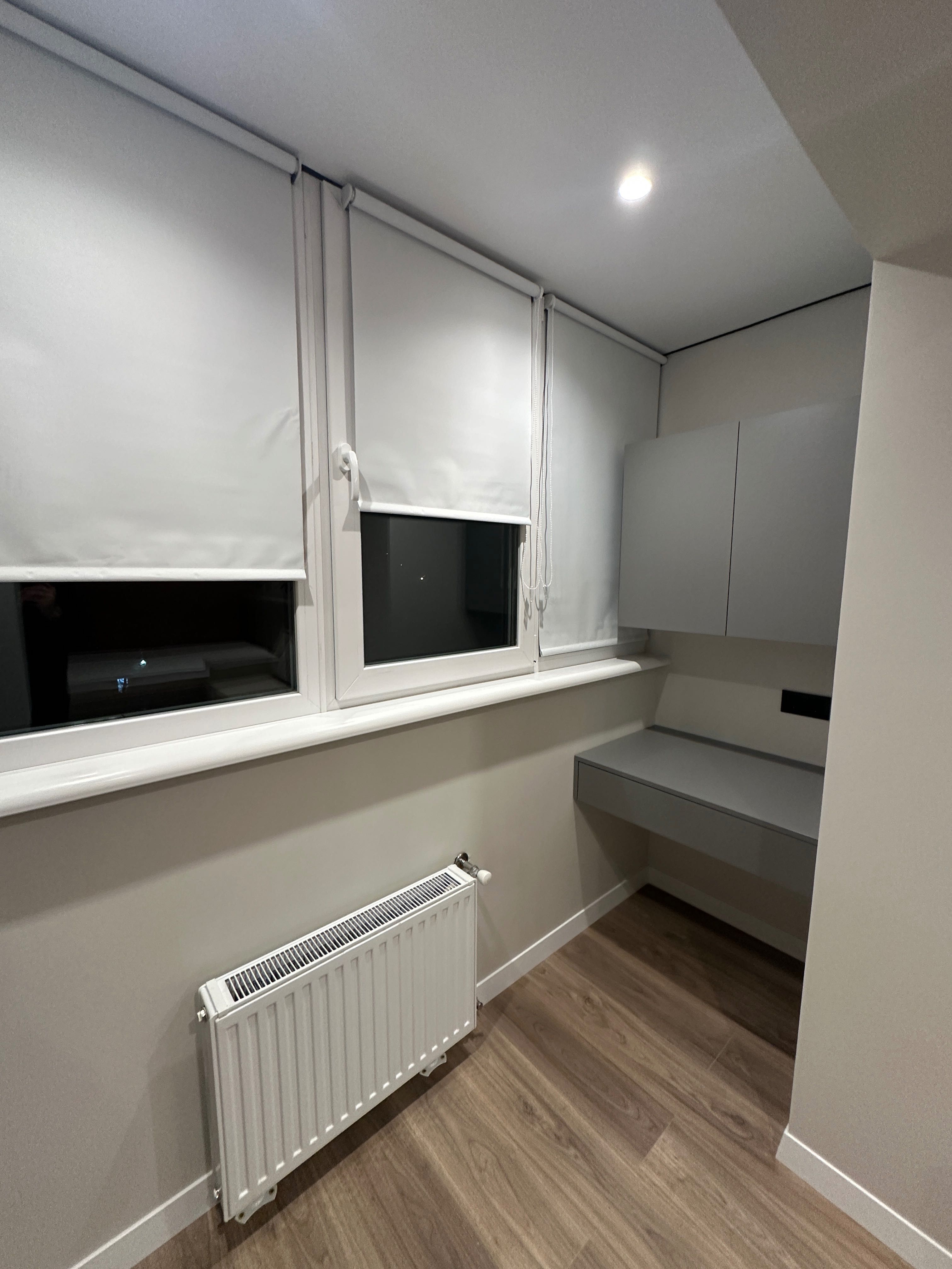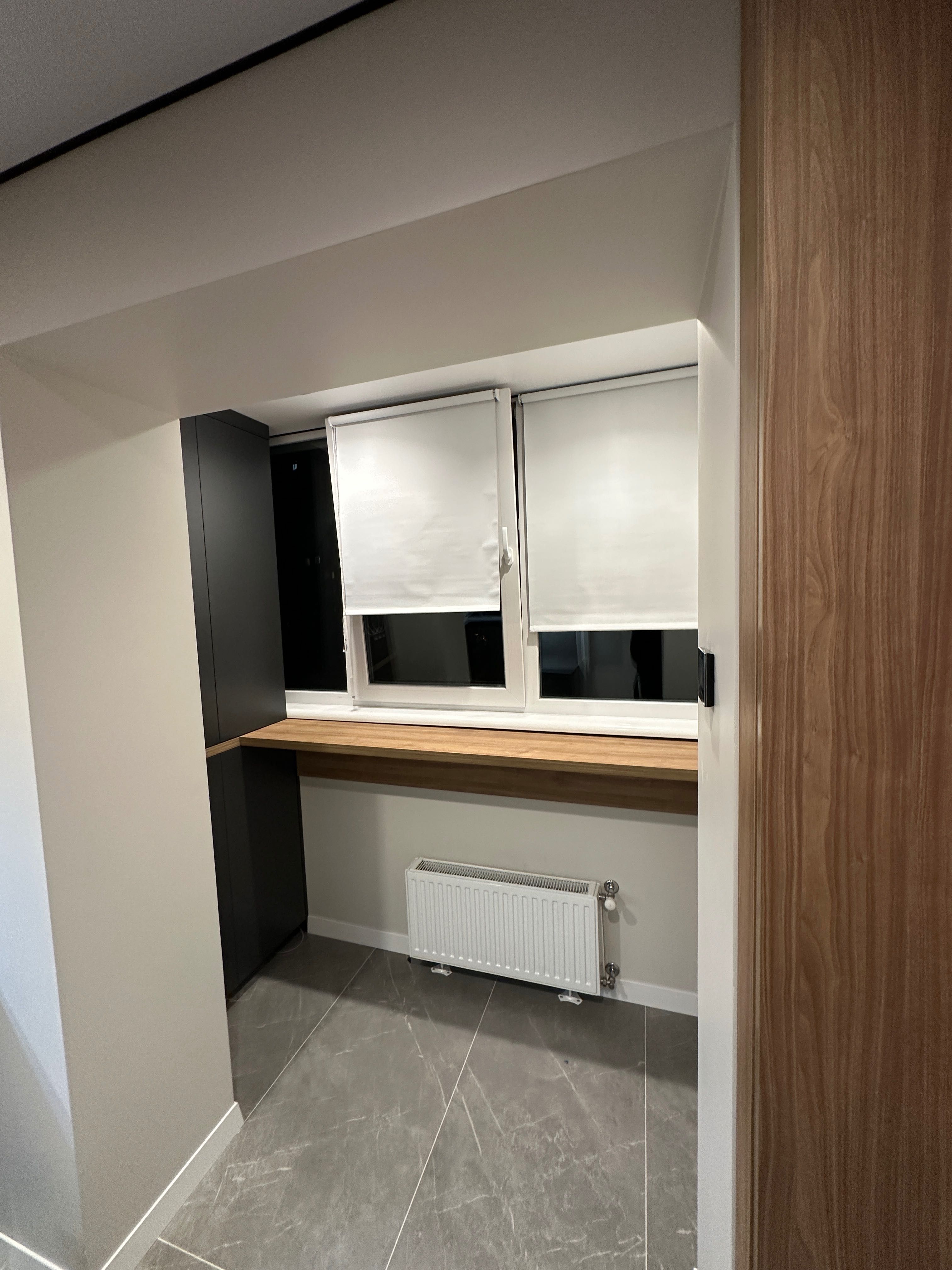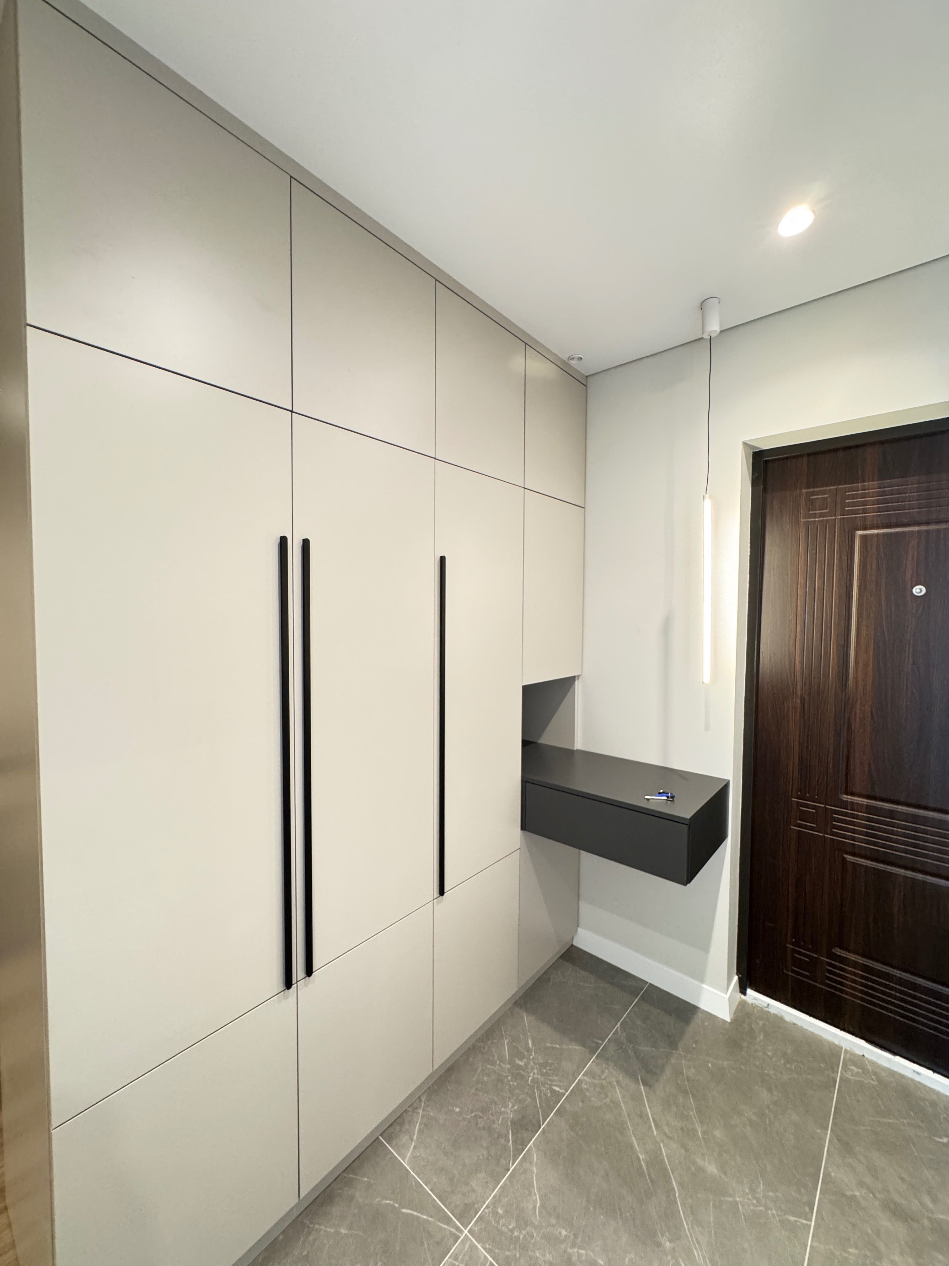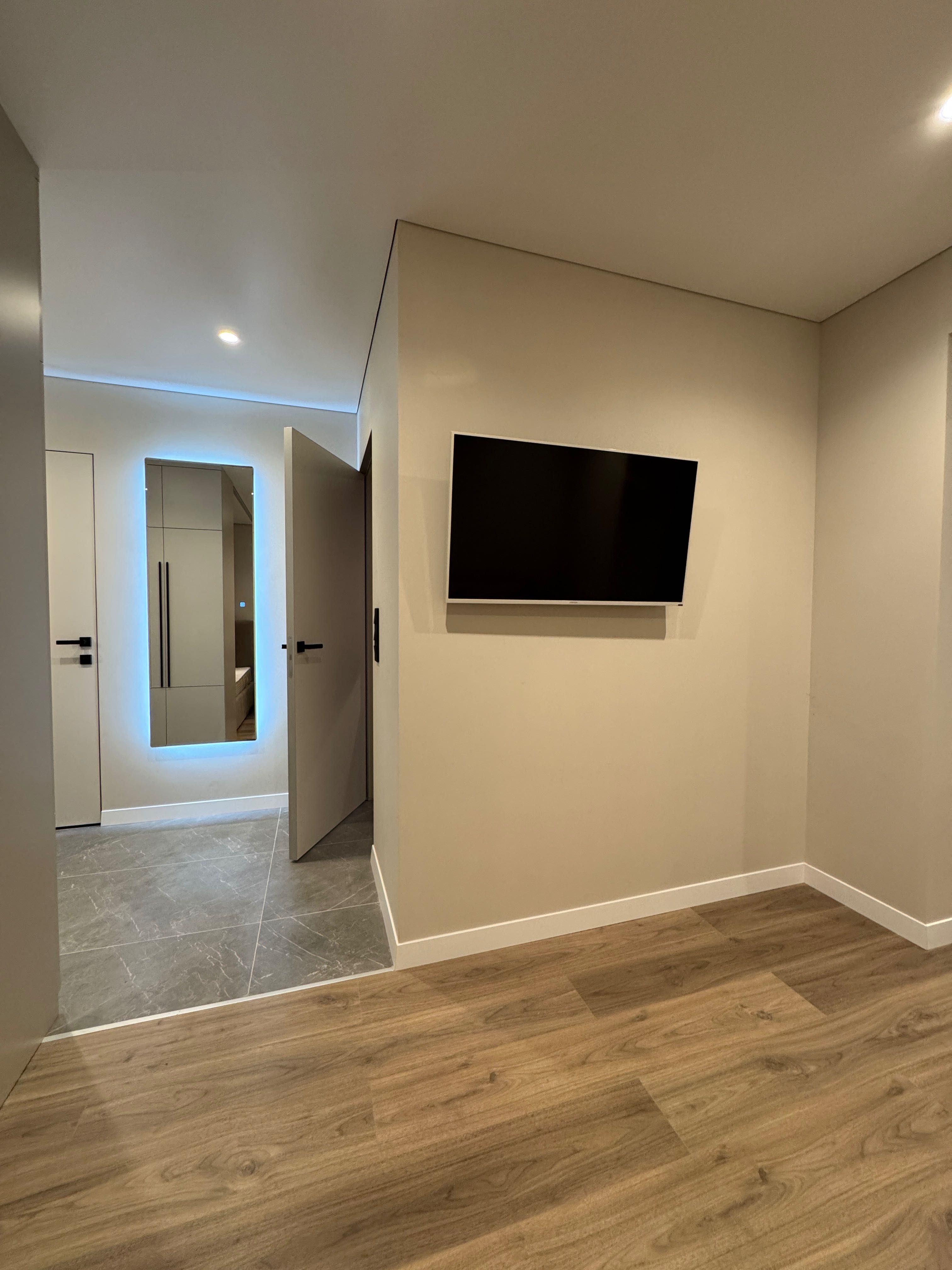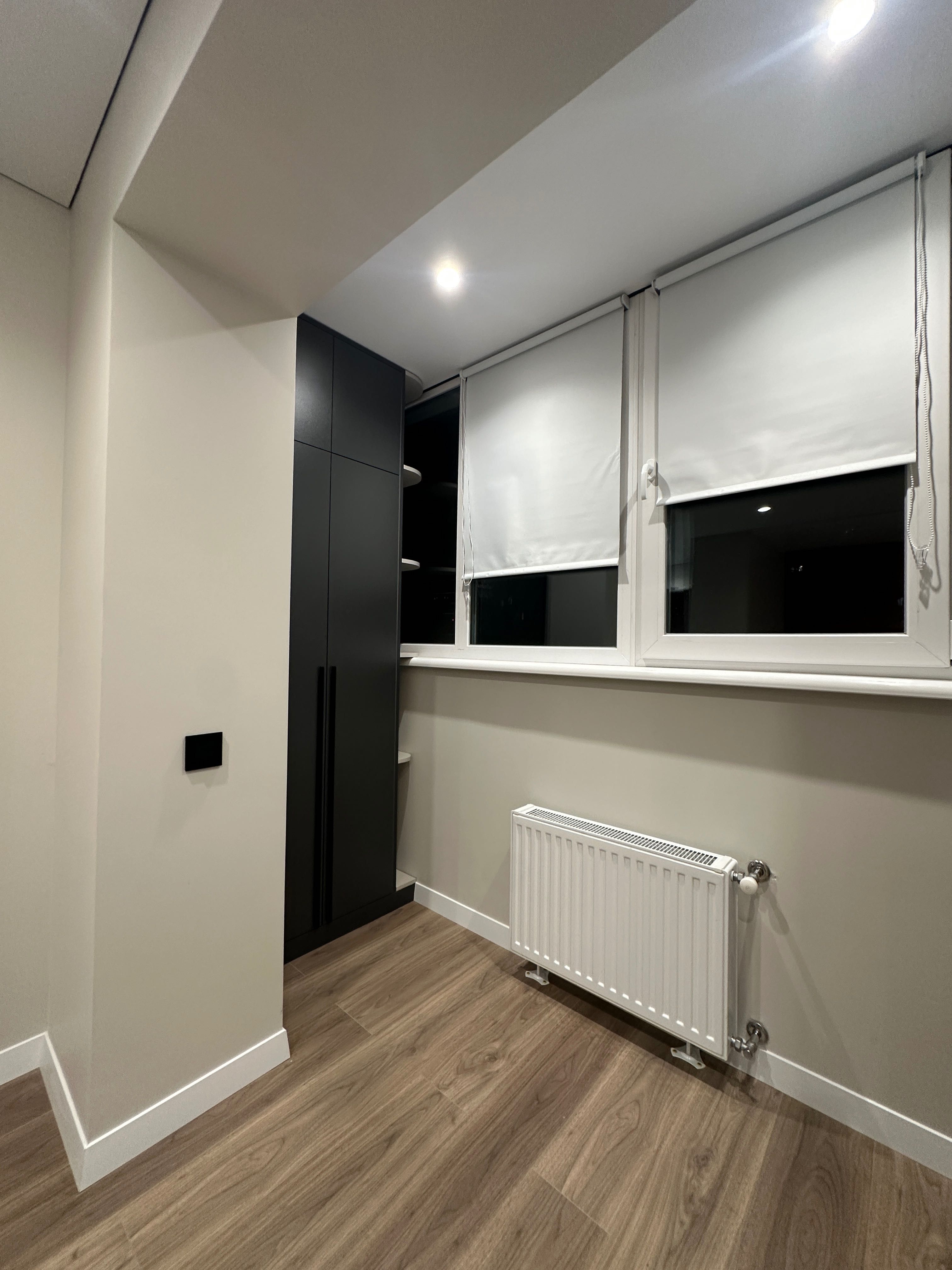 Інтер’єр витриманий у сучасному стилі. Установлено меблі індивідуального виготовлення, двері прихованого монтажу, додатковий радіатор у кімнаті, що робить квартиру дуже теплою.