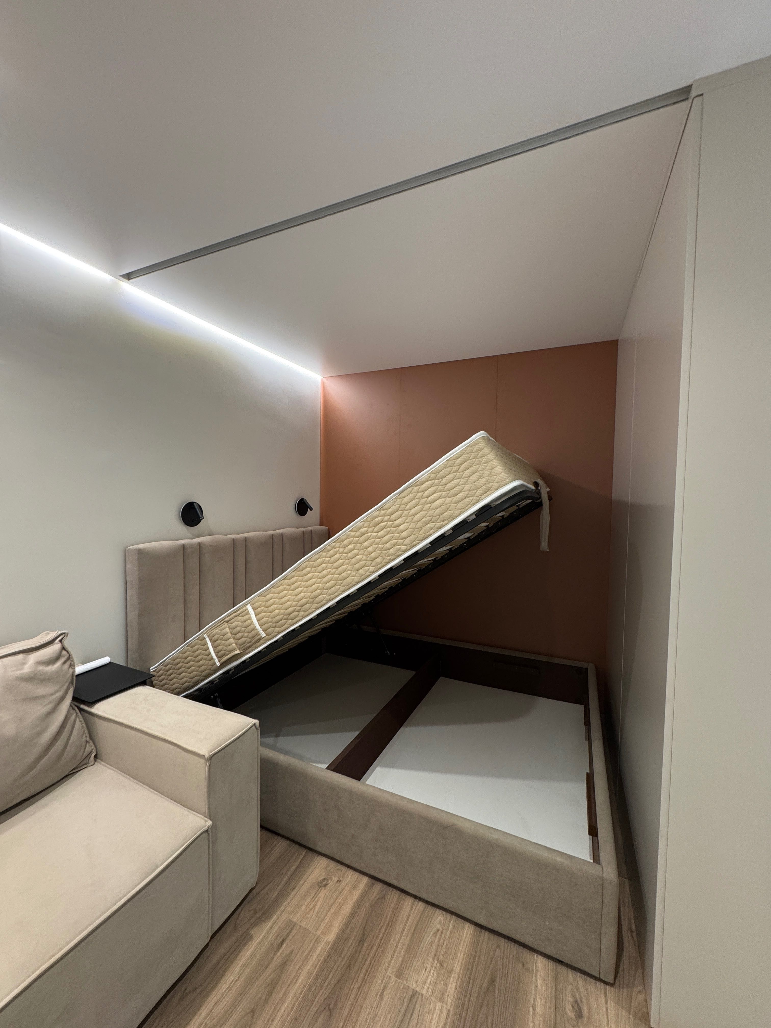 Квартира має зручне планування: окрема кухня, сумісний санвузол, а також відгороджена зона спальні, яку можна закрити шторою. Усе продумано до дрібниць — від освітлення до розміщення техніки.