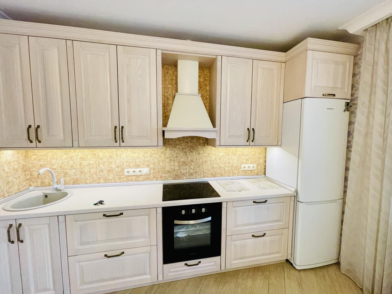 Простір облаштовано з урахуванням щоденних потреб: суміжний санвузол, тепла підлога, що працює від горизонтального опалення, електрична духовка, посудомийна машина на 80 л, кондиціонер з функцією охолодження, розкладний диван, стіл. Усі меблі та техніка залишаються.