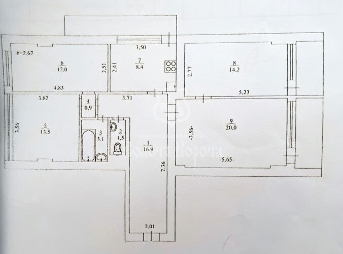 Квартира має площу 103 м2, житлова — 60 м2. Планування раціональне та зручне: окремі кімнати, просторий коридор, роздільний санвузол і кухня.