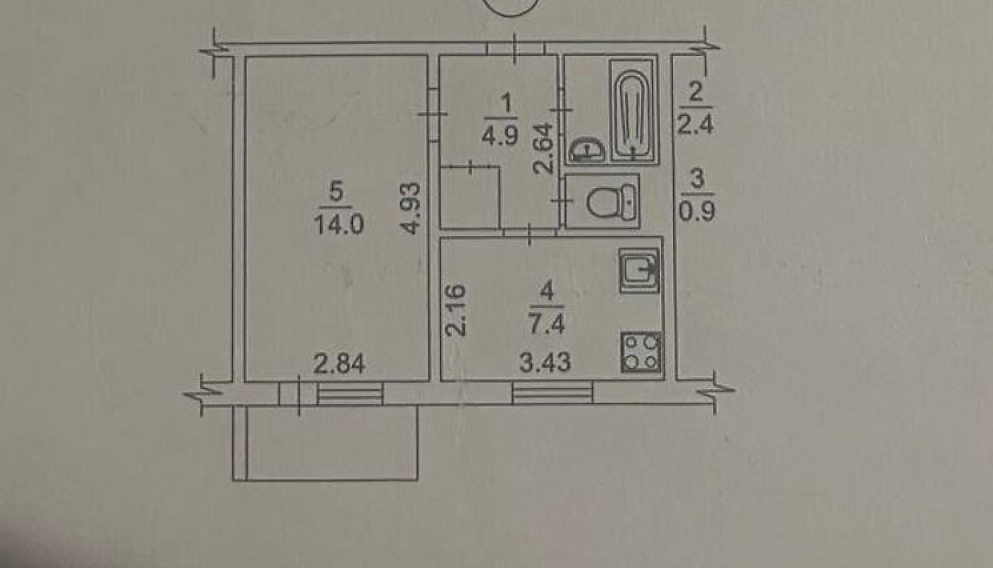 Загальна площа 30.40 м², житлова кімната 14 м², кухня 7.4 м², висота стель 2.57 м. Санвузол роздільний: окрема ванна кімната та туалет.