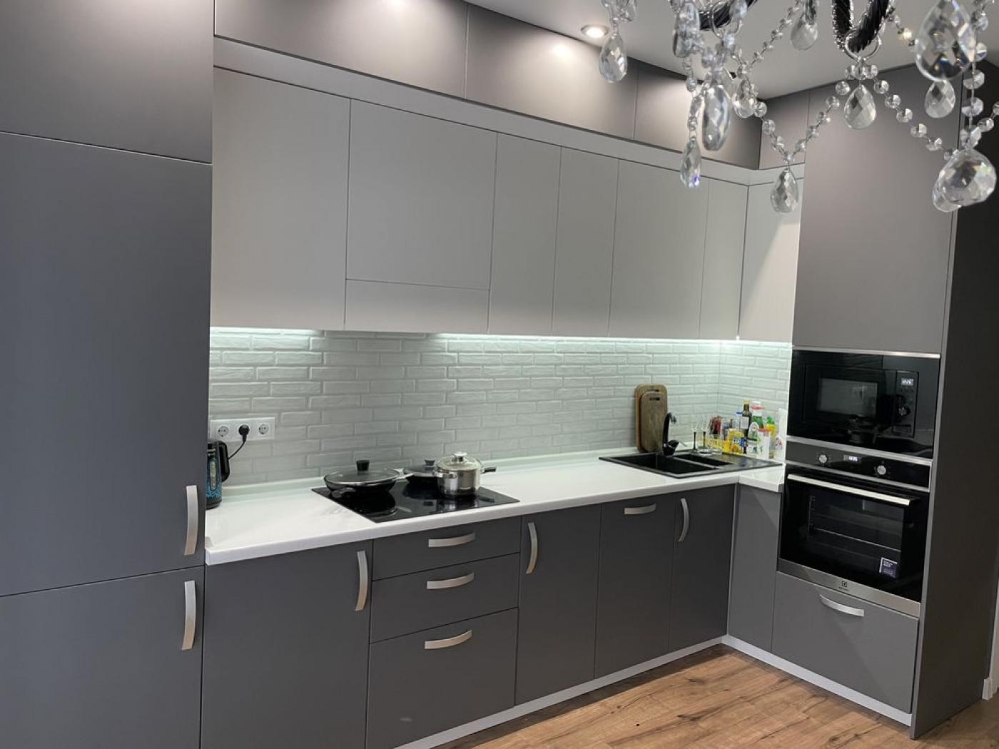 Вікна виходять у тихий двір, що додає затишку. Кухня повністю обладнана якісною побутовою технікою: варильна поверхня, духовка, витяжка, мікрохвильова піч, холодильник.