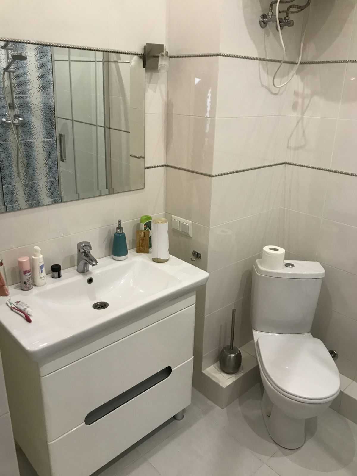 Санвузол суміжний, повністю облицьований плиткою, оснащений сучасною сантехнікою, душовою кабіною, бойлером, унітазом та пральною машинкою.