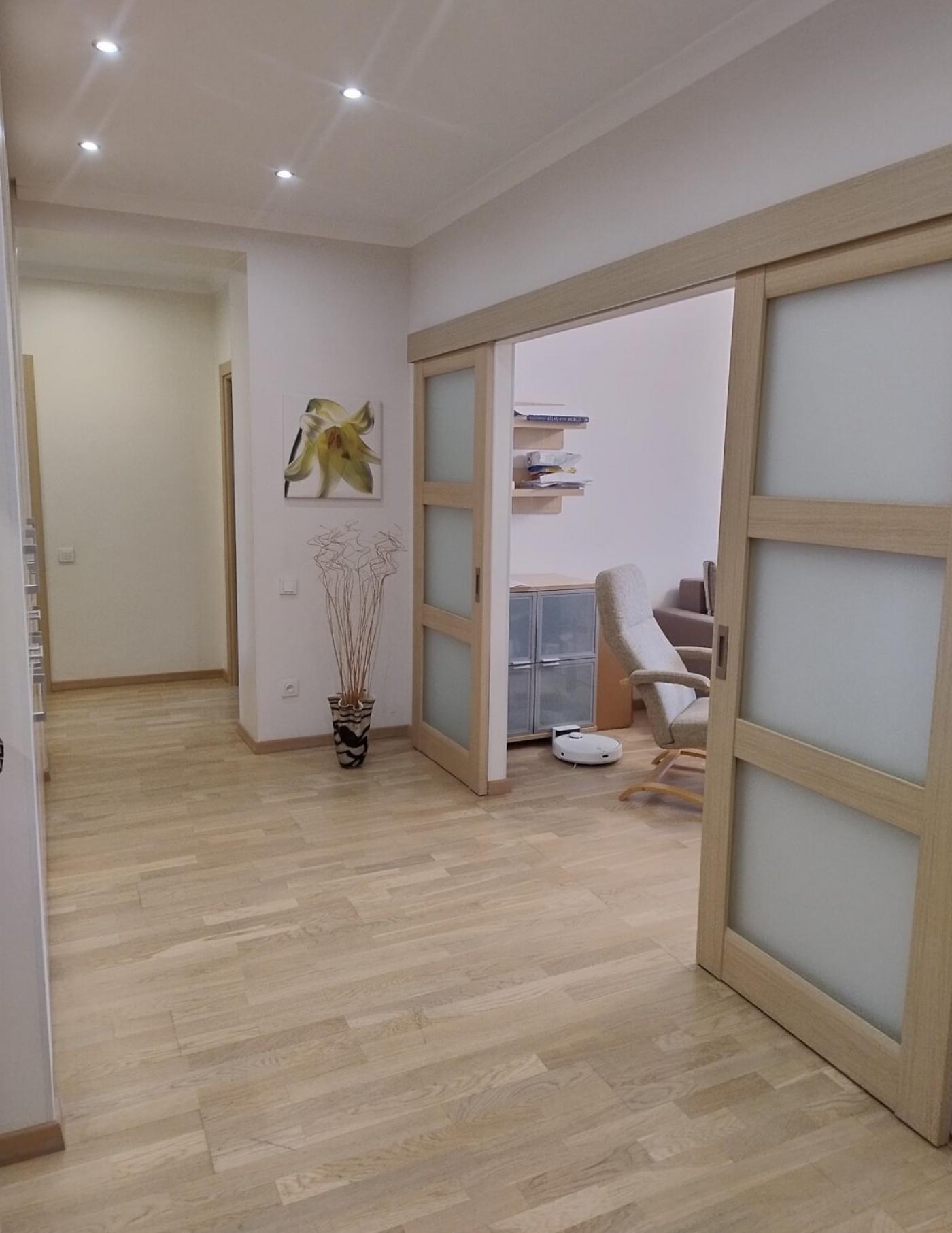 Загальна площа приміщення включає три кімнати розміром 19,8 м2, 17 м2 та 18,3 м2, інтегрований коридор площею 17,6 м2 та лоджії.