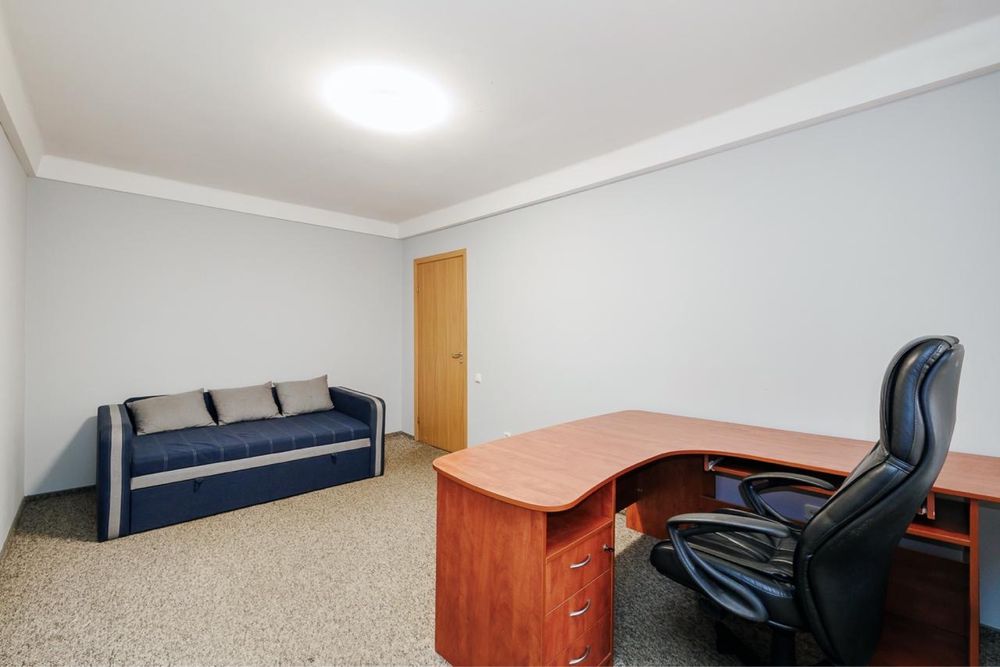 Інтер’єр продуманий до дрібниць. У вітальні — розкладний диван і два крісла з натуральної шкіри від «Екмі» з регульованими підголовниками, скляний трансформований стіл, великий робочий стіл і зручне шкіряне крісло — ідеальне місце для онлайн-роботи.