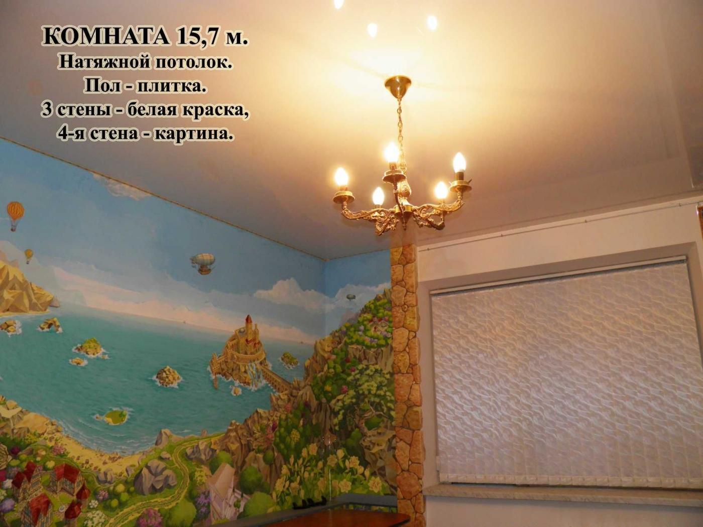 Стан квартири житловий. У кімнаті 15,7 м² зроблений якісний ремонт: натяжна стеля, утеплена гіпсокартонна стіна, біле фарбування та оригінальний художній розпис із пейзажем.