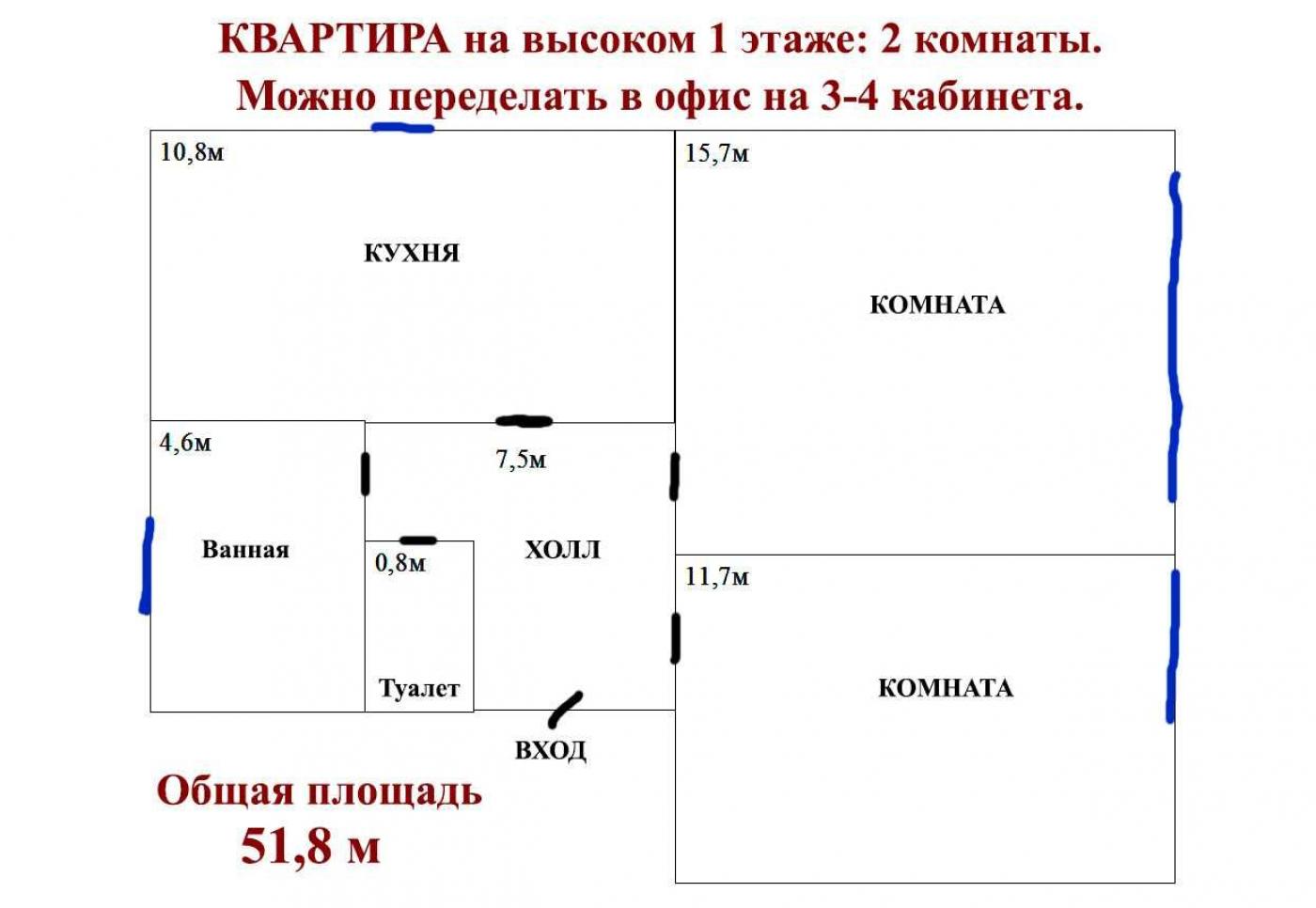 Загальна площа квартири становить 51,8 м², висота стелі — 2,8 м. Планування дуже зручне, майже квадратне, у форматі «орілки». Є дві кімнати площею 11,7 м² та 15,7 м², кухня 10,8 м², передпокій 7,5 м², санвузол роздільний (туалет 0,8 м², ванна 4,6 м²).