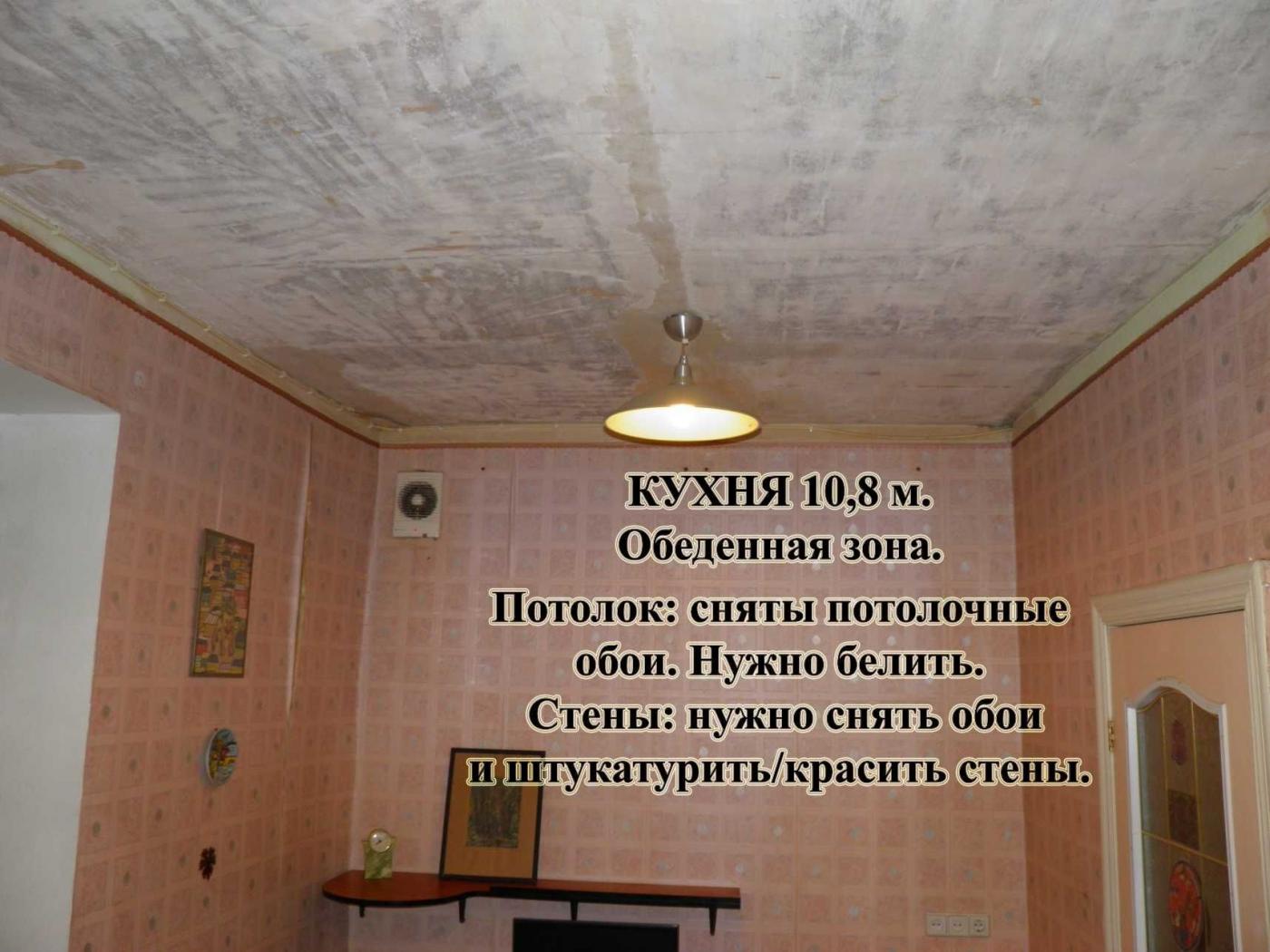 У другій кімнаті — шпалери під фарбування. У кухні частина стін облицьована плиткою, інша потребує оновлення, стеля підготовлена під побілку.