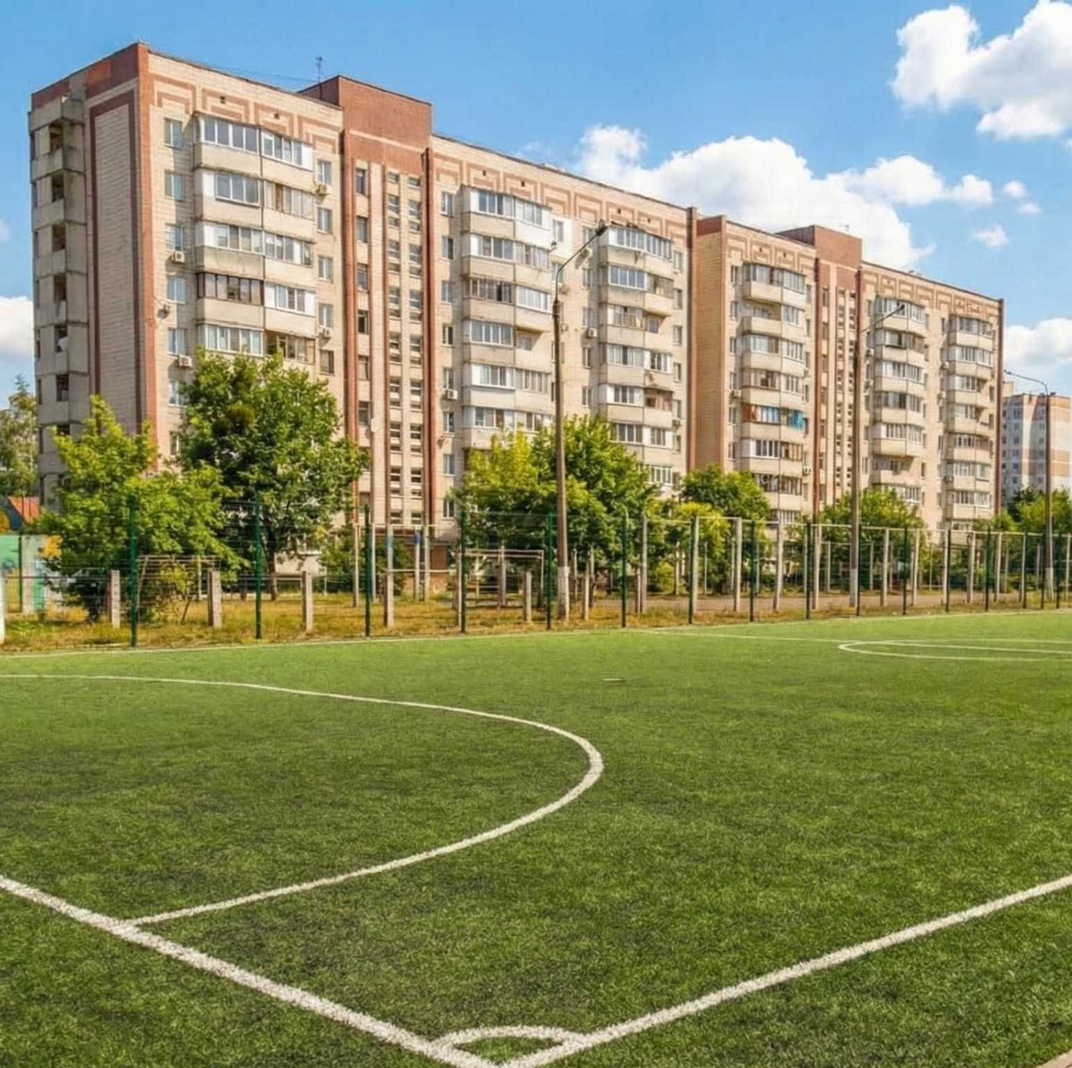У дворі — школа та дитячий садок, які видно з вікон, без потреби переходити дорогу, також є футбольне поле. Поруч супермаркети, великий доглянутий парк з озером та зонами для відпочинку.