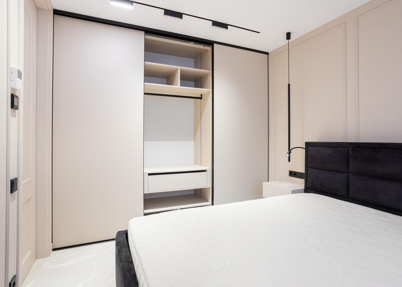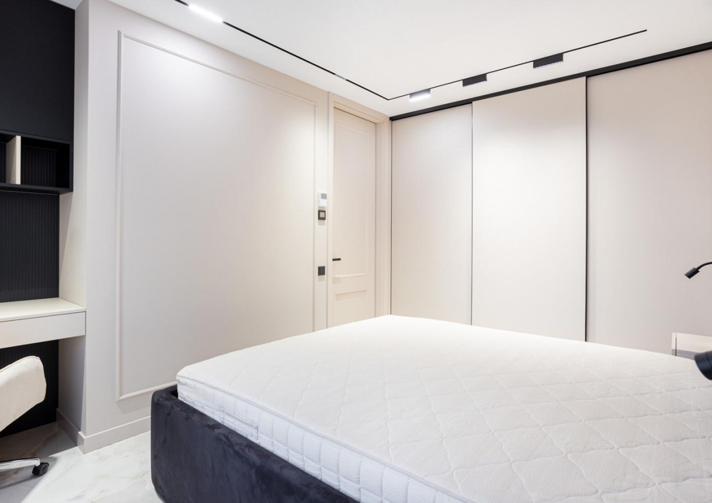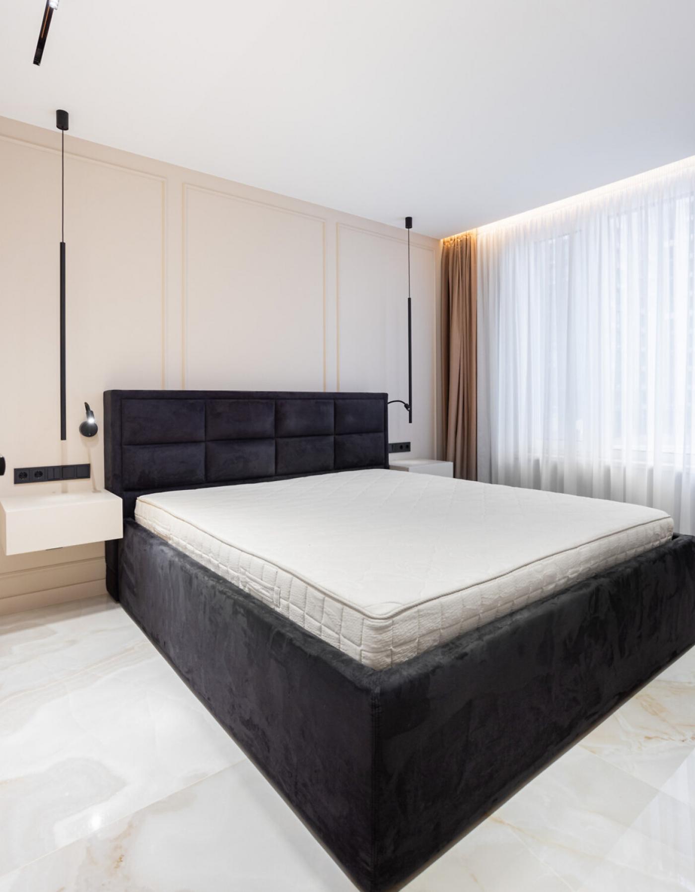 Спальна зона облаштована великим ліжком розміром 2000×2300 мм із підйомним механізмом. Матрац із цільної латексної плити забезпечує максимальний комфорт, а оббивка м’яких меблів має властивість «антикіготь».
