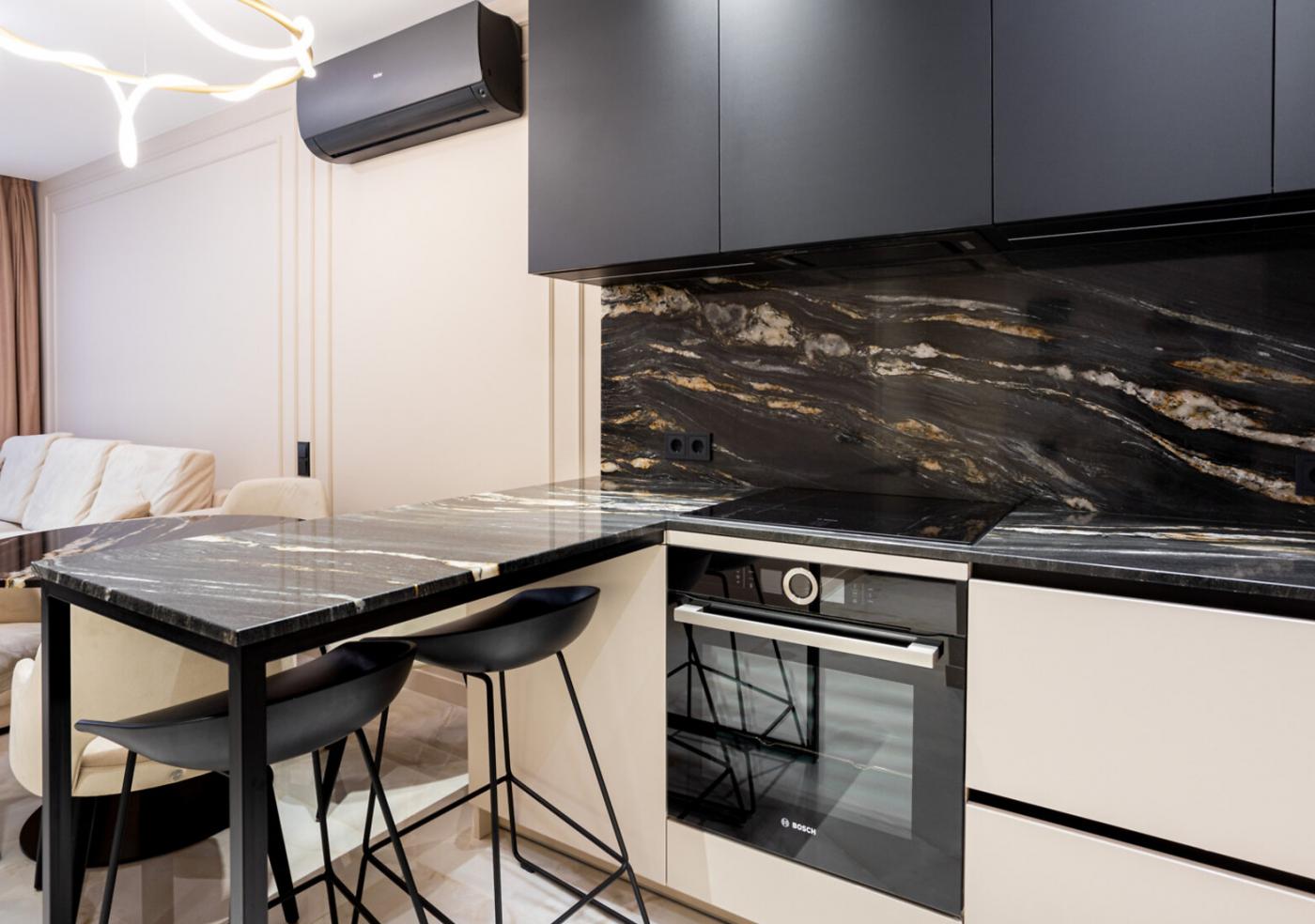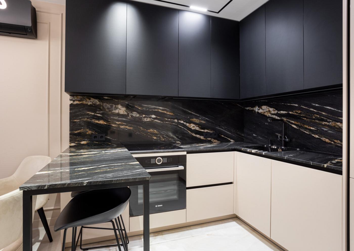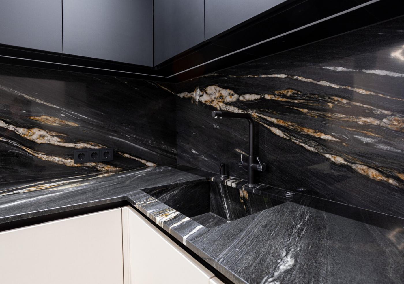 Кухня оформлена натуральним кварцитом Quarzite African Fusion, фасади виконані з МДФ у комбінації з ДСП, фурнітура Blum. Є система зворотного осмосу для питної води та подрібнювач відходів Franke.