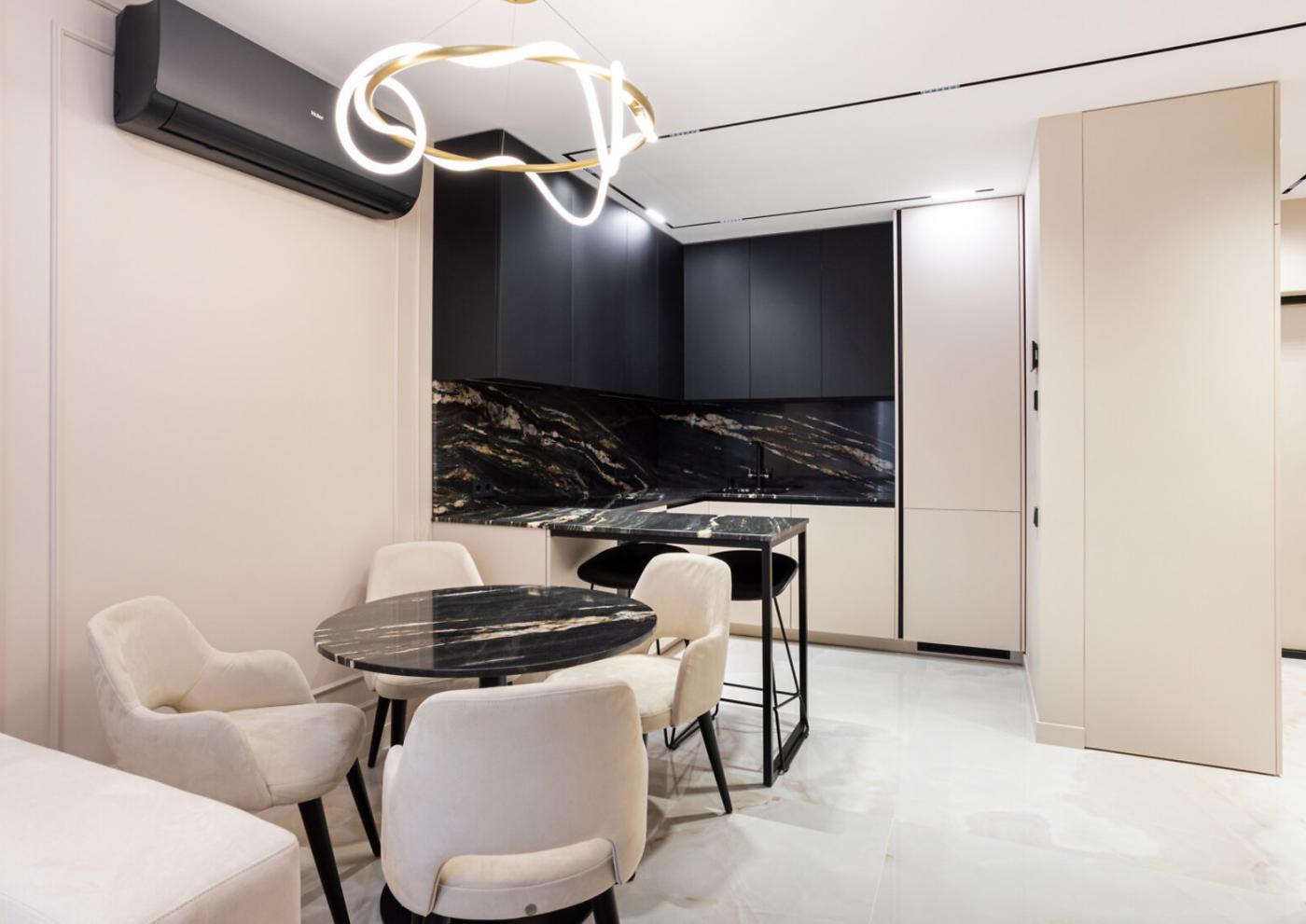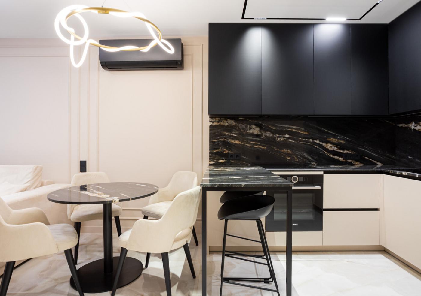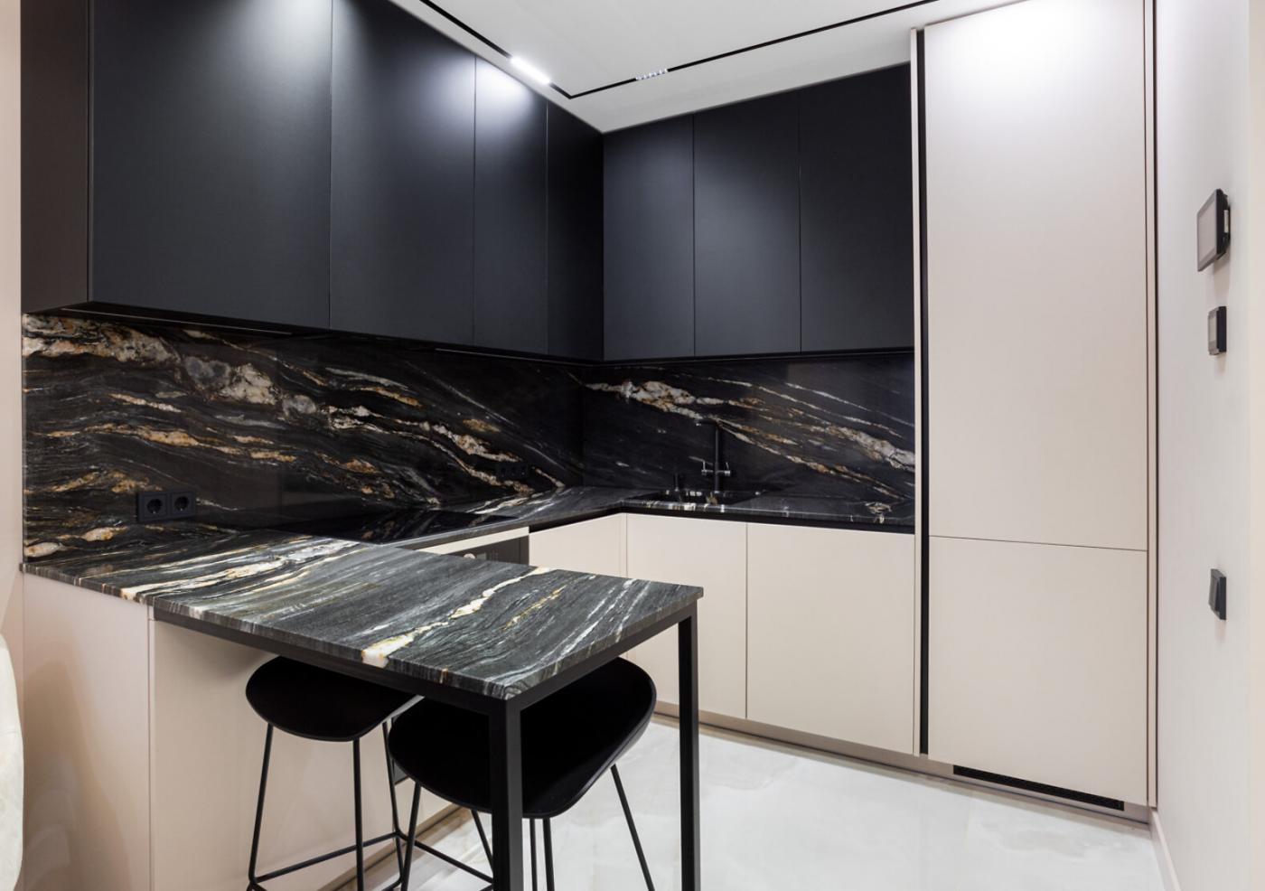 Кухня оформлена натуральним кварцитом Quarzite African Fusion, фасади виконані з МДФ у комбінації з ДСП, фурнітура Blum. Є система зворотного осмосу для питної води та подрібнювач відходів Franke.