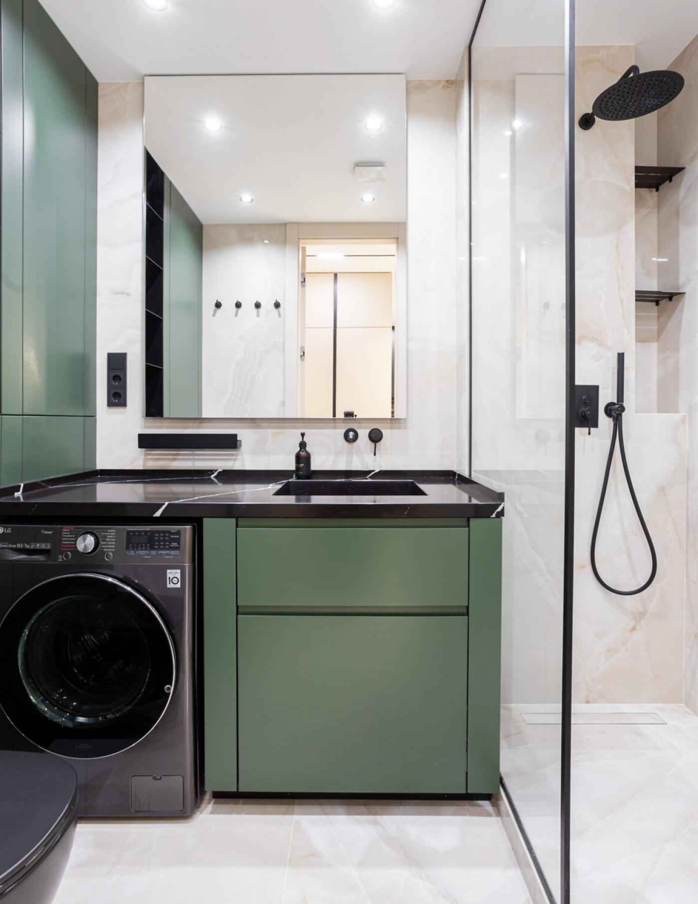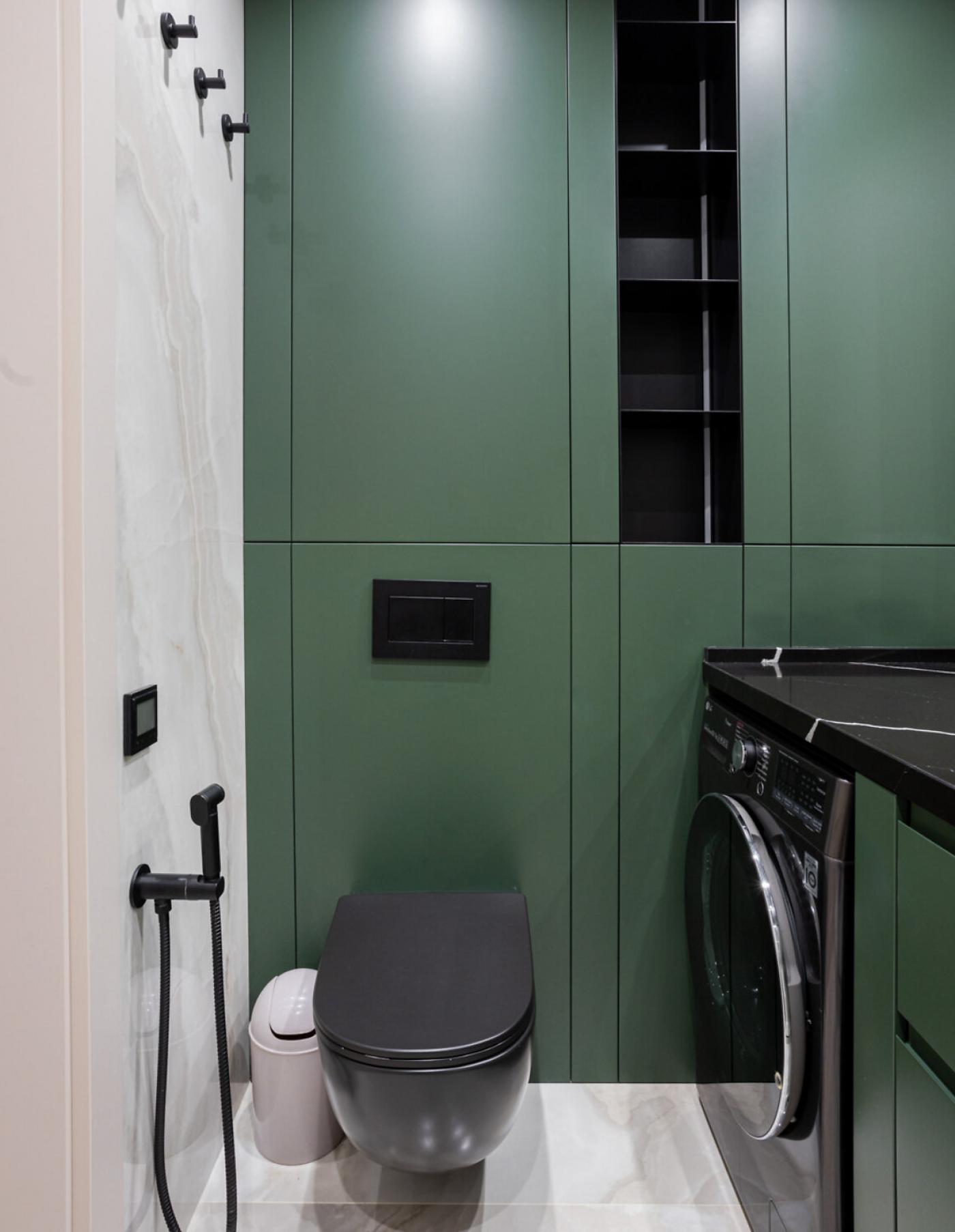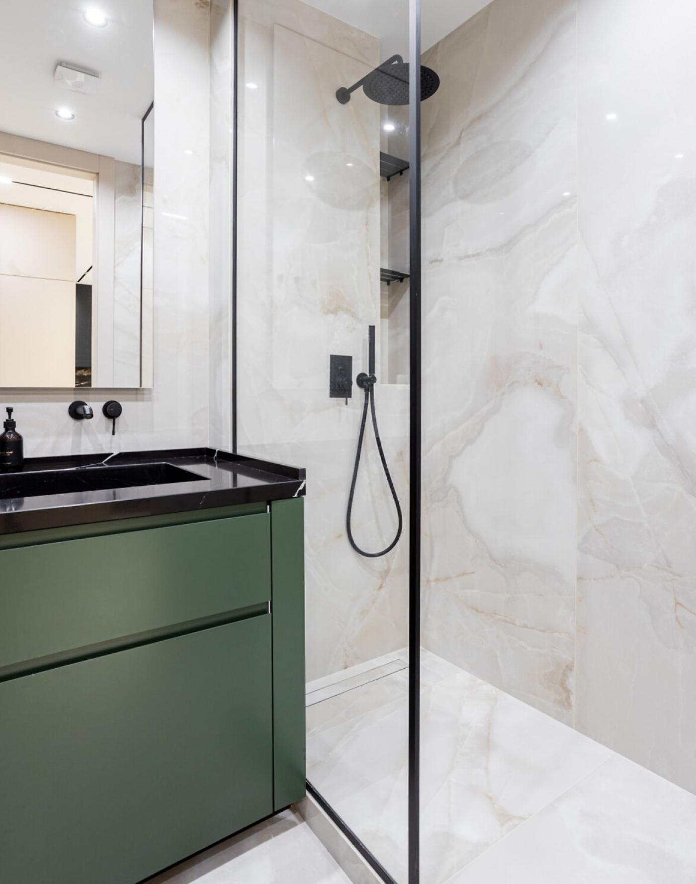 Ремонт виконано з акцентом на якість та довговічність: повна звукоізоляція стін і стелі, тепла електрична підлога по всій площі та тепла стіна, великоформатний керамограніт, сучасний електрощит із реле напруги.