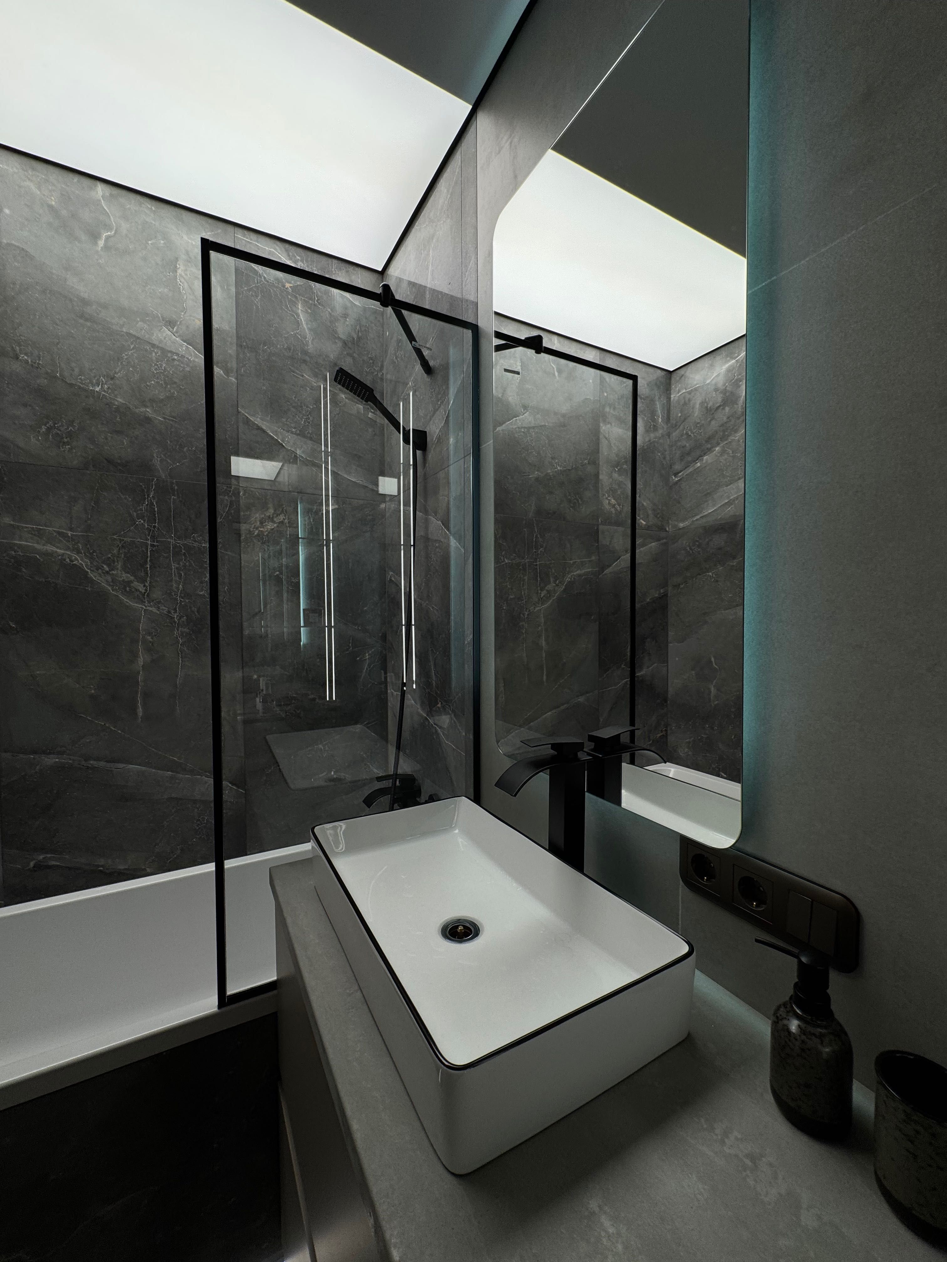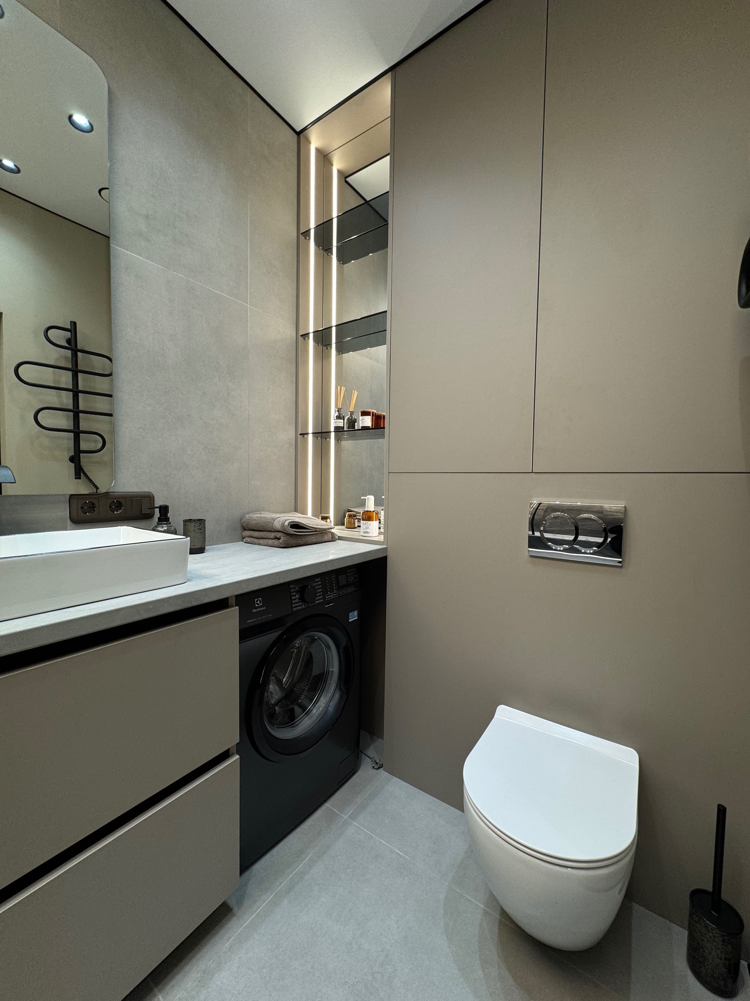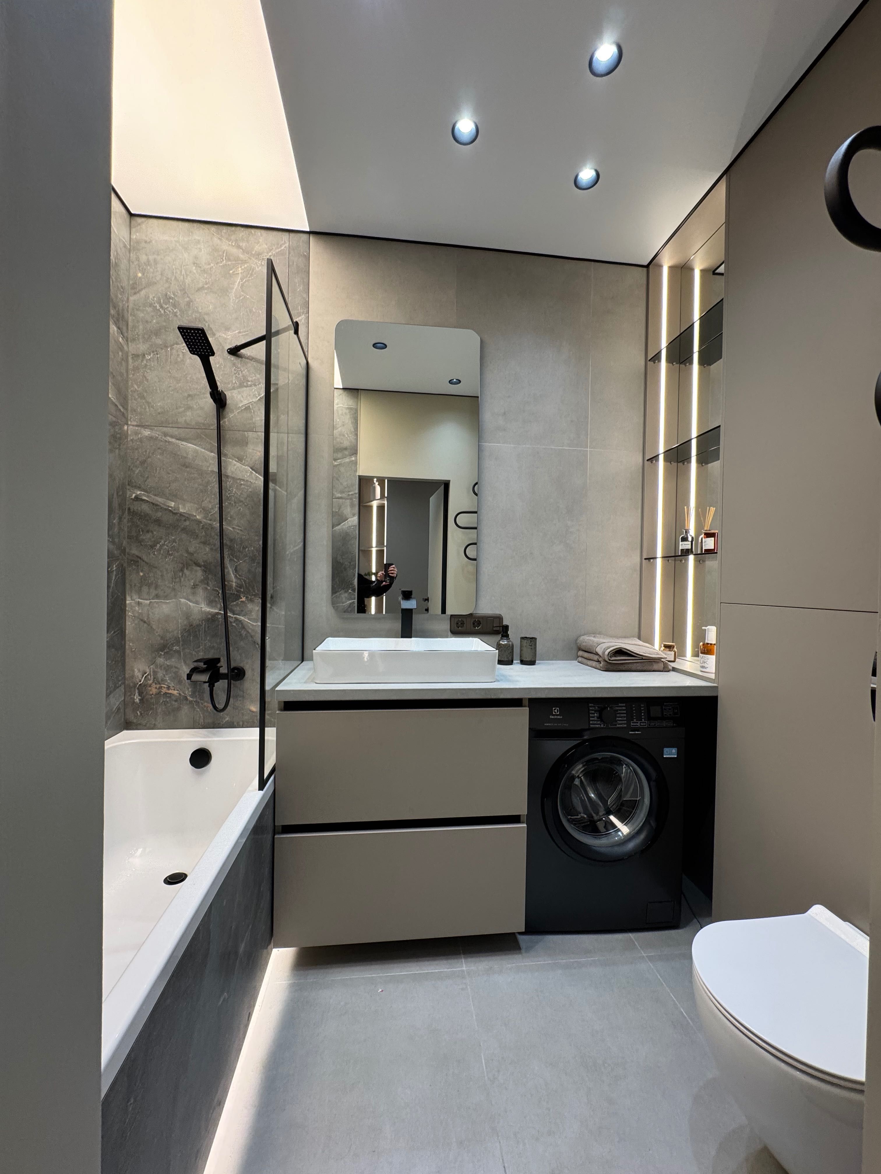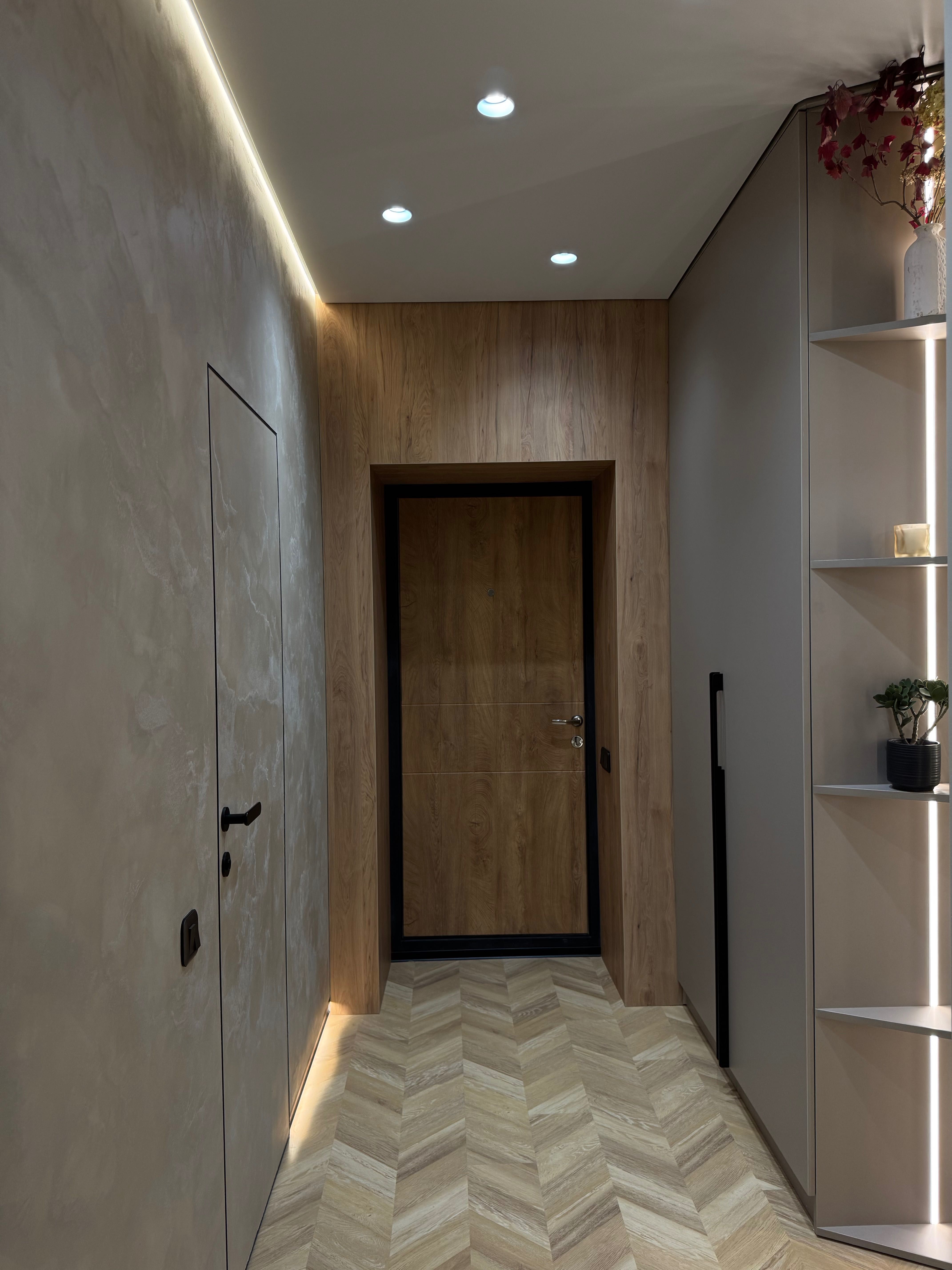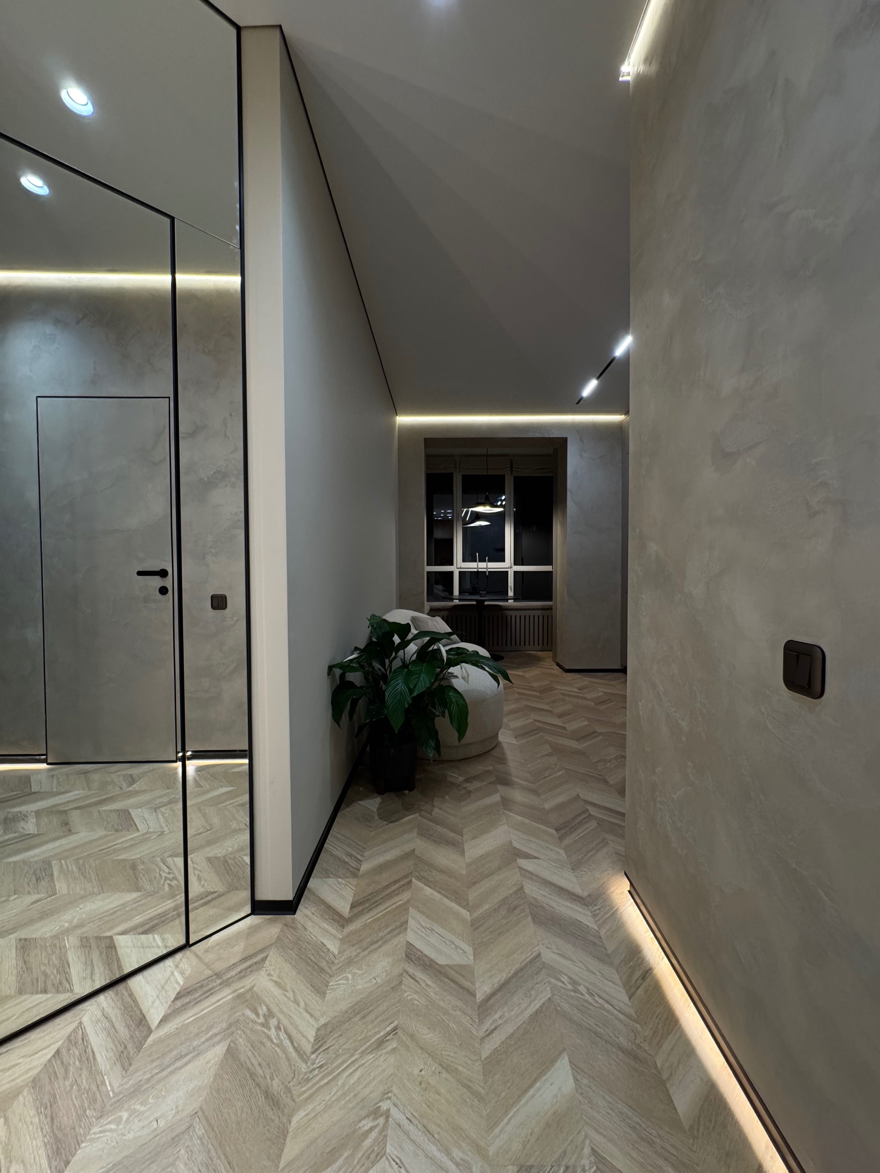 Гармонійно підібрані кольори з чорними деталями додають сучасного характеру. Дзеркальні елементи візуально розширюють простір, а численні місця для зберігання роблять квартиру максимально функціональною.