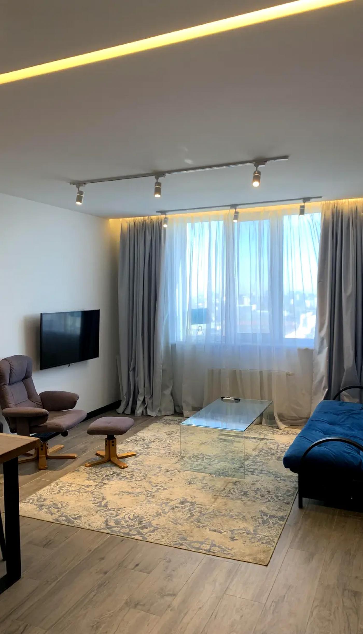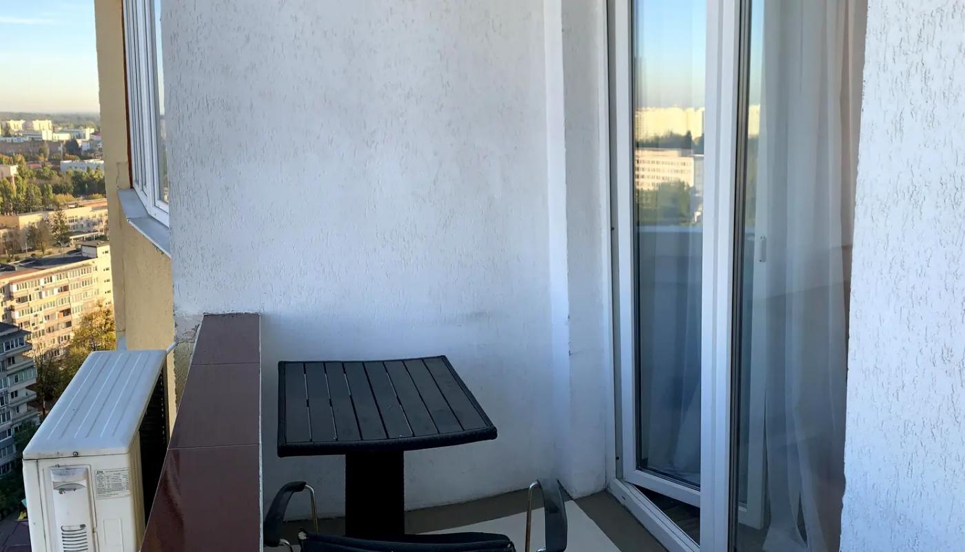 Помешкання розташоване на високому 18-му поверсі, звідки відкривається захопливий панорамний краєвид на центр Києва, що особливо вражає у вечірній час.