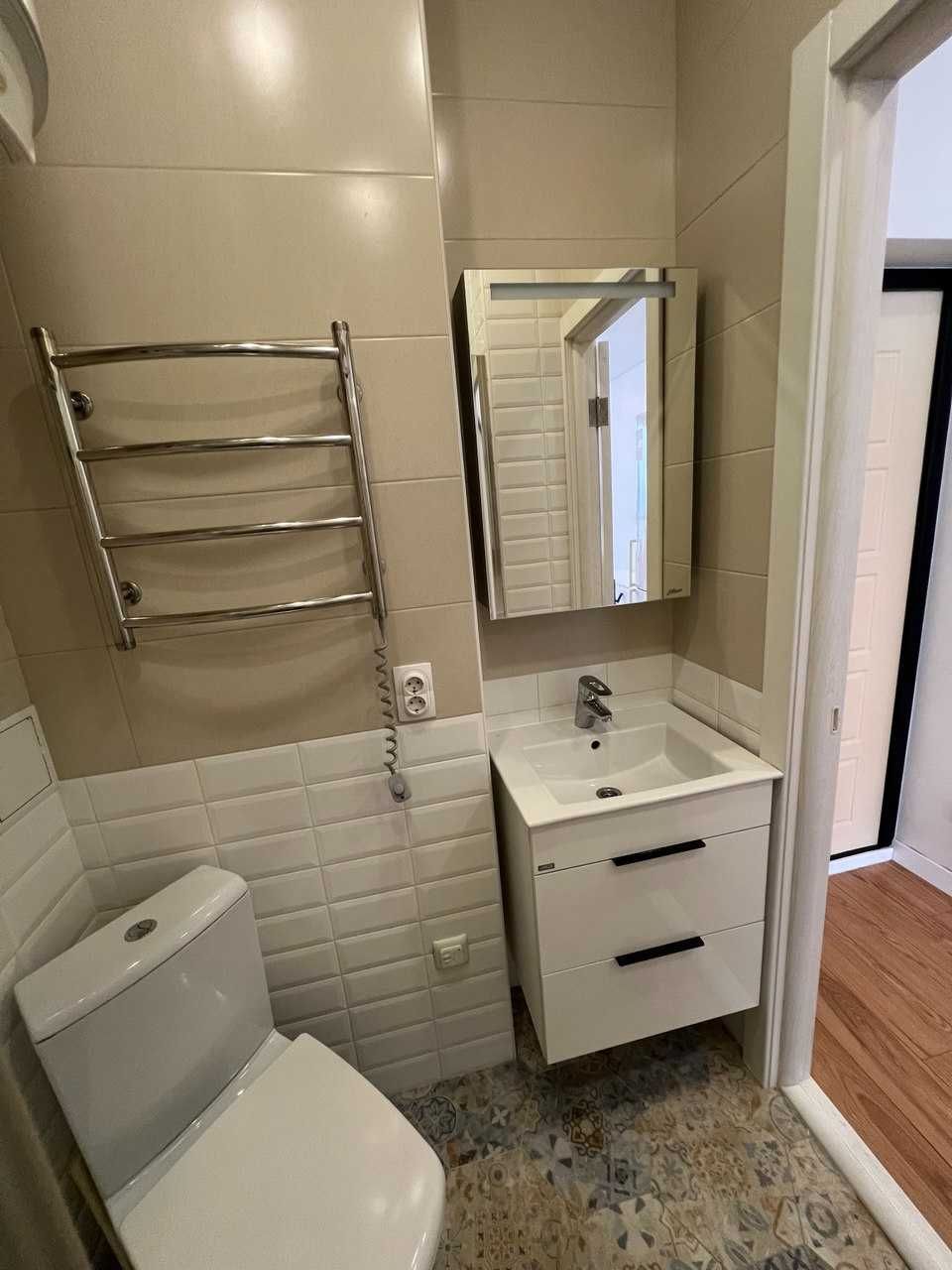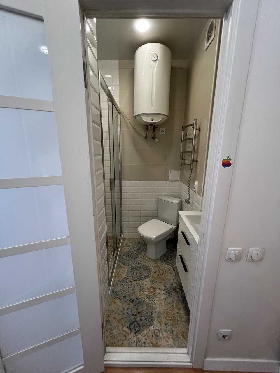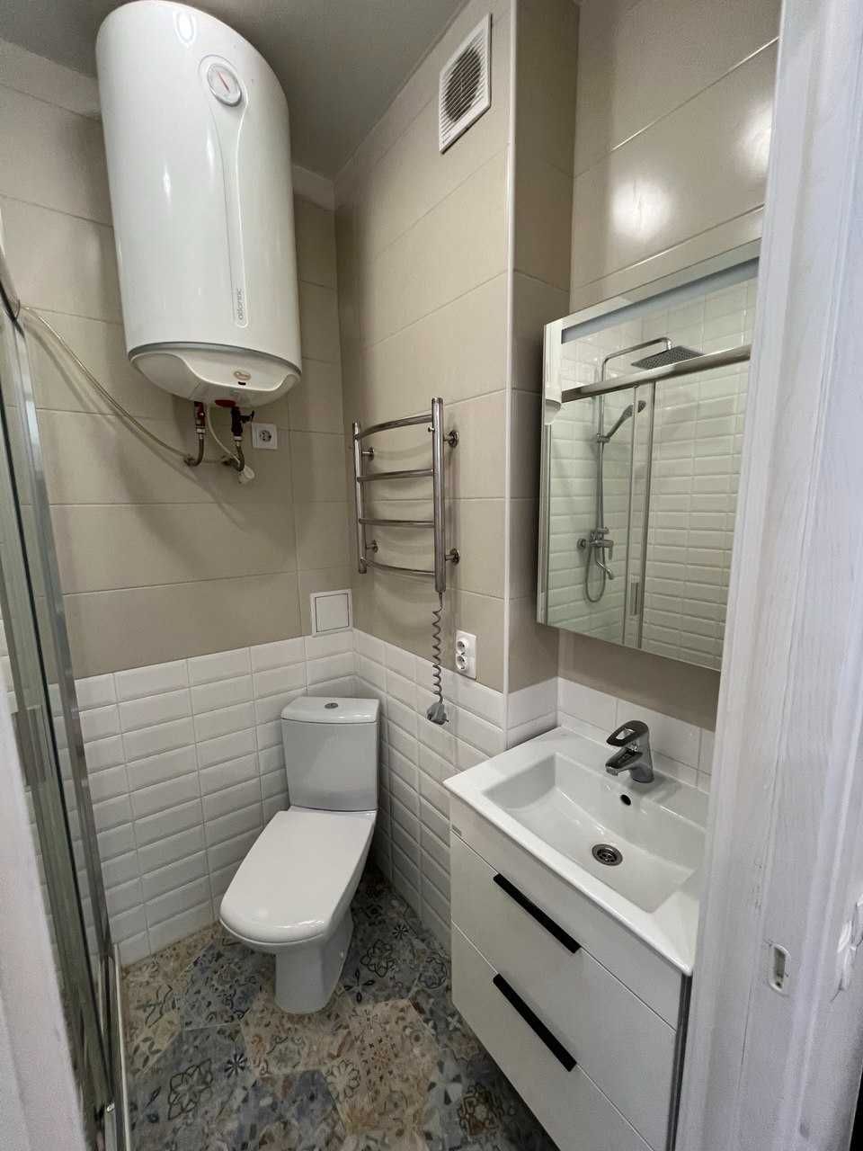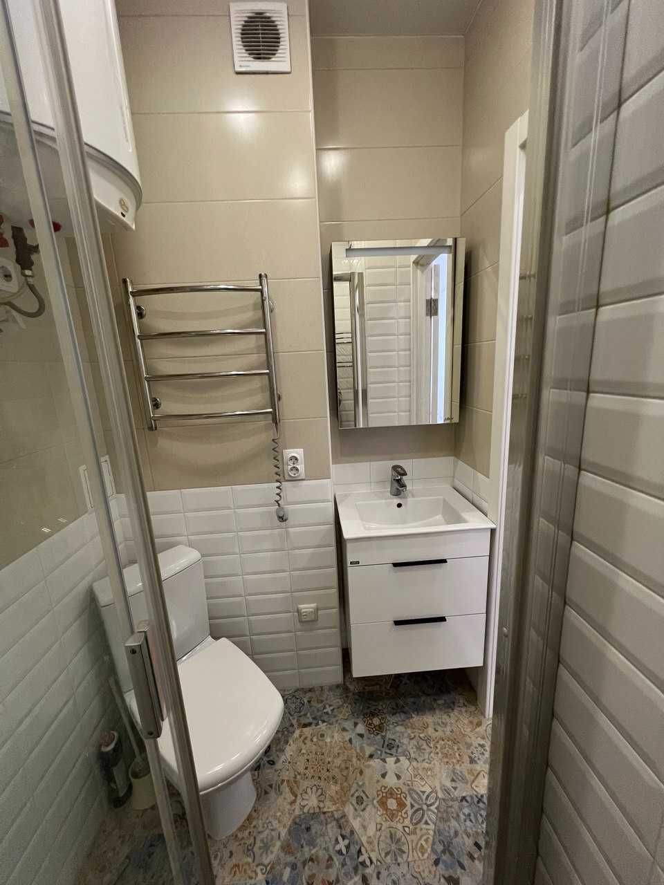 У ванній кімнаті зроблено якісну гідроізоляцію, встановлено простору душову кабіну, бойлер та теплу підлогу з терморегулятором для вашого комфорту.