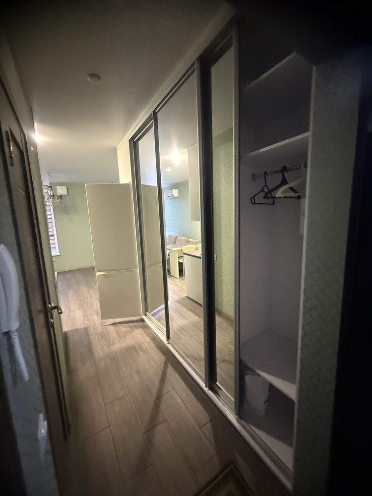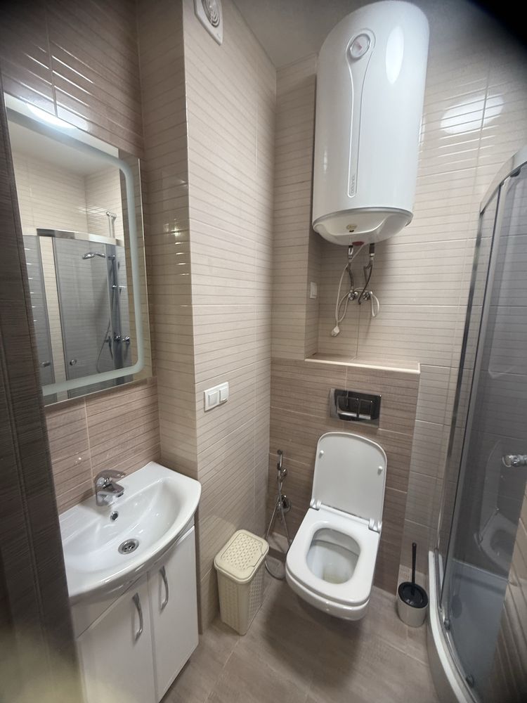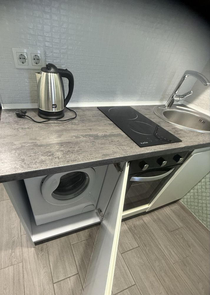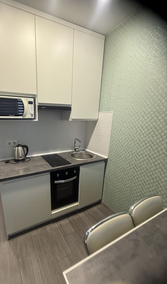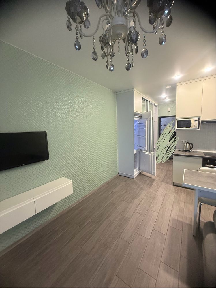 Планування формату кухня-студія дозволило грамотно розділити простір на декілька зон: комфортну зону відпочинку, затишну кухню-їдальню та прихожу. Особливістю інтер’єру є величезна вбудована шафа, яка з легкістю вміщує всі необхідні речі, зберігаючи відчуття простору. Квартира повністю облаштована необхідною технікою та меблями, а її стан на сто відсотків відповідає фотографіям. Це ідеальний варіант за принципом «заїжджай і живи», де вам знадобляться лише особисті речі для початку нового етапу життя в комфортних умовах.