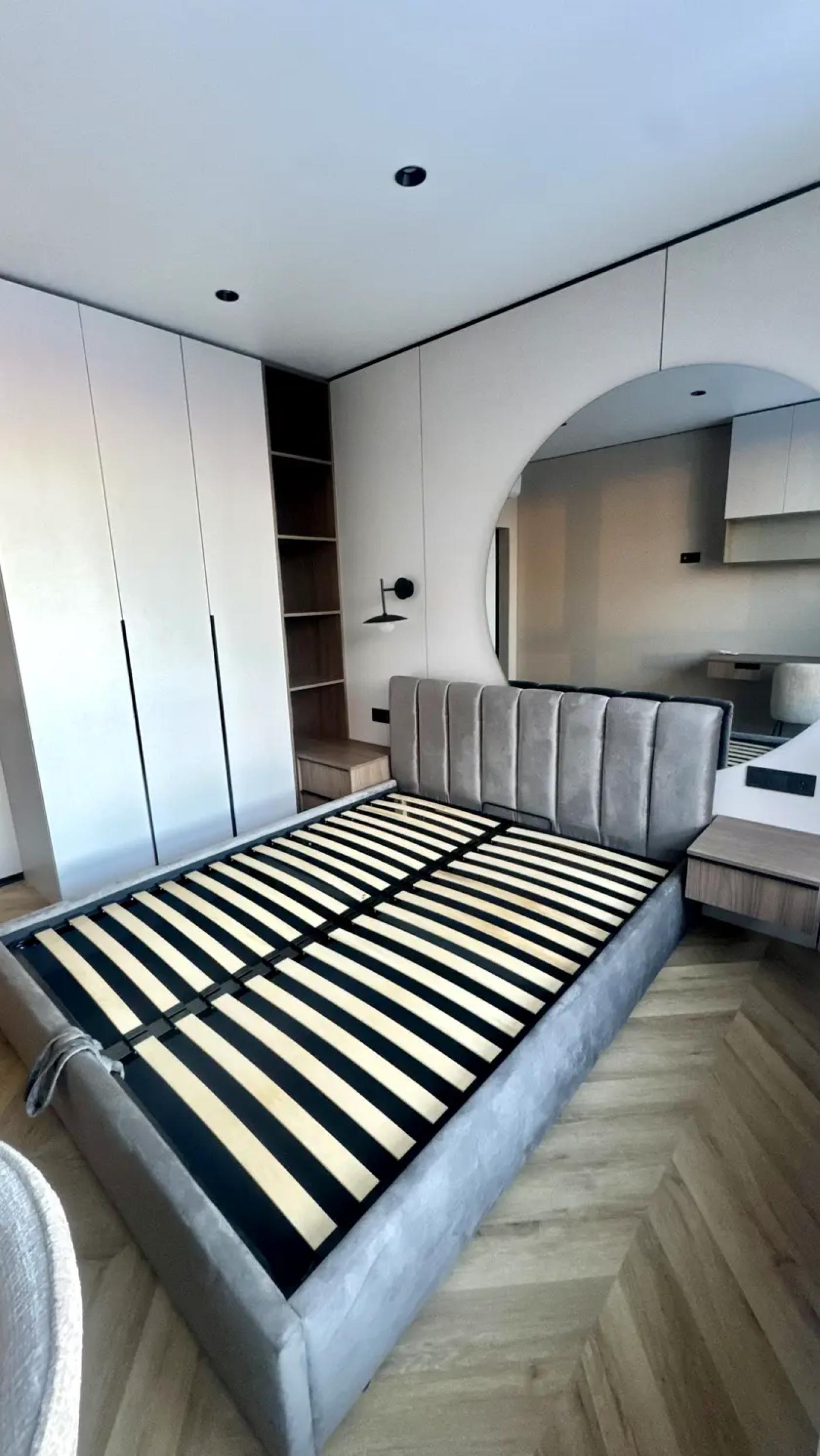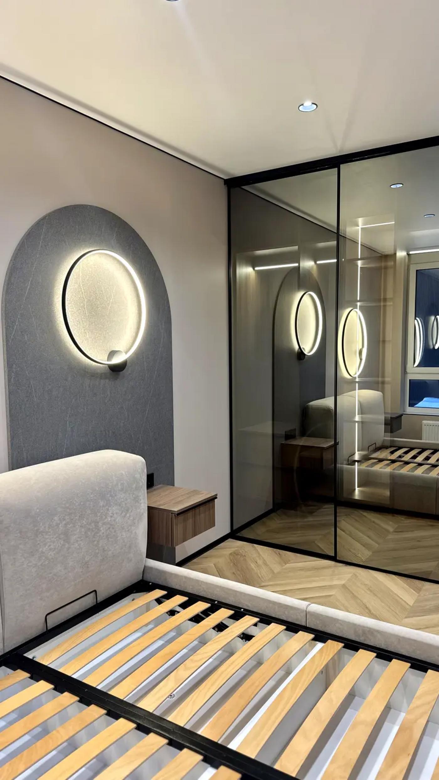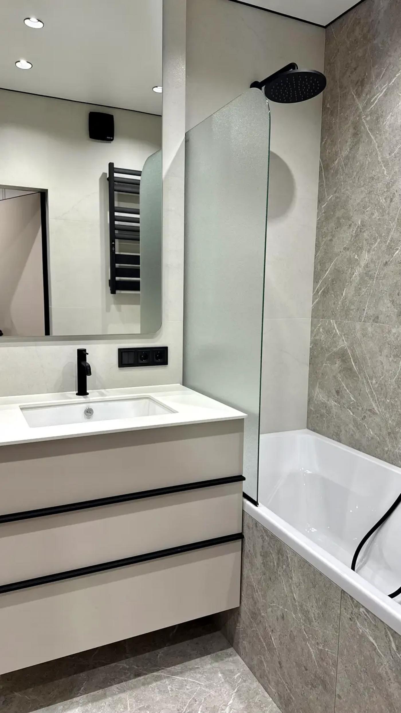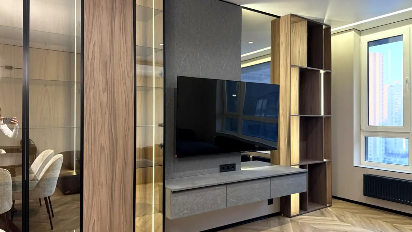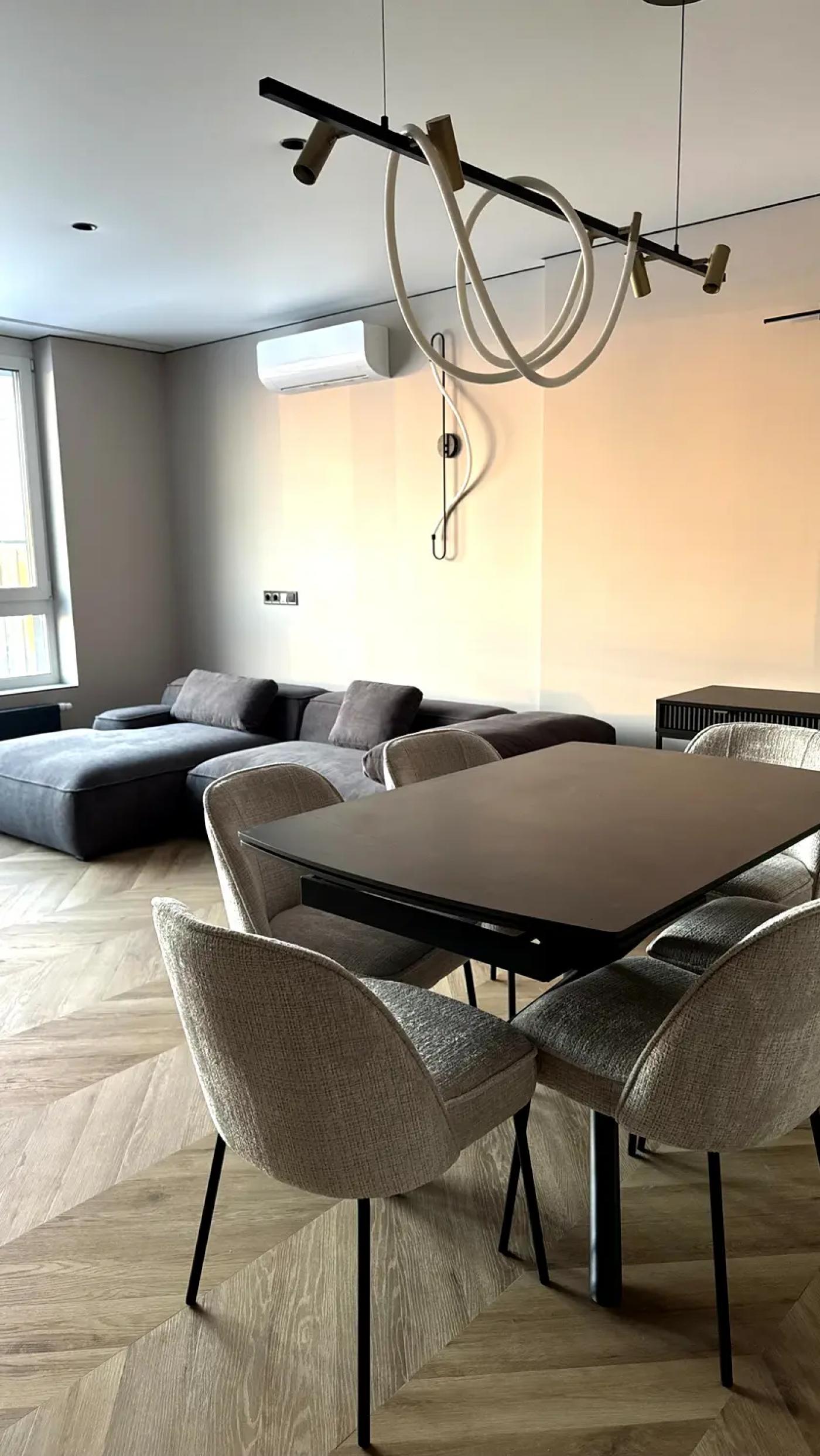 В квартирі виконано дизайнерський ремонт. Продумане планування включає дві окремі спальні, два санвузли, простору кухню-вітальню та містку гардеробну. Особливістю інтер’єру є велика кількість дзеркал, що візуально розширюють простір, та професійно облаштовані зони для роботи. Усі меблі виготовлені за індивідуальним замовленням брендом Beri.zhivi з використанням фурнітури Blum. Кухня оснащена фасадами з МДФ, керамогранітною стільницею та повною лінійкою вбудованої техніки Bosch. Оселя укомплектована набором пральної та сушильної машин Samsung, кондиціонерами Cooper & Hunter у кожній кімнаті та сантехнікою від провідних виробників Італії та Іспанії.