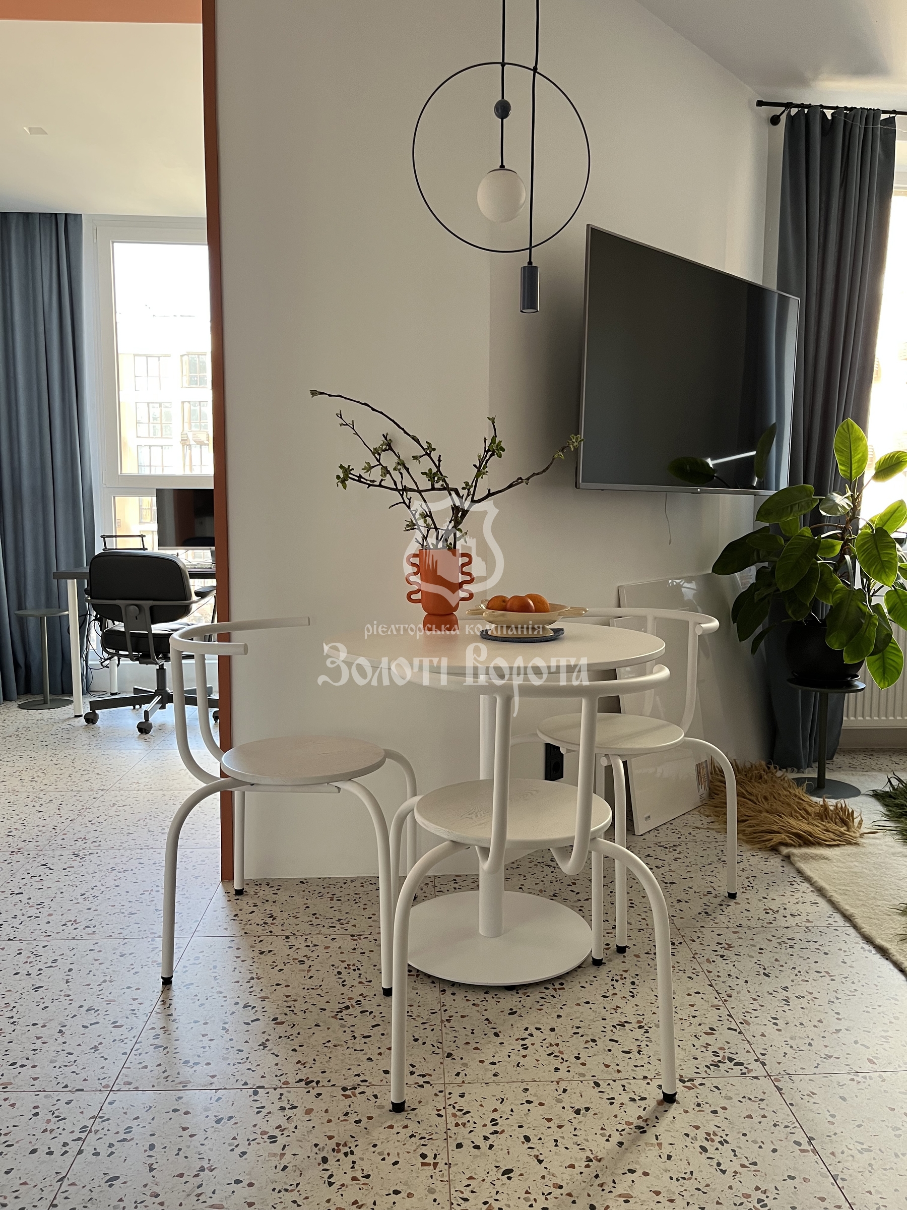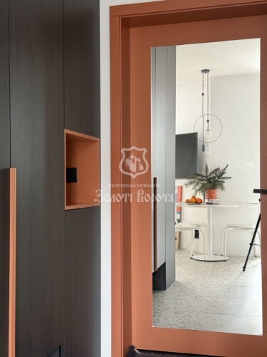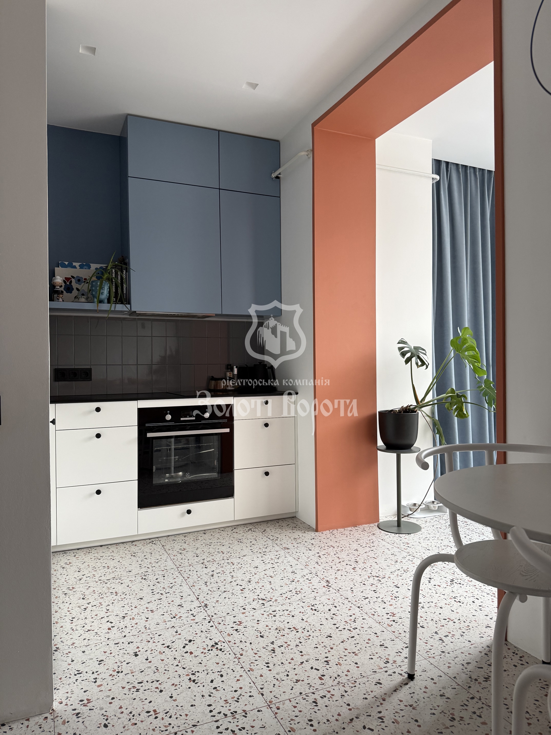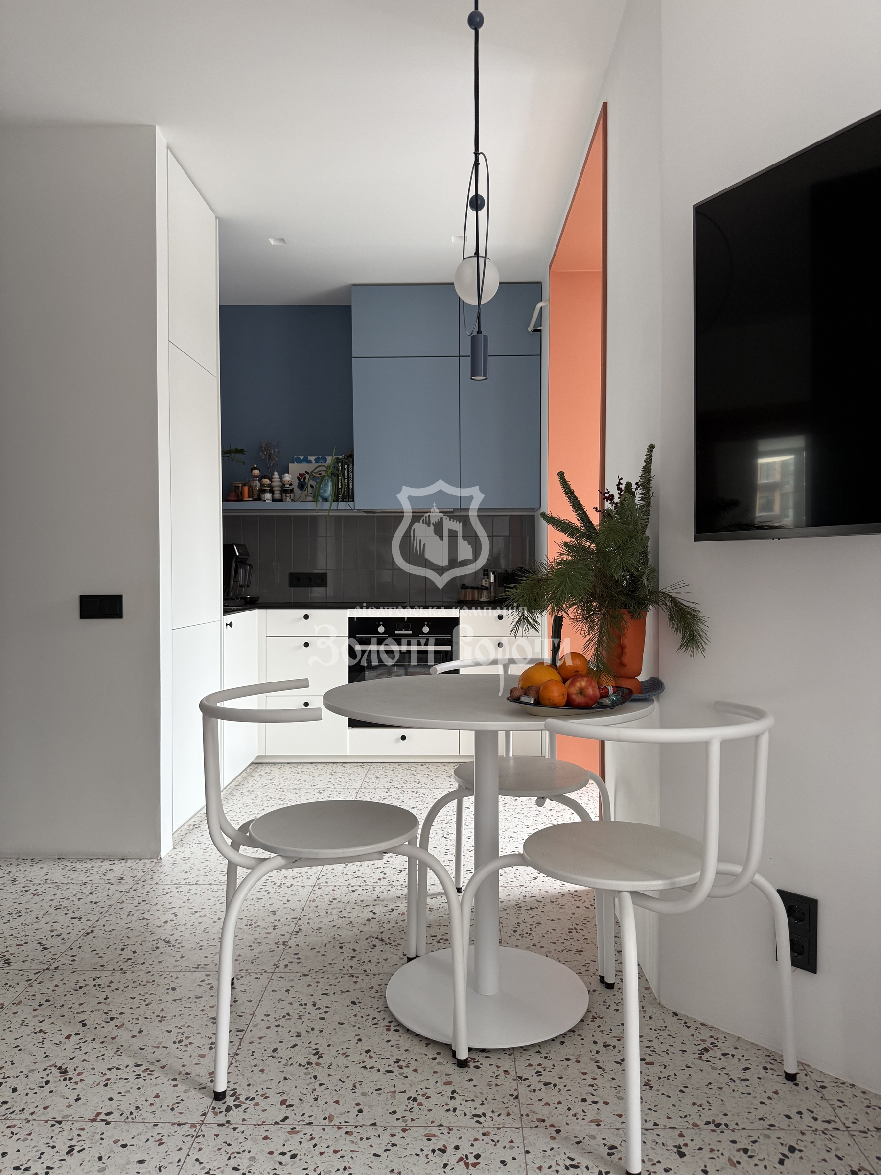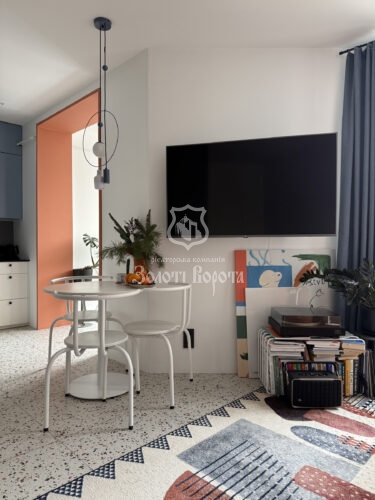 Дизайн виконано за авторським проєктом у стилі Soft Memphis з елементами скандинавського мінімалізму, де кожен метр використано максимально ефективно. Простір професійно зонований: виділена спальня-вітальня з модульним диваном від Faid, простора кухня з акцентним порталом та облаштоване робоче місце для двох осіб біля панорамного вікна з кондиціонером Cooper&Hunter. Особливістю квартири є повна безбар’єрність — італійський керамограніт Terrazzo укладено єдиним контуром без порогів.