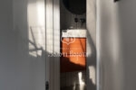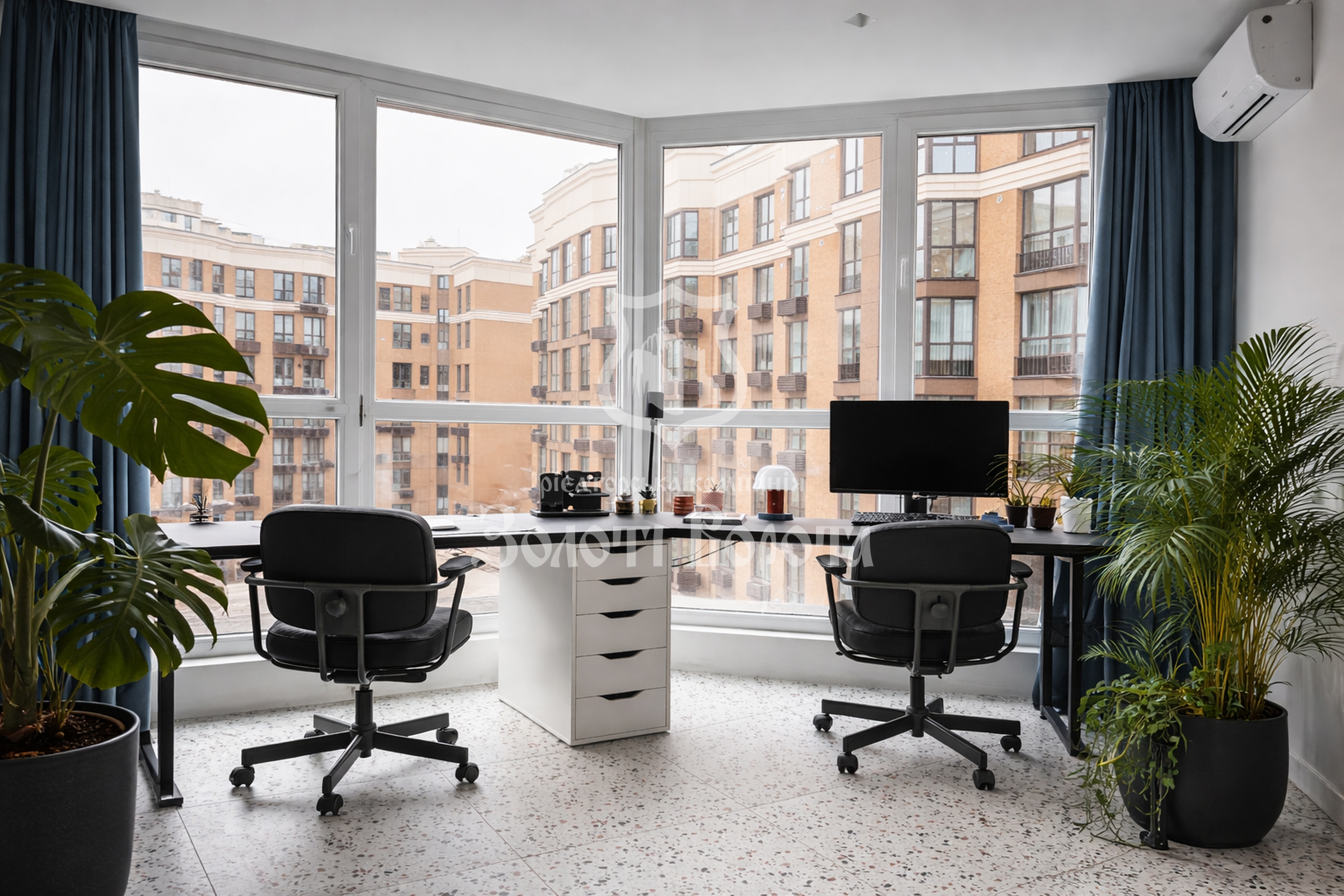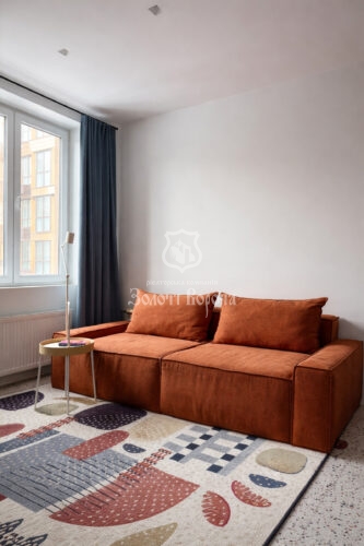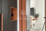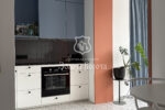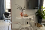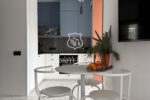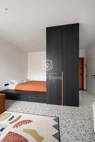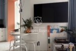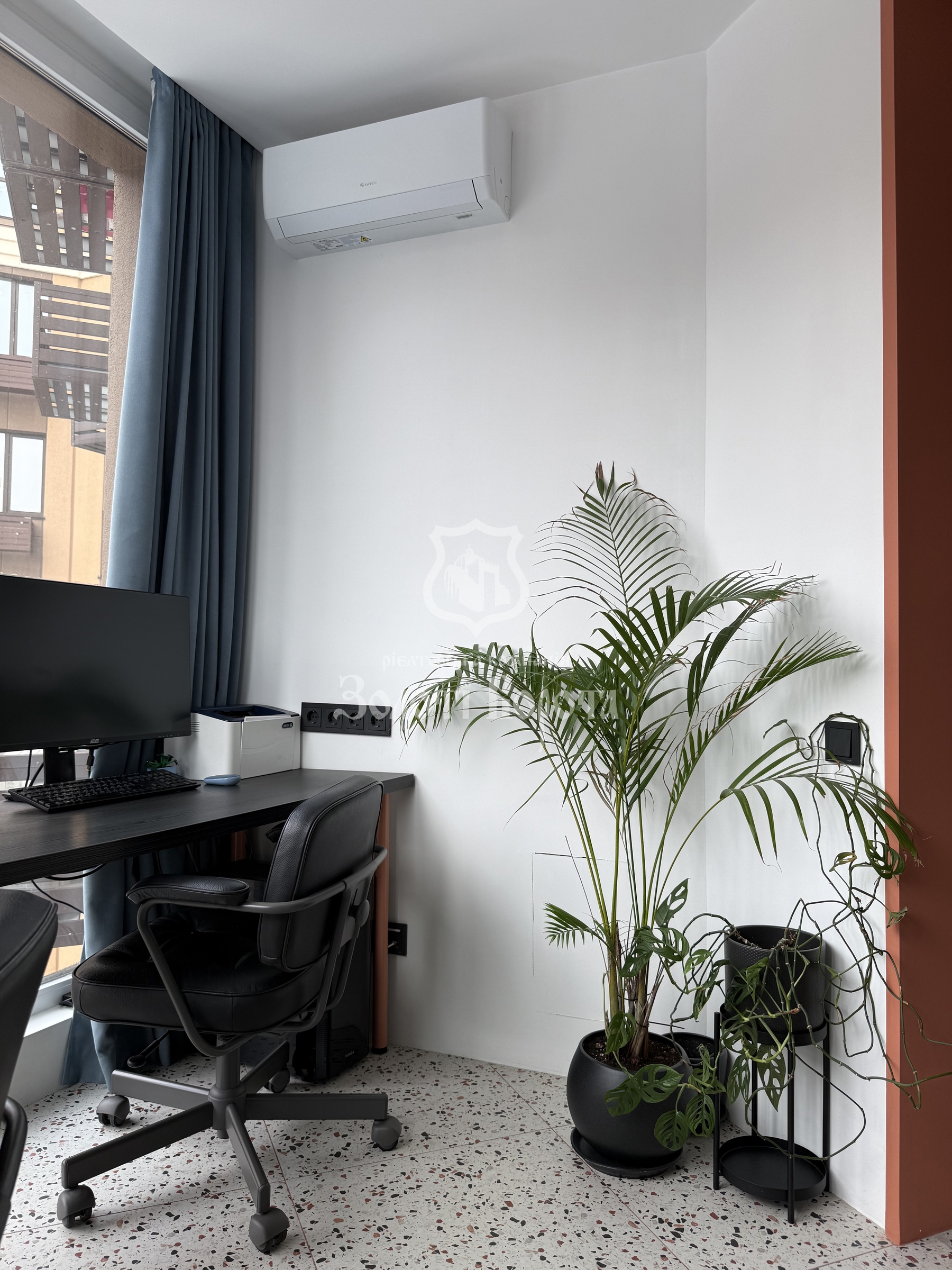Дизайн виконано за авторським проєктом у стилі Soft Memphis з елементами скандинавського мінімалізму, де кожен метр використано максимально ефективно. Простір професійно зонований: виділена спальня-вітальня з модульним диваном від Faid, простора кухня з акцентним порталом та облаштоване робоче місце для двох осіб біля панорамного вікна з кондиціонером Cooper&Hunter. Особливістю квартири є повна безбар’єрність — італійський керамограніт Terrazzo укладено єдиним контуром без порогів.
