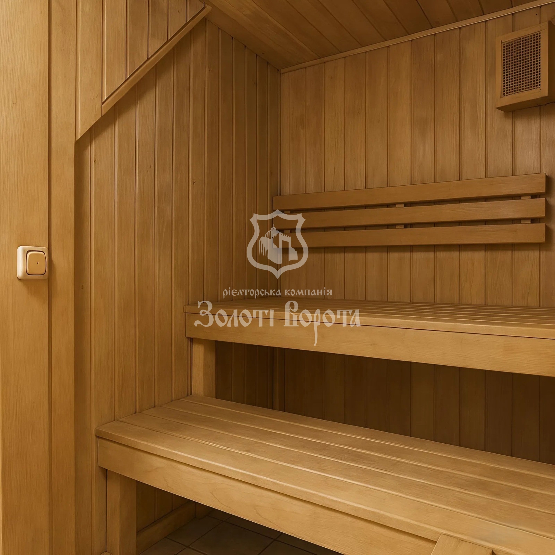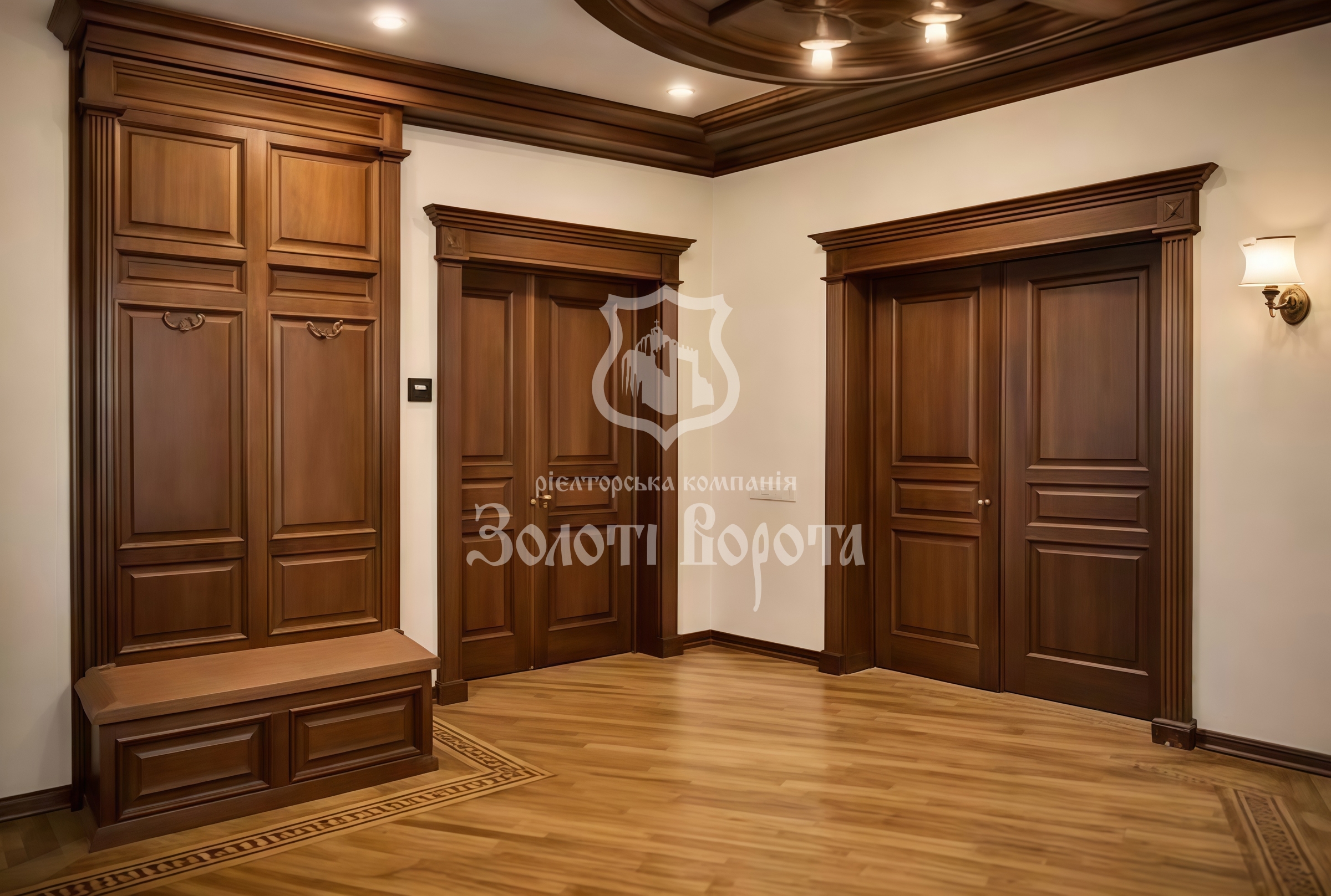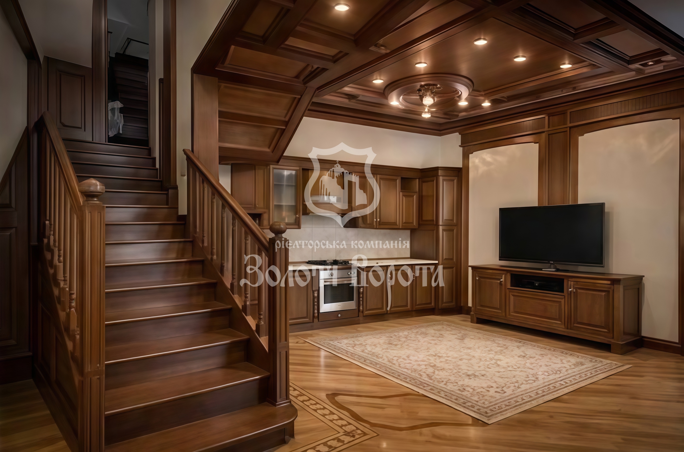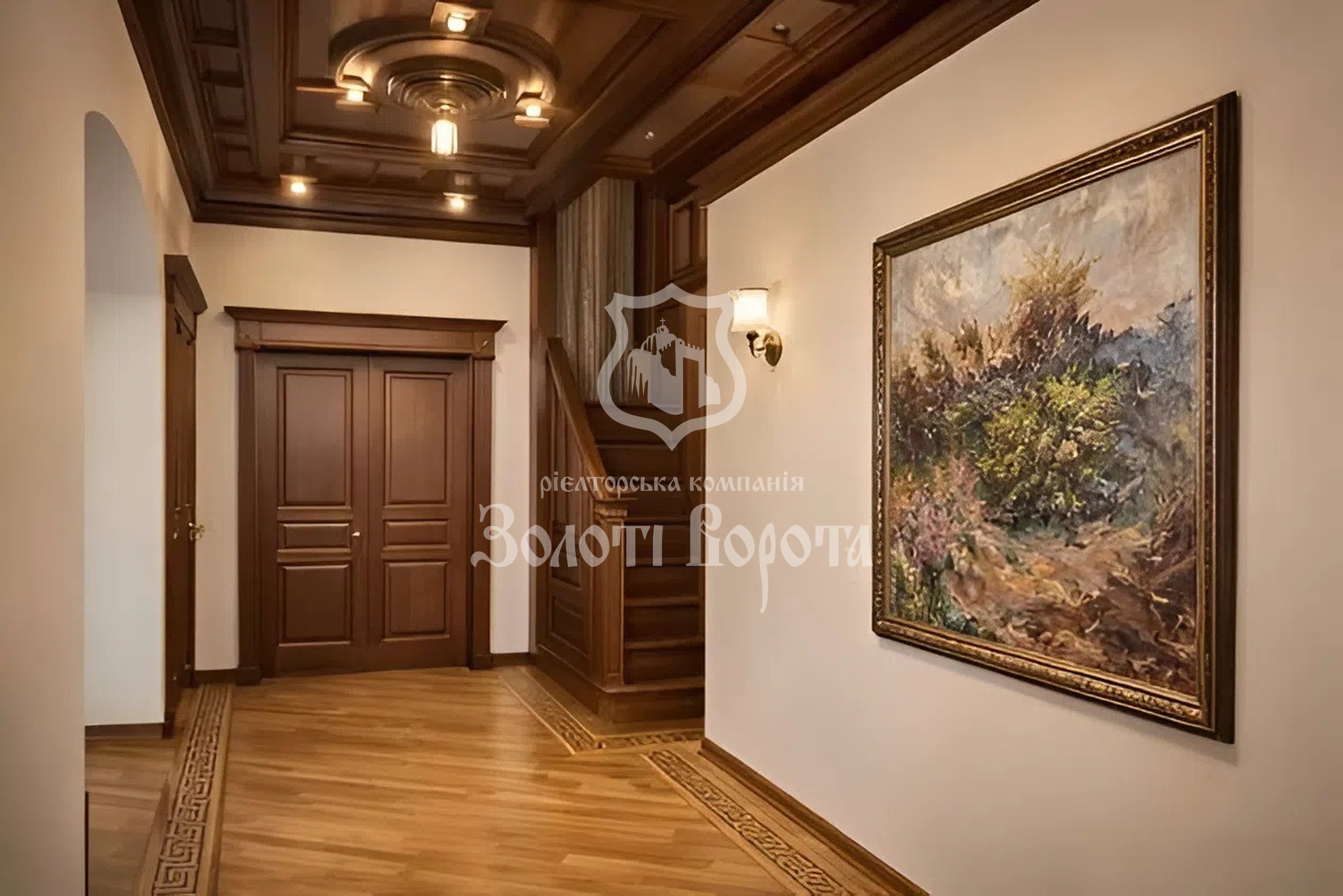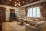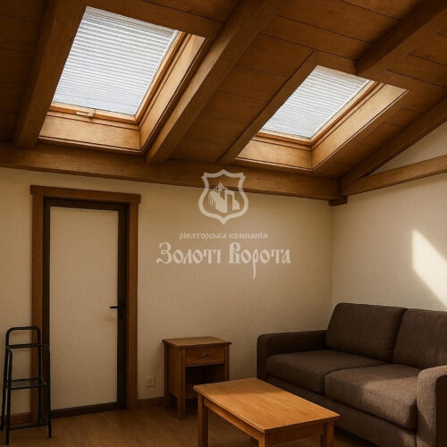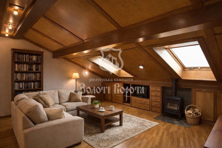 Інтер’єр виконано у витонченому класичному стилі з використанням елітних натуральних матеріалів: дубовий паркет, меблі з масиву дерева. Планування передбачає: просторий хол і кухню-вітальню на першому рівні, дві спальні та велику ванну кімнату — на другому. На третьому рівні розташована мансардна спальня в стилі лофт із власною сауною.
